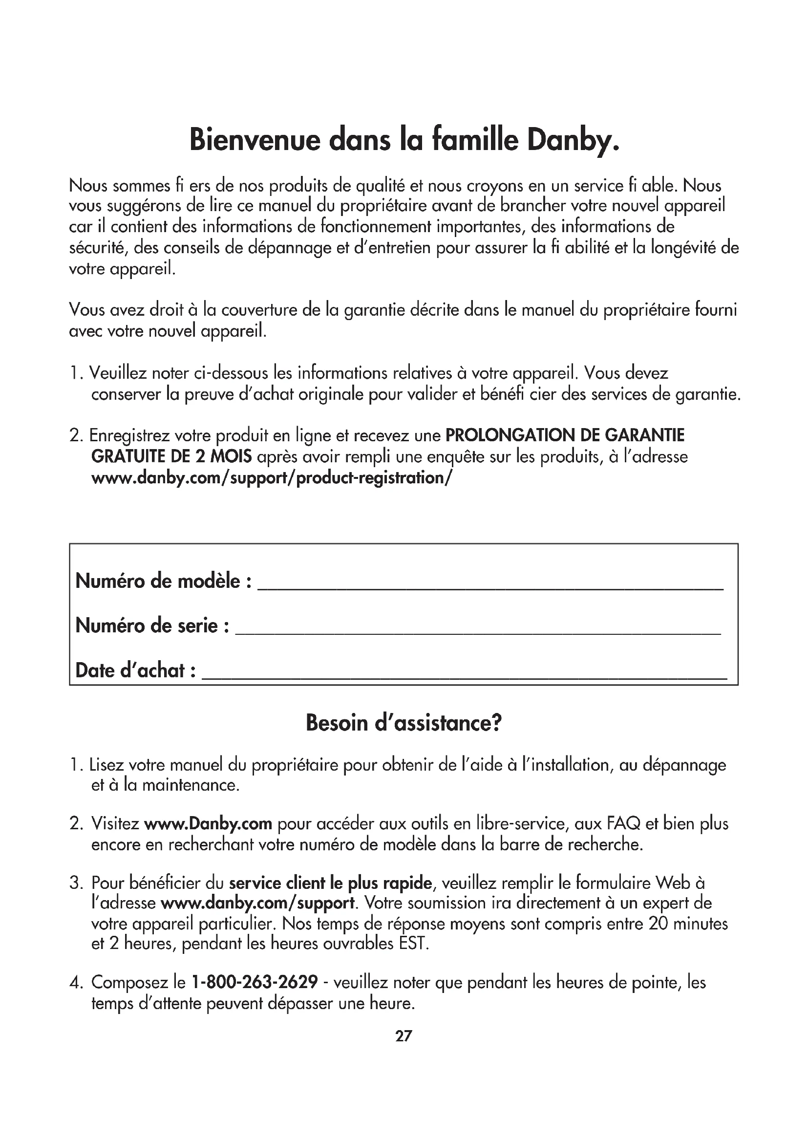 GRATUITE DE 2 MOIS après avoir rempli une enquête sur les produits, à l’adresse www.danby.com/support/product-registration/ Besoin d’assistance?