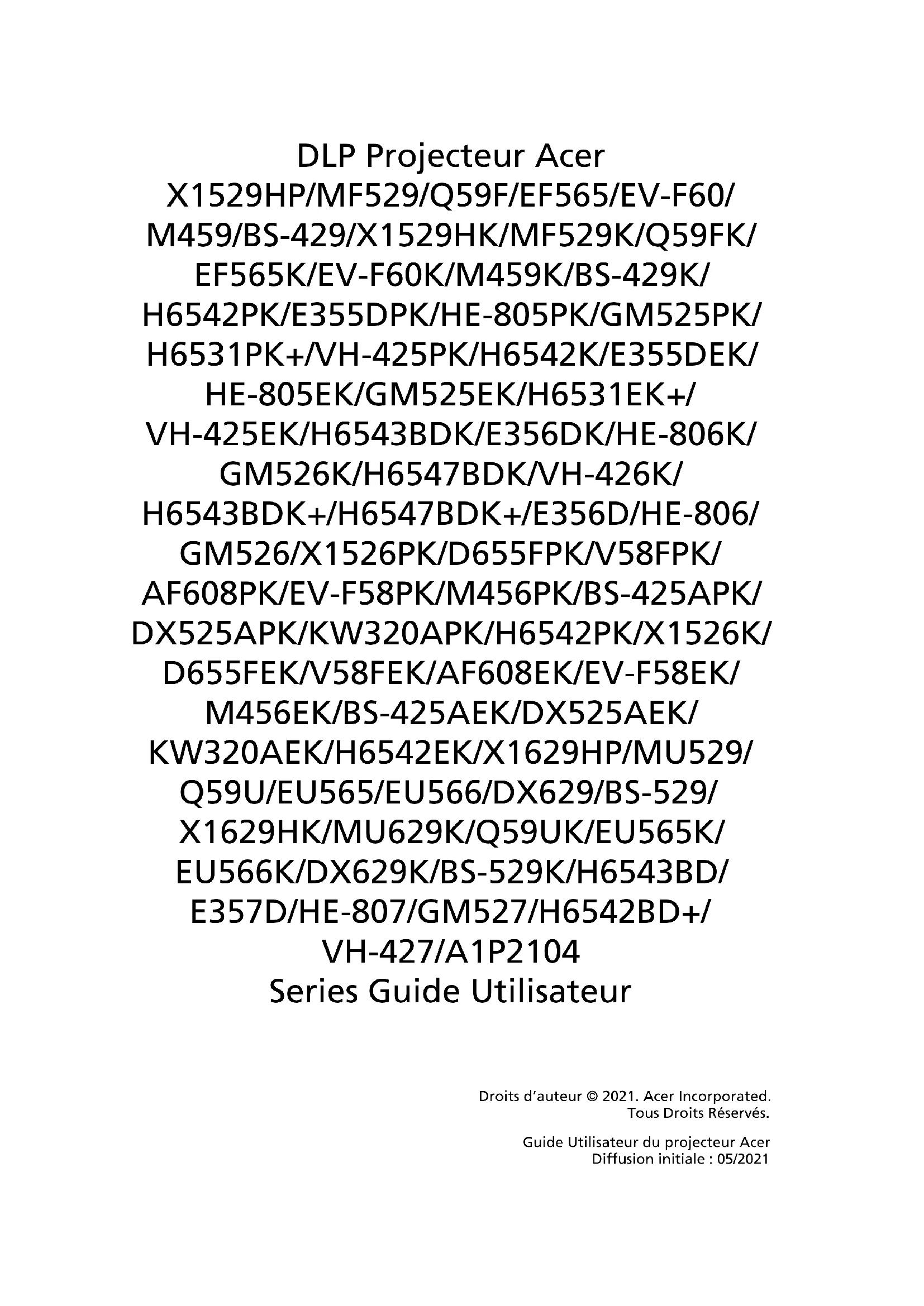 KW320AEK/H6542EK/X1629HP/MU529/ Q59U/EU565/EU566/DX629/BS-529/ X1629HK/MU629K/Q59UK/EU565K/ EU566K/DX629K/BS-529K/H6543BD/ E357D/HE-807/GM527/H6542BD+/ VH-427/A1P2104 Series Guide Utilisateur Droits d’auteur © 2021. Acer Incorporated. Tous Droits Réservés. Guide Utilisateur du projecteur Acer Diffusion initiale : 05/2021Des modifications peuvent être apportées de temps à autre aux informations contenues dans cette publication. Ces modifications seront ajoutées aux nouvelles éditions de ce manuel. La présente société ne fournit aucune espèce de garantie expresse ou implicite, relative aux informations contenues dans ce manuel et n'offre notamment aucune garantie d'aucune sorte quant à la valeur marchande de ce produit ou son adéquation à une utilisation particulière. Enregistrez le numéro de série, la date d’achat, et le numéro du modèle dans l’espace prévu ci- dessous. Le numéro de série et le numéro de modèle sont imprimés sur l’étiquette collée sur le châssis. Toutes les correspondances concernant cette unité doivent inclure ces informations. Toute reproduction, transmission, transcription ou mise en mémoire de ce manuel ou partie sur un support quelconque, par quelque procédé que ce soit, notamment, électronique, mécanique, photocopie, enregistrement, ou autre, sont interdites sans l'autorisation écrite préalable d’Acer Incorporated. Modèle : _______________________________________ No. de série : ___________________________________ Date d’achat : ___________________________________ Lieu d’achat : ____________________________________ Projecteur Acer Acer et le logo Acer sont des marques commerciales déposées par Acer Incorporated. Les noms de produits ou marques commerciales d'autres sociétés sont utilisés ici à des fins d'identification uniquement et sont la propriété de leurs détenteurs respectifs. Les termes HDMI, HDMI High-Definition Multimedia Interface, l’habillage commercial HDMI et les logos HDMI sont des marques commerciales ou des marques déposées de HDMI Licensing Administrator, Inc.iii Informations concernant votre sécurité et votre confort Lisez ces consignes attentivement. Conservez ce document pour des références ultérieures. Respectez tous les avertissements et instructions indiqués sur le produit. Eteindre le produit avant tout nettoyage Débranchez ce produit de la prise murale avant tout nettoyage. Ne pas utiliser de nettoyants liquides ou en aérosol. Utilisez un chiffon humide pour le nettoyage. Mise en garde concernant la prise lors de la déconnexion de l’appareil Observez les consignes suivantes lorsque vous connectez et déconnectez l’alimentation à une alimentation externe :
