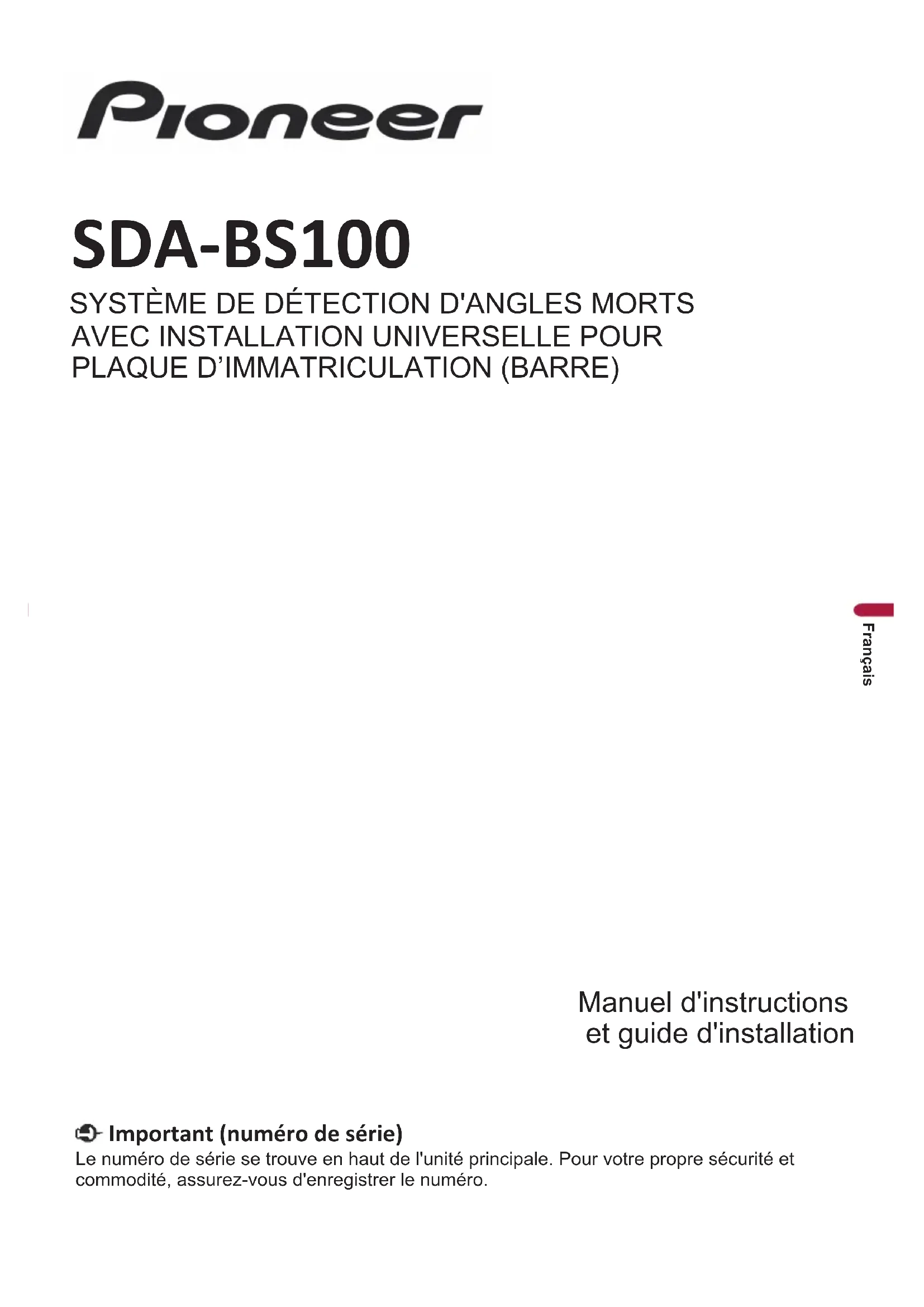 Adresse: 2050 W. 190TH STREET, SUITE 100, TORRANCE, CA 90504, U.S.A. Téléphone: 1-800-421-1404 URL: http://www.pioneerelectronics.com SYSTÈME DE DÉTECTION D'ANGLES MORTS AVEC INSTALLATIION UNIVESELLE POUR PLAQUE D’IMMATRICULATION (BARRE) Français・Conditions particulières des véhicules à considérer Pendant le démarrage et l'initialisation de l’appareil, ce dernier peut prendre jusqu'à 2 minutes pour établir une connexion GPS. Si le véhicule est conduit avant qu'une connexion GPS ne soit établie ou si la connexion GPS est interrompue (à l'intérieur d'un tunnel, d'une structure de stationnement, etc.), le système peut ne pas fonctionner correctement, produisant des avertissements incorrects ou faux ou ne pas générer d'avertissement. Une fois que la connexion GPS est établie ou rétablie, les deux témoins DEL clignotent deux fois pour indiquer que l’appareil est prêt à être utilisé. Les performances du capteur (barre) installé sur la plaque d'immatriculation peuvent être affectées si elle est installée sur un véhicule dont les éléments obstruent l'emplacement de la plaque. (ex: support à vélos, remorque). Entre-autre, le capteur ne peut être installée correctement si la plaque d'immatriculation est décalée d’un côté du véhicule et non centrée. Cet appareil peut être utilisé sur n'importe quel véhicule ayant un emplacement standard de plaque d'immatriculation mais peut être affecté par des objets métalliques pouvant bloquer ou interférer avec le fonctionnement du système. Les éléments suivants peuvent compromettre l'efficacité du système: ・Véhicule avec remorque attachée en permanence. ・Véhicule avec des obstructions métalliques devant la plaque d'immatriculation, ex: pneu de secours, supports de vélo ou équipement pour personne handicapée. ・Plaque d'immatriculation standard mais située sur le côté droit ou gauche du véhicule. (Installation centrale requise) ・Situation indétectable ・Si un véhicule dépasse votre véhicule. ・Votre véhicule se déplace plus lentement que le seuil de vitesse de détection préréglé, tel que circuler dans une congestion. ・Lorsque votre véhicule est en marche arrière et que la vitesse entre votre véhicule et les objets environnants est inférieure à 5 mph (8 km/h). ・Si un véhicule approche ou dépasse votre véhicule et que la vitesse entre votre véhicule et ce véhicule est supérieure à 50 mph (80 km/h). Par exemple, si vous roulez à une vitesse de 55mph (88 km/h), l’appareil ne peut détecter les véhicules s'approchant par l’arrière si leur vitesse est supérieure à 105 mph (169 km/h). ・Situations pouvant affecter la précision de détection de l’appareil ・Des objets métalliques sont dans la trajectoire immédiate du signal de détection. ・La météo tel qu’une forte pluie ou neige, des conditions routières avec verglas pouvant entraîner des variations de sensibilité. ・Routes de gravier, pouvant causer des interférences dues à la poussière et projection de pierres. ATTENTION Informations importantes sur la sécurité CET APPAREIL D’AIDE À LA CONDUITE A POUR FONCTION DE NOTIFIER LA PRÉSENCE D'OBSTACLES DANS LES ANGLES MORTS DU VÉHICULE. Il NE PEUT DÉTECTER TOUS LES DANGERS ET OBJETS ET N’EST PAS UN SUBSTITUT POUR VOTRE JUGEMENT ET ATTENTION. AVANT TOUTE MANOEUVRE, VÉRIFIEZ VISUELLEMENT LES DEUX CÔTÉS DU VÉHICULE POUR PLUS DE SÉCURITÉ. AVERTISSEMENT