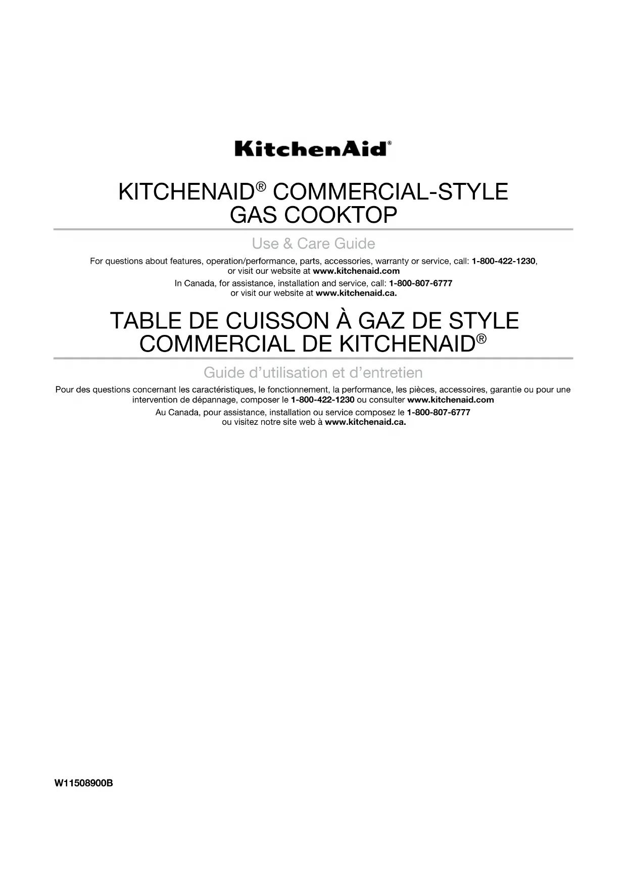 Guide d’utilisation et d’entretien Pour des questions concernant les caractéristiques, le fonctionnement, la performance, les pièces, accessoires, garantie ou pour une intervention de dépannage, composer le 1-800-422-1230 ou consulter www.kitchenaid.com Au Canada, pour assistance, installation ou service composez le 1-800-807-6777 ou visitez notre site web à www.kitchenaid.ca. W11508900B2 Table of Contents Table de matières SAFETY INFORMATION ................................................................3