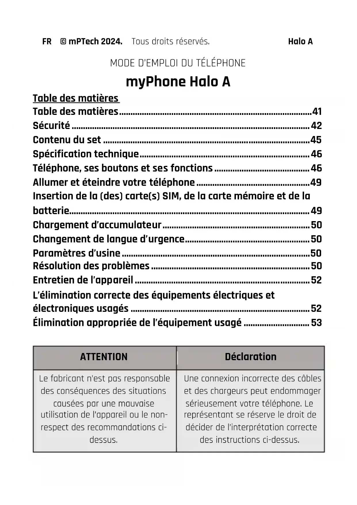 Aucune partie de ce mode d’emploi ne peut être reproduite, distribuée, traduite ou transmise sous quelque forme ou par quelque moyen que ce soit, électronique ou mécanique y compris la photocopie, l’enregistrement ou le stockage dans un système de stockage ou de récupération de l’information, sans l’autorisation écrite préalable du fabricant. Avant d’utiliser l’appareil, lisez les informations sur les précautions et le manuel d’utilisation. Les descriptions de ce mode d’emploi incluent les paramètres de téléphone par défaut. La dernière version de ce manuel est disponible sur le site Web du produit: www.myphone.pl/qr/myphone-halo-a Selon la version du logiciel installé, applications, le fournisseur de services, la carte SIM ou le pays, certaines descriptions de ce manuel peuvent ne pas correspondre aux fonctions du téléphone. Sécurité —ESSENCERIES— Éteignez votre téléphone portable lorsque vous faites le plein à la station-service et ne l’utilisez pas à proximité de produits chimiques. ATTENTION! Dans les endroits où il y a un risque d’explosion (stations-service, usines chimiques, etc.), il est conseillé d’éteindre le téléphone. Familiarisez-vous avec les réglementations concernant l’utilisation d’équipements GSM dans ces lieux. —APPELS D’URGENCE—FR © mPTech 2024. Tous droits réservés. Halo A Il se peut que vous ne soyez pas en mesure de faire des appels d’urgence à partir de votre téléphone dans toutes les régions ou dans toutes les circonstances. Il est recommandé de trouver un autre moyen d’avertir les services d’urgence en cas de départ dans ces zones. —SERVICE PROFESSIONNEL— Ce produit ne peut être réparé que par le personnel de service qualifié du fabricant ou par un centre de service agréé. La réparation de l’appareil par un service non qualifié ou non autorisé peut entraîner des dommages à l’appareil et la perte de la garantie. —LES PERSONNES HANDICAPÉES PHYSIQUES OU MENTALES ET LES ENFANTS— L’appareil ne doit pas être utilisé par des personnes (y compris des enfants) ayant des capacités physiques ou mentales limitées, ou par des personnes qui n’ont pas l’expérience de l’utilisation de l’équipement électronique. Ils ne peuvent l’utiliser que sous la surveillance des personnes responsables de leur sécurité. L’appareil n’est pas un jouet. La carte mémoire et la carte SIM sont si petites qu’elles peuvent être avalées par votre enfant ou provoquer un étouffement. Gardez l’appareil et ses accessoires hors de portée des enfants.
