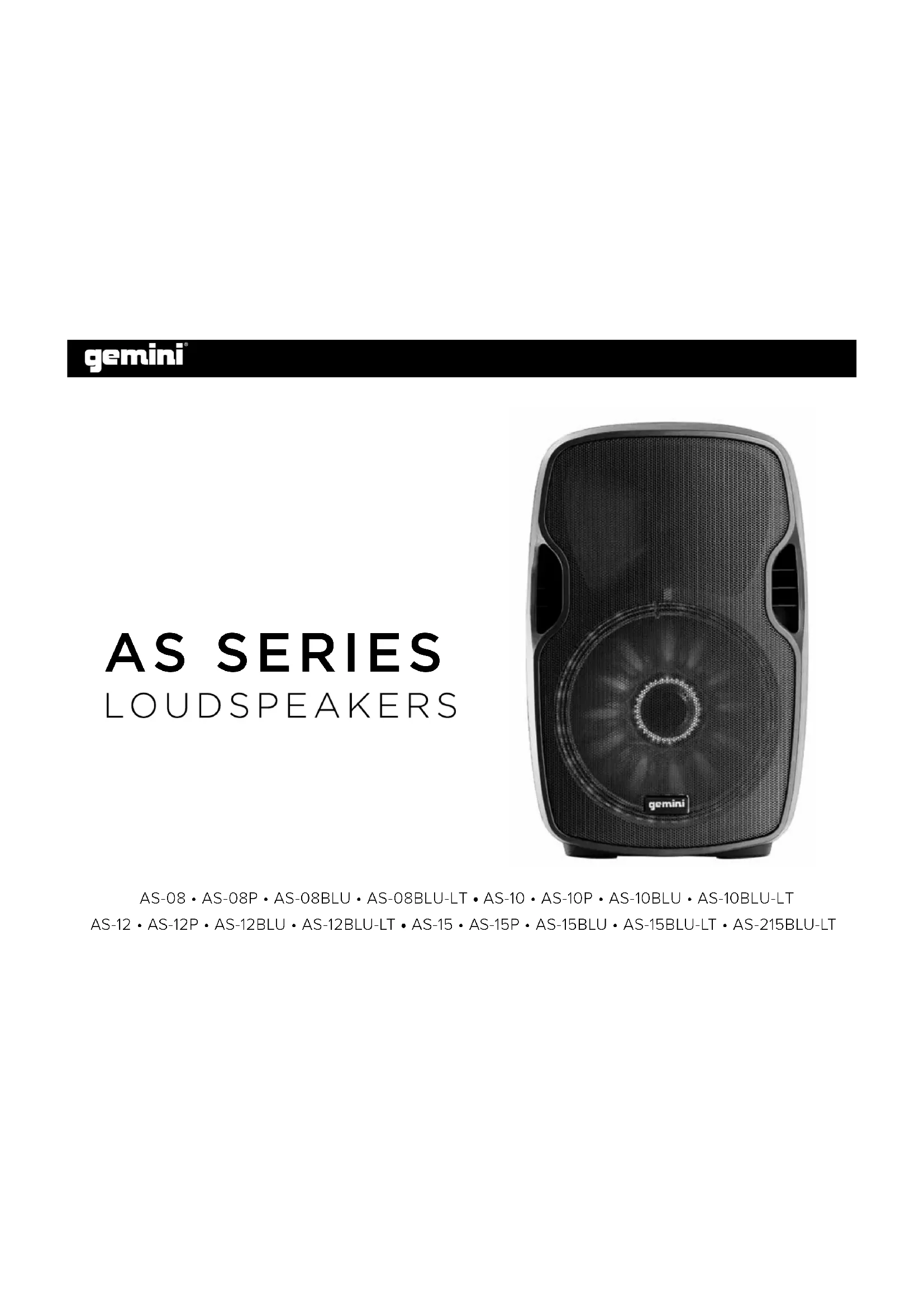 TROLES O INTERRUPTORES. CONEXIONES ¡POR FAVOR ES MUY IMPORTANTE QUE SE ASEGURE QUE LA POTENCIA DE SU AM- PLIFICADOR COINCIDE CON LA POTENCIA ACEPTADA POR EL ALTAVOZ! (Asegúrese que su equipo está totalmente APAGADO y también que los controles de VOLUMEN, NIVEL y GANANCIA estén bajados del TODO antes de conectar el altavoz.) INTRODUCTION Merci d’avoir choisi le Gemini AS SERIES Loudspeaker. Nous savons que les produits Gemini vous simplieront la vie grâce aux dernières avancées technologiques auxquelles ils font appel pour la connectivité inter plates-formes et la reproduction sonore, mais nous savons également que ces équipements sont devenus la norme en terme de produits DJ et audio professionnels. Avec un entretien approprié, cet appareil fonctionnera sans souci pendant de très nombreuses années. Tous les produits Gemini sont garantis 1 an*. PREMIERE UTILISATION Vériez la présence des accessoires suivants, livrés avec le AS SERIES Loudspeaker : (1) Cordon secteur (1) Mode d’emploi (1) Carte de garantie