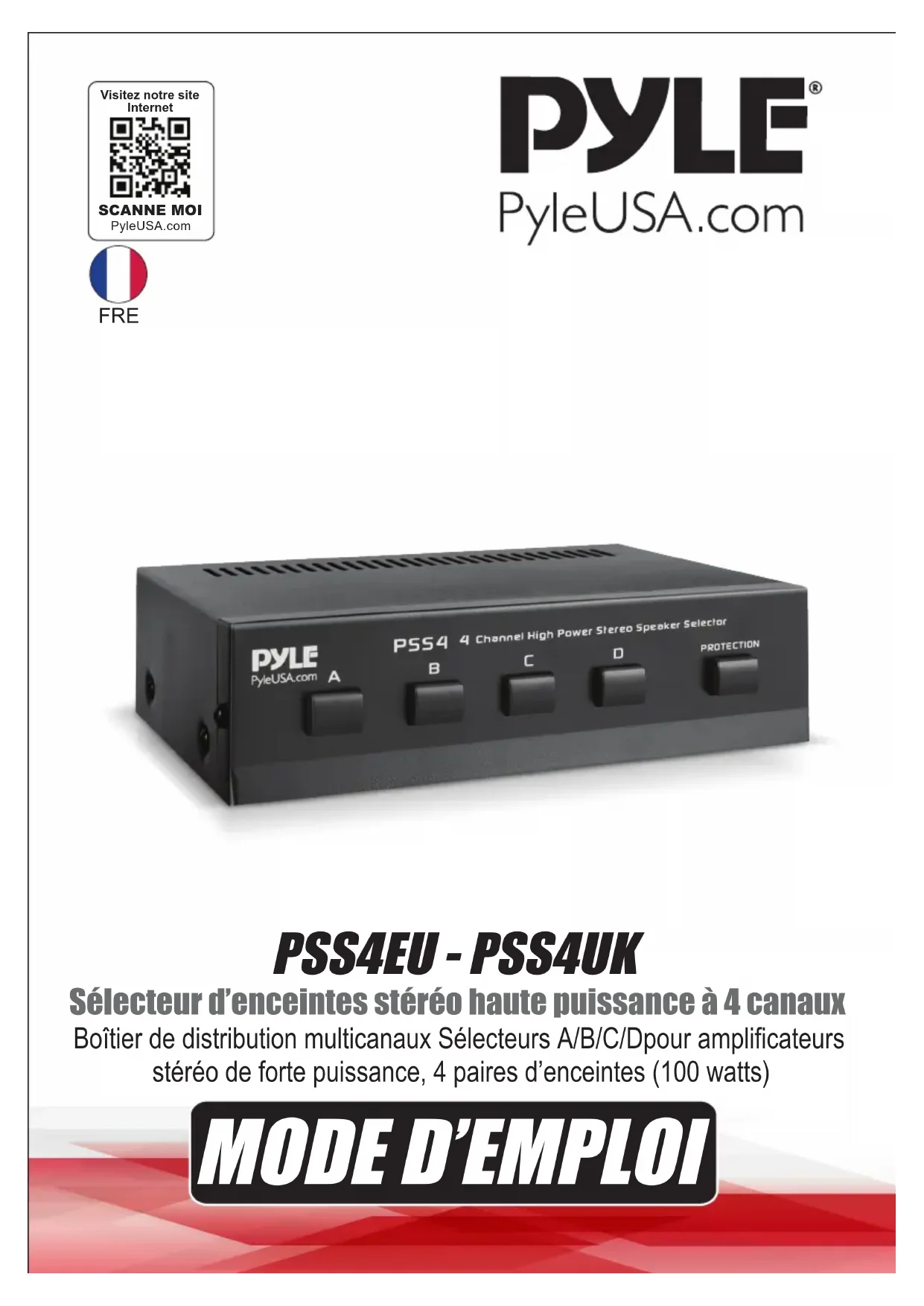 Visitez notre siteInternetSCANNE MOIPyleUSA.com FREÀ propos de PyleUSA Fondée dans les années 1960, Pyle est devenue un fabricant renommé de woofers avancés et de haute qualité. Notre aventure a commencé avec le célèbre Pyle Driver, qui est rapidement devenu un nom incon- tournable dans le domaine des haut-parleurs d'origine. À la n du 20e siècle, nous avons élargi notre gamme pour inclure des haut-parleurs de remplacement, des équipements audios pour voiture, audio domestique, audio marin ainsi que des instruments de musique et équipements audio professionnels sous la marque Pyle Pro. Pyle Car: Transformez votre voiture en un environnement d'écoute parfait grâce à nos haut-parleurs, amplicateurs et unités principales à des prix compétitifs. Améliorez les haut-parleurs d'usine pour une meilleure expérience musicale. Découvrez également nos accessoires comme les systèmes de navigation, lecteurs DVD, interfaces iPod et caméras axées sur la sécurité. Pyle Home: Explorez une gamme de produits pour le divertissement à domicile, y compris des projecteurs, téléviseurs, supports, et technologies HD. Pyle Home propose également des mini haut-parleurs à basses améliorées, des casques, des tourne-disques vintages, des amplicateurs de puissance, des haut-parleurs à pavillon et bien plus encore pour une expérience multimédia enrichie, que ce soit à la maison ou en déplacement. Pyle Pro: En tant que leader mondial des équipements audio, Pyle Pro répond aux besoins des musiciens, ingénieurs de studio et amateurs. Nos systèmes de sonorisation, équipés de microphones sans l, batteries rechargeables et stations d'accueil pour iPod/iPhone, sont idéaux pour divers événements. Découvrez notre nouvelle gamme de guitares, pédales d'eet et conver- tisseurs USB-analogique, le tout sans jamais compromettre la qualité. www.PyleUSA.com 2Boutons de borne Boutons de protection Le PSS4 permet de connecter jusqu'à quatre paires d'enceintes distinctes à l'amplicateur/récepteur stéréo. Le centre de contrôle est particulièrement pratique si vous avez des enceintes dans diérentes pièces et vous souhaitez les allumer et les éteindre indépendamment les uns des autres. Vous pouvez écouter sur plusieurs paires d’enceintes en même temps. Le centre de contrôle permet d'utiliser un à quatre ensembles d'enceintes à la fois et est conçu pour fonctionner avec un récepteur/amplicateur stéréo d'une puissance maximale de 50 watts par canal et des enceintes d'une impédance minimale de 8 ohms (voir "Tableau des impédances" à la page 5). INSTALLATION
