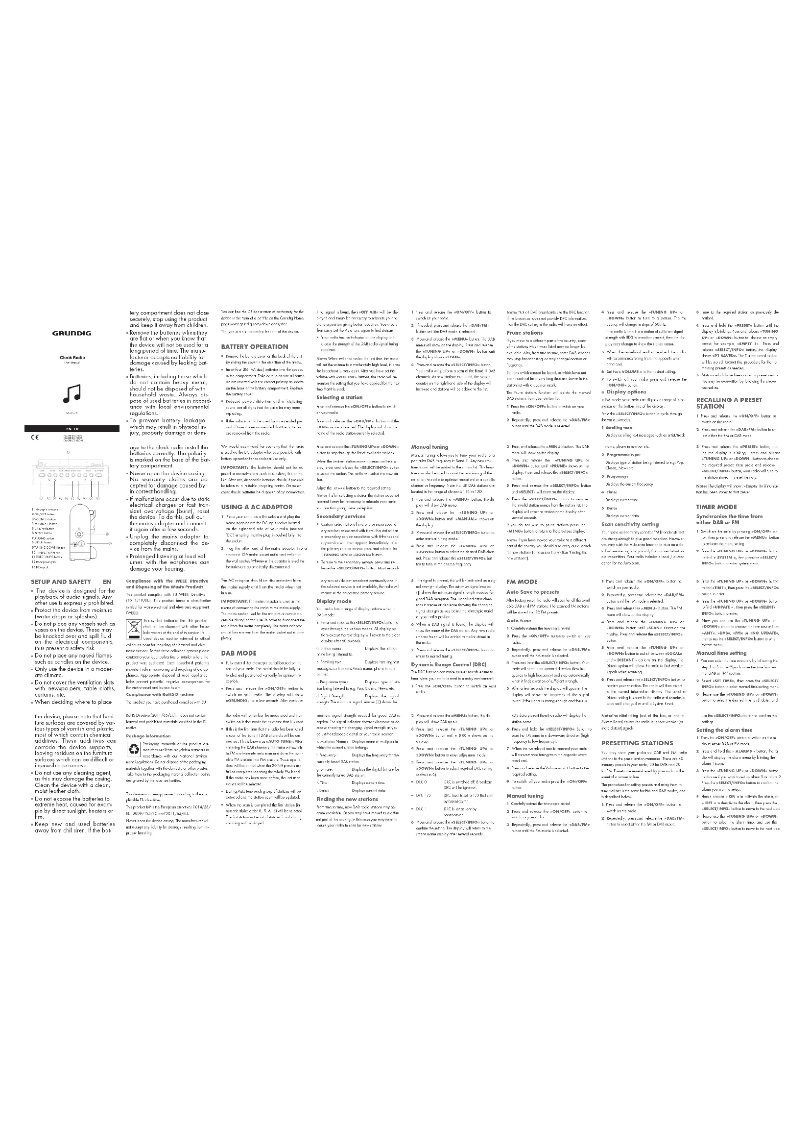Une écoute prolongée à volume élevé avec les écouteurs peut en- dommager votre audition. Conformité à la Directive DEEE et mise au re-but des appareils usagés : Ce produit est conforme à la directive européenne DEEE (2012/19/UE). Ce produit porte un symbole de classification pour les déchets d’équipements électriques et électroniques (DEEE).Ce symbole indique que ce produit ne doit pas être éliminé avec d’autres dé- chets ménagers en fin de vie. Le dispositif usagé doit être retourné au point de col-lecte officiel pour le recyclage des appareils électr-iques et électroniques. Pour trouver ces points de col-lecte, contacter les autorités locales ou le revendeur où le produit a été acheté. Chaque foyer joue un rôle important dans la récupération et le recyclage d’un vieil appareil. Une élimination appropriée de l’appareil usagé empêche des conséquences poten-tiellement négatives pour l’environnement et la santé humaine.Conformité à la directive RoHSLe produit que vous avez acheté est conforme à la Directive RoHS de l’UE (2011/65/EU). Il ne contient pas de matières dangereuses et interdites spécifiées dans la Directive.Informations relatives aux emballagesLes matériaux d’emballage du produit sont fabriqués à partir de matériaux recy-clables conformément à nos réglementa-tions environnementales nationales. Ne pas jeter les matériaux d’emballage avec les déchets domes-tiques et autres déchets. Les déposer dans un des points de collecte d’éléments d’emballage indiqué par les autorités locales.Données techniques Cet appareil est dénué de tout parasite conformé-ment aux directives de l’UE en vigueur.Ce produit est conforme aux directives européennes 2014/53/EU,2009/125/EC,2011/65/EU.Ne jamais ouvrir le boîtier de l’appareil. Le fabricant décline toute responsabilité en cas de dégâts dus à une utilisation incorrecte.Vous trouverez la déclaration CE de conformité de l’appareil au format PDF sur la page d’accueil de Grundig www.grundig.com/downloads/doc. L’étiquette est apposée sur la face arrière de l’appareil. FONCTIONNEMENT AVEC PILES