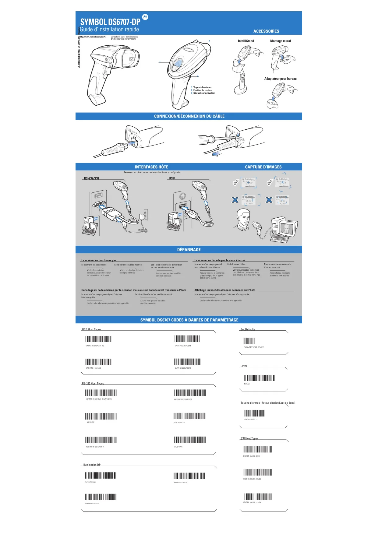 DÉBIT EN BAUDS : 9 600DÉBIT EN BAUDS : 38 400DÉBIT EN BAUDS : 115 200 IntelliStand Adaptateur pour bureau Montage mural ACCESSOIRES Assurez-vous que tous les câblessont bien connectésLire les codes à barres des paramètres hôte appropriésAssurez-vous que tous les câblessont bien connectésLire les codes à barres des paramètres hôte appropriésSNAPI AVEC IMAGERIESNAPI SANS IMAGERIE<DATA><SUFFIX 1>ACTIVER RS-232 (PAS DE VARIANTE)ICL RS-232NIXDORF RS-232 MODE ANIXDORF RS-232 MODE BFUJITSU RS-232OPOS/JPOSNIVEAU Illumination DP Illumination autoIllumination directeIllumination indirecte Touche d'entrée (Retour chariot/Saut de ligne) USB Host Types Set Defaults RS-232 Host Types Level SSI Host TypesDS6707 PosterBLACKPANTONE 285http://www.motorola.com/ds6707PerforationPerforation