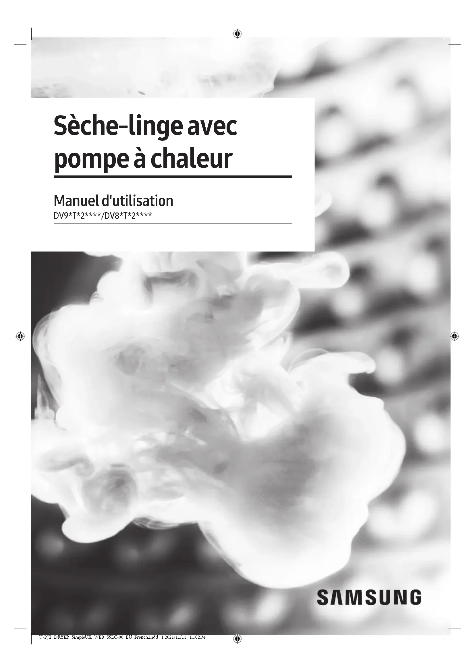 Sèche-linge avec pompe à chaleur Manuel d'utilisation DV9*T*2****/DV8*T*2**** U-PJT_DRYER_SimpleUX_WEB_SSEC-00_EU_French.indd 1 2021/11/11 11:02:34Français Français2 Sommaire Consignes de sécurité 4 Remarques importantes sur les consignes de sécurité 4 Symboles de sécurité importants 4 Consignes de sécurité importantes 5 Avertissements importants concernant l'installation 7 Avertissements importants concernant l'utilisation 9 Mises en garde concernant l'utilisation 10 Avertissements importants concernant le nettoyage 11 Entretien pour éviter la formation de gel 11 Instructions concernant les déchets DEEE 12 Installation 13 Ce qui est inclus 13 Conditions d'installation 15 Installation étape par étape 16 Inversion du hublot 20 Avant de commencer 25 Configuration initiale 25 Consignes de séchage 26 Opérations 28 Panneau de commande 28 Lancement d'un cycle 30 Présentation des cycles 31 Appuyez pour afficher les fonctions aditionnelles 34 Fonctions système 36 Fonctions spéciales 38 Maintenance 43 Vidage du réservoir d'eau 43 Nettoyage 44 Dépannage 48 Contrôles 48 Codes d'information 50 U-PJT_DRYER_SimpleUX_WEB_SSEC-00_EU_French.indd 2 2021/11/11 11:02:34Français Français 3