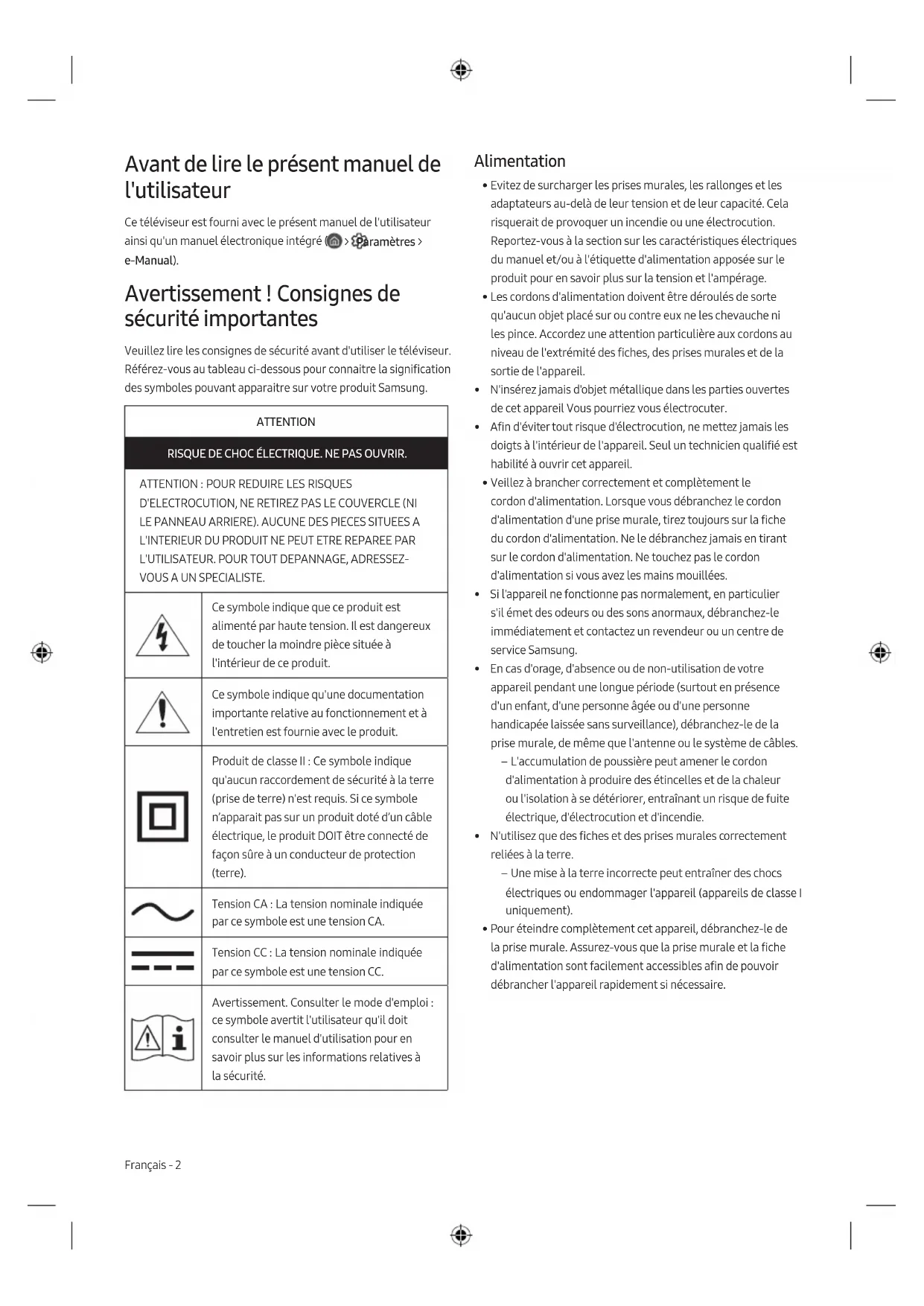 - Le montant des frais d'administration vous sera communiqué avant la visite du technicien. Samsung ne saurait être tenu responsable en cas d'endommagement du produit suite à une réparation effectuée par un fournisseur de services non agréé ou encore par le client lui-même. Samsung décline toute responsabilité en cas d'endommagement du produit, de blessures ou autre problème de sécurité résultant d'une ouverture du produit par un tiers en mépris des consignes de réparation et d'entretien. Toute dommage causé lors d'une tentative de réparation par un tiers autre qu'un prestataire agréé par SAMSUNG ne saurait être couvert par la garantie. Rendez-vous sur samsung.com/support pour plus d’informations surles adaptateurs électriques et les télécommandes en conformité avec la Directive Européenne ErP – Energy related Products Français - 6* Les schémas et illustrations contenus dans ce manuel d'utilisation sont fournis uniquement à titre de référence. L'aspect réel du produit peut être différent. La conception et les spécifications du produit sont susceptibles d'être modifiées sans préavis. Réduction de la consommation d'énergie Lorsque vous éteignez le téléviseur, il passe en mode veille. En mode veille, le téléviseur continue à consommer une petite quantité de courant. Pour réduire la consommation d'énergie, débranchez le cordon d'alimentation lorsque vous prévoyez de ne pas utiliser le téléviseur pendant une période prolongée. Licences The terms HDMI and HDMI High-Definition Multimedia Interface, and the HDMI Logo are trademarks or registered trademarks of HDMI Licensing LLC in the United States and other countries. Par la présente, Samsung déclare que cet équipement radio est conforme à la Directive 2014/53/UE et aux exigences réglementaires pertinentes du Royaume-Uni. Le texte complet de la déclaration de conformité est disponible ici: http://www.samsung.com, sélectionnez Assistance et entrez le nom du modèle. Cet équipement peut fonctionner dans tous les pays de l'UE et au Royaume-Uni. La fonction WLAN 5GHz (Wi-Fi) de cet équipement ne peut être utilisée qu'en intérieur. Puissance de transmission BT max.: 100mW à 2,4GHz – 2,4835GHz Puissance de transmission Wi-Fi max.: 100mW à 2,4GHz- 2,4835GHz, 200mW à 5,15GHz-5,25GHz, 100mW à 5,25GHz- 5,35GHz & 5,47GHz - 5,725GHz Instructions de mise au rebut de ce produit (déchets d'équipements électriques et électroniques) (Applicable dans les pays pratiquant la collecte sélective de déchets) Ce symbole présent sur le produit, ses accessoires ou sa documentation indique que ni le produit, ni ses accessoires électroniques usagés (chargeur, casque audio, câble USB, etc.) ne peuvent être jetés avec les autres déchets ménagers. La mise au rebut incontrôlée des déchets présentant des risques pour l'environnement et la santé publique, veuillez séparer vos produits et accessoires usagés des autres déchets. Vous favoriserez ainsi le recyclage de la matière qui les compose dans le cadre d'un développement durable. Les particuliers sont invités à contacter le magasin leur ayant vendu le produit ou à se renseigner auprès des autorités locales pour connaître les procédures et les points de collecte de ces produits en vue de leur recyclage. Les utilisateurs professionnels doivent contacter leur fournisseur et consulter les conditions générales du contrat d'achat. Ce produit et ses accessoires ne peuvent être jetés avec les autres déchets professionnels et commerciaux. Elimination des piles de ce produit (Applicable dans les pays pratiquant la collecte sélective de déchets) Le symbole présent sur le manuel, l'emballage ou les piles indique que celles-ci ne doivent pas être éliminées en fin de vie avec les autres déchets ménagers. Le cas échéant, les symboles chimiques Hg, Cd ou Pb signifient que la pile contient du mercure, du cadmium ou du plomb à des niveaux supérieurs aux niveaux de référence indiqués dans la directive CE 2006/66. Si les piles ne sont pas correctement éliminées, ces substances peuvent causer des dommages à la santé humaine ou l'environnement. Afin de protéger les ressources naturelles et de favoriser la réutilisation du matériel, veillez à séparer les piles des autres types de déchets et à les recycler via votre système local de collecte gratuite des piles et accumulateurs. Français - 7 FrançaisAntes de leer este manual del usuario El televisor se suministra con este Manual del usuario y un e-Manual integrado ( > Configuración > e-Manual). ¡Advertencia! Instrucciones importantes de seguridad Lea las instrucciones de seguridad antes de utilizar el televisor. Consulte la tabla a continuación para obtener una explicación de los símbolos que pueden aparecer en su producto Samsung. PRECAUCIÓN PELIGRO DE DESCARGA ELÉCTRICA. NO ABRIR. PRECAUCIÓN: PARA REDUCIR EL PELIGRO DE DESCARGA ELÉCTRICA, NO RETIRE LA CUBIERTA. NO HAY PIEZAS EN EL INTERIOR QUE PUEDA REPARAR EL USUARIO.