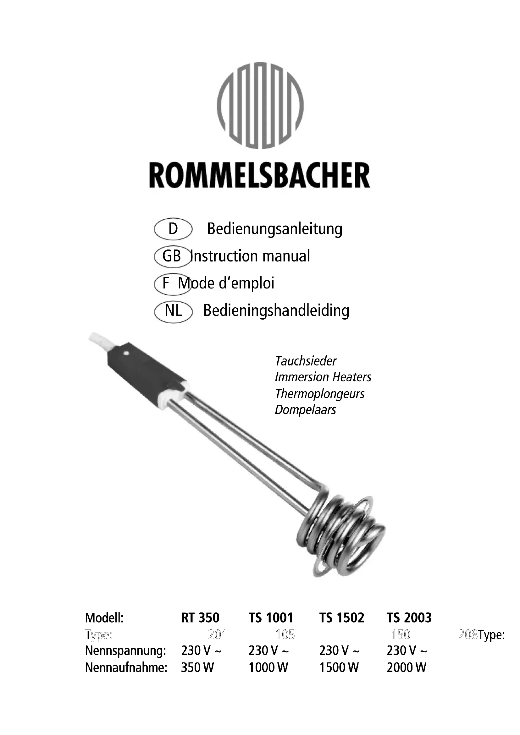 - Do not put the hot appliance on fl ammable or sensitive surfaces. Always let the appliance cool down before being put away!11 Total length heating tube Water level MAX Water level MIN Cleaning and maintenance ATTENTION: Hazard of injury and burns! Before cleaning, always unplug the appliance and let it cool down! There is no need for a special cleaning and maintenance. If required, the appliance can be wiped with a moist cloth. Descaling Depending on the water hardness, lime scale might form around the heating coil. It must be re- moved from time to time by heating some water with vinegar or by using a customary descaling agent. This will save energy, grant full heating power and a long life-time as well. Thick lime scale might cause an overheating of the appliance. Damages caused by lime scale are not covered by the warranty. This is why a regular descaling is recommended. Please observe the country-specifi c disposal regulations! Model RT 350 type 201 TS 1001 type 105 TS 1502 type 150 TS 2003 type 208 Total length heating tube, ca. 110 mm 195 mm 200 mm 350 mm Water level MAX, ca. 95 mm 160 mm 165 mm 275 mm Water level MIN, ca. 70 mm 100 mm 100 mm 200 mm In general immersion heaters may only be used for heating water. They must not be used for heating oil or other liquids.12 Pour votre sécurité Merci bien pour opter pour ce thermoplongeur en acier inoxydable. Afi n que vous preniez beaucoup de plaisir à utiliser votre nouvel appareil, nous vous conseillons de lire et suivre les instructions suivantes. Veuillez bien garder ce mode d’emploi et le transmettre au prochain utilisateur. Merci. Utilisation conforme Cet appareil est pour chauffer d’eau. Il est conçu pour l’utilisation à la maison et dans des zones similaires comme par exemple: - dans les cuisines pour employées aux magasins, aux bureaux et dans autres zones des petites entreprises, - dans les exploitations agricoles, - par des clients d’hôtels, motels, chambres d’hôtes et dans des environnements de vie similaires. Autres utilisation ou modifi cations de l’appareil sont considérées non-conformes et peuvent être source de graves dangers. Cet appareil ne convient pas pour un usage commercial. Le fabricant décline toute responsabilité pour les dégâts issus d’une utilisation non-conformes. Immédiatement après le déballage, vérifi ez si le contenu de la livraison est complet et si le produit et tous les accessoires sont en parfait état. Ne raccorder qu‘à une prise de courante de terre usuelle, installée en règle. S‘assurer que la tension du secteur correspond à celle marquée sur la plaque signalétique de l‘appareil. Ne raccorder qu‘au courant alternatif. Introduction