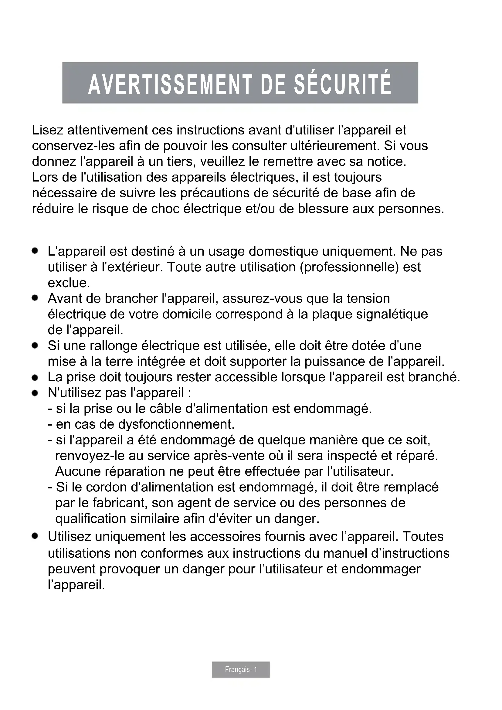 Lisez attentivement ces instructions avant d'utiliser l'appareil et conservez-les afin de pouvoir les consulter ultérieurement. Si vous donnez l'appareil à un tiers, veuillez le remettre avec sa notice. Lors de l'utilisation des appareils électriques, il est toujours nécessaire de suivre les précautions de sécurité de base afin de réduire le risque de choc électrique et/ou de blessure aux personnes. L'appareil est destiné à un usage domestique uniquement. Ne pas utiliser à l'extérieur. Toute autre utilisation (professionnelle) est exclue. Avant de brancher l'appareil, assurez-vous que la tension électrique de votre domicile correspond à la plaque signalétique de l'appareil. Si une rallonge électrique est utilisée, elle doit être dotée d'une mise à la terre intégrée et doit supporter la puissance de l'appareil. La prise doit toujours rester accessible lorsque l'appareil est branché. N'utilisez pas l'appareil : - si la prise ou le câble d'alimentation est endommagé. - en cas de dysfonctionnement. - si l'appareil a été endommagé de quelque manière que ce soit, renvoyez-le au service après-vente où il sera inspecté et réparé. Aucune réparation ne peut être effectuée par l'utilisateur. - Si le cordon d'alimentation est endommagé, il doit être remplacé par le fabricant, son agent de service ou des personnes de qualification similaire afin d'éviter un danger. Utilisez uniquement les accessoires fournis avec l’appareil. Toutes utilisations non conformes aux instructions du manuel d’instructions peuvent provoquer un danger pour l’utilisateur et endommager l’appareil.ATTENTION : les surfaces accessibles peuvent devenir très chaudes pendant le fonctionnement de l'appareil. Ne touchez jamais les parties métalliques très chaudes lors de l'utilisation : vous risquez de vous brûler ! La surface de l'élément chauffant présente une chaleur résiduelle après utilisation. - Ne laissez jamais votre appareil dans un endroit humide. - Ne manipulez pas l'appareil ou le câble d'alimentation avec les mains mouillées. - Débranchez toujours votre appareil après chaque utilisation et avant de le nettoyer et de le ranger. - Ne déplacez pas l'appareil lorsqu'il fonctionne. - Lorsque vous devez débrancher le câble d'alimentation, tirez toujours sur la fiche mais ne tirez pas sur le câble lui-même. - Ne laissez jamais l'appareil fonctionner sans surveillance. - Cet appareil ne doit pas être immergé. - Ne placez pas cet appareil à proximité d'une source de chaleur telle qu'un four à gaz ou électrique ou tout autre appareil produisant de la chaleur. Les appareils peuvent être utilisés par des personnes dont les capacités physiques, sensorielles ou mentales sont réduites ou qui manquent d'expérience et de connaissances, si elles sont surveillées, si elles ont reçu les instructions sur l'utilisation de l'appareil en toute sécurité et si elles ont conscience des dangers encourus - Les enfants ne doivent pas jouer avec l'appareil. - Cet appareil peut être utilisé par des enfants âgés de 8 ans et plus s'ils ont reçu une supervision ou des instructions concernant l'utilisation de l'appareil en toute sécurité et s'ils comprennent les risques encourus. Le nettoyage et l'entretien par l'utilisateur ne doivent pas être effectués par des enfants à moins qu'ils aient plus de 8 ans et qu'ils soient surveillés. Gardez l'appareil et son cordon hors de portée des enfants de moins de 8 ans. Français- 2- Ne touchez pas les surfaces pendant l'utilisation et ne laissez pas le câble d'alimentation entrer en contact avec les surfaces chaudes de l'appareil. - N'utilisez pas l'appareil comme chauffage d'appoint. - Placez toujours l'appareil sur une surface plane, stable et résistanteà la chaleur. - Ne posez jamais votre appareil sur un support fragile (meuble vitré, table en verre...) ou un support souple et résistant à la chaleur. - N'utilisez pas l'appareil sous une armoire murale ou à proximité de produits inflammables ou de matériaux inflammables (papier, carton, etc.). - Laissez un minimum de 15 cm d'espace libre autour de l'appareil lorsqu'il fonctionne. - Ne couvrez jamais l'appareil avec du papier d'aluminium et ne placez jamais de plats, assiettes, etc. sur la surface de cuisson. - Utilisez uniquement les accessoires fournis avec cet appareil. Toute mauvaise utilisation ou non-respect de cette instruction peut entraîner un danger pour l'utilisateur et endommager l'appareil. - Débranchez toujours l'appareil de l'alimentation s'il est laissé sans surveillance et avant le montage, le démontage ou le nettoyage. - Pour nettoyer les surfaces en contact avec les aliments, veuillez vous référer à la section "NETTOYAGE ET ENTRETIEN". Français- 30