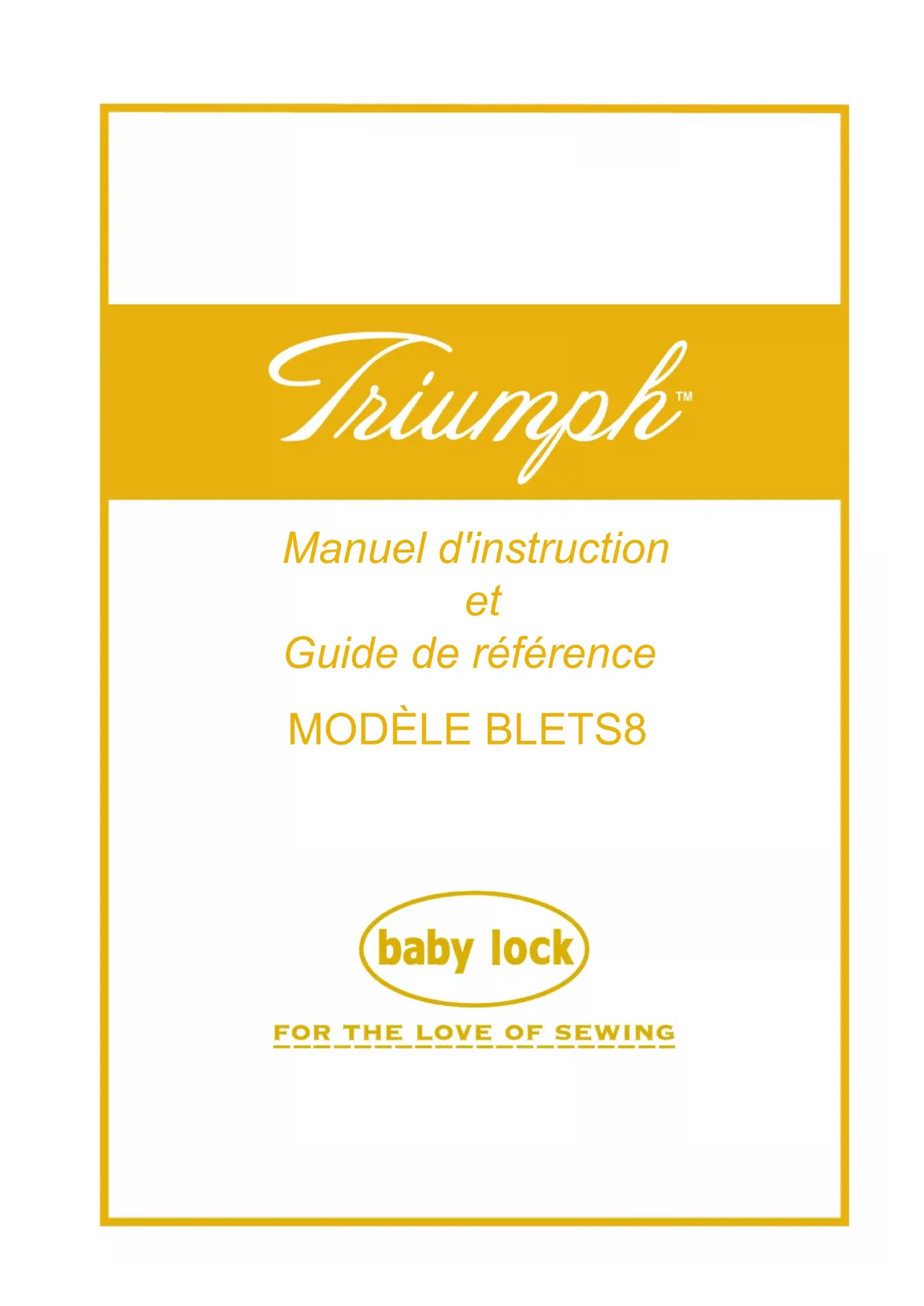 “Cette machine à coudre est conçue pour un usage domestique.”1 Votre Baby Lock Triumph vous souhaite la bienvenue Grâce à votre appareil Baby Lock Triumph, vous pouvez effectuer des points de chaînette, des points fantaisie et des points de surjet. Baby Lock Triumph dispose d’un système exclusif d’alimentation en fil qui permet de ne pas se soucier des réglages de tension compliqués. Triumph vous permet de réaliser un point parfait avec tout type de fil sur tout type de tissu. Plus besoin de deviner le réglage de tension adéquat. La surjeteuse Baby Lock Triumph dispose du bouton exclusif « Push to Thread » (pousser pour enfil- er) actionnant un système électrique d’enfilage à jet d’air RevolutionAir. Ce qui signifie qu’elle n’est pas seulement équipée d’un bouton pour enfiler les boucleurs mais égale- ment d’un bouton pour enfiler les aiguilles. Votre Baby Lock Triumph est une machine fiable et d’une très grande qualité. Elle vous permet de piquer, de surfiler et d'orner en une seule et même opération. Les tissus et fils que vous redoutiez sont désormais agréables à coudre car Baby Lock Triumph permet de travailler toutes les variétés de matières avec la même aisance. Grâce à votre appareil Baby Lock Triumph, vos options créatives sont infinies et le temps que vous passez à surfiler devient un plaisir et une satisfaction. Grâce au système électrique d’enfilage à jet d’air de votre Baby Lock Triumph, tous les enfilages, y compris celui des aiguilles, sont un vrai plaisir. Si vous en prenez soin et entretenez correctement votre appareil, votre Baby Lock Triumph est la promesse de nombreuses années de couture fiable et de grande qualité, accomplie avec plaisir. Conservez ce manuel et utilisez lecomme un guide qui vous accompagnera étape par étape et vous permettra de vous familiariser avec votre Baby Lock Triumph tout en élargissant votre horizon créatif. Bonne couture !T