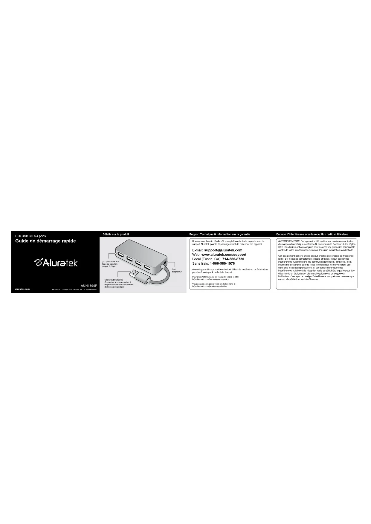 Énoncé d’interférence avec la réception radio et télévisée Pour plus d'informations, s'il vous plaît visitez le site:http://aluratek.com/warranty-return-policyVous pouvez enregistrer votre produit en ligne à:http://aluratek.com/product-registration Support Technique & Information sur la garantie Hub USB 3.0 à 4 ports Guide de démarrage rapide qsg Q10327 Copyright © 2013 Aluratek, Inc. All Rights Reserved.aluratek.com AUH1304F Détails sur le produit E-mail: support@aluratek.com Web: www.aluratek.com/support Local (Tustin, CA): 714-586-8730 Sans frais: 1-866-580-1978 Aluratek garantit ce produit contre tout défaut de matériel ou de fabrication pour les 1 an à partir de la date d'achat.Si vous avez besoin d'aide, s'il vous plaît contacter le département de support Aluratek pour le dépannage avant de retourner cet appareil.AVERTISSEMENT!!! Cet appareil a été testé et est conforme aux limites d’un appareil numérique de Classe B, en vertu de la Section 15 des règles CFC. Ces limites ont été conçues pour assurer une protection raisonnable contre de telles interférences néfastes dans une installation résidentielle.Cet équipement génère, utilise et peut émettre de l’énergie de fréquence radio. S’il n’est pas correctement installé et utilisé, il peut causer des interférences nuisibles dans les communications radio. Toutefois, il est impossible de garantir que de telles interférences ne surviendront pas dans une installation particulière. Si cet équipement cause des interférences nuisibles à la réception radio ou télévisée, laquelle peut être déterminée en éteignant et allumant l’équipement, on suggère à l’utilisateur d’essayer de corriger l’interférence par quelques mesures que ce soit afin d’éliminer les interférences.Câble USB Attached - Connectez le concentrateur à un port USB de votre ordinateur de bureau ou portable(x4) ports USB 3.0 - Taux de transfert jusqu'à 5 Gbps Port adaptateur