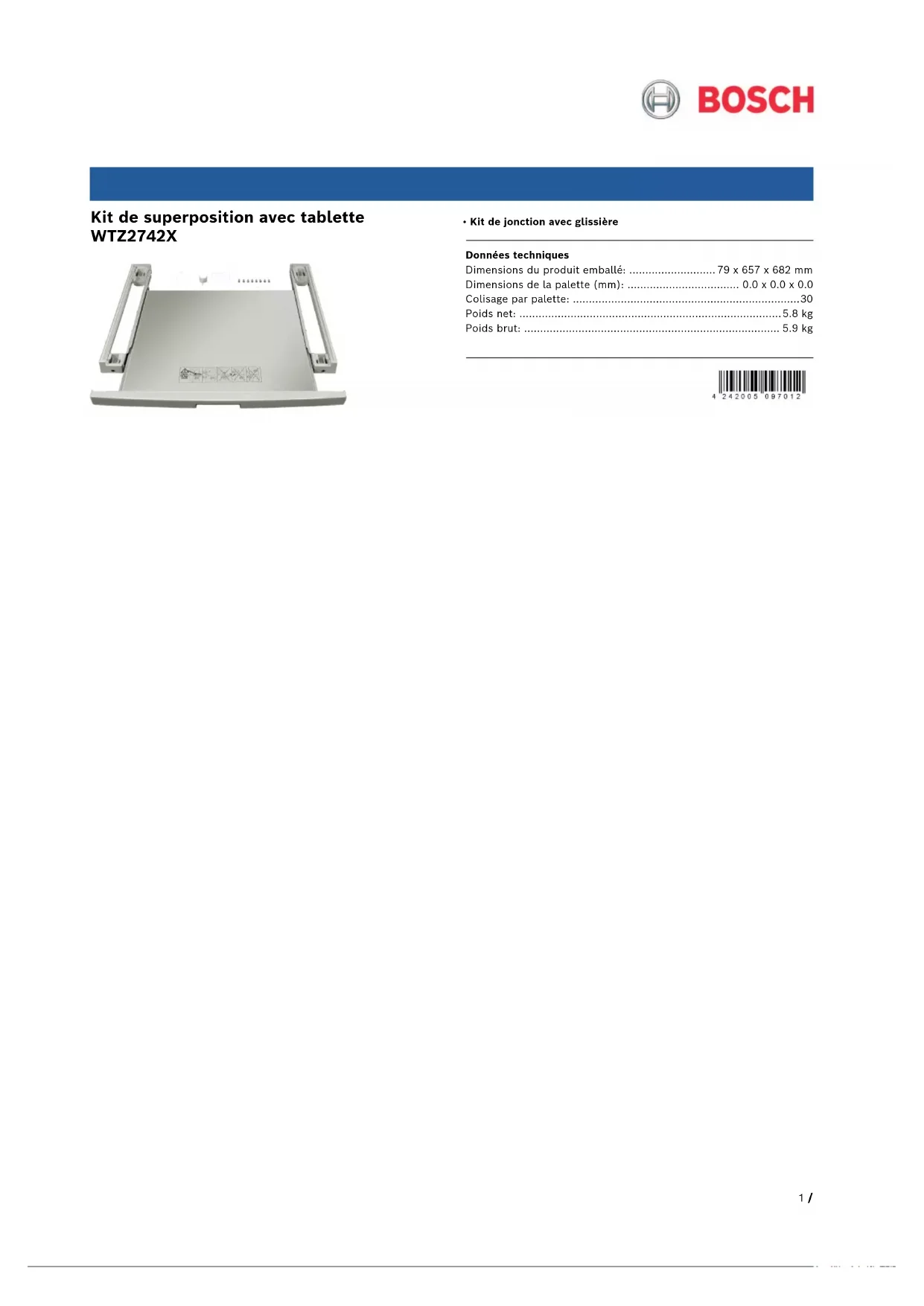 Pour installer le BOSCH WTZ2742X, suivez les instructions dans le manuel d'utilisation. Assurez-vous que l'appareil est placé sur une surface plane et stable. Connectez les câbles nécessaires et vérifiez que tout est correctement fixé.