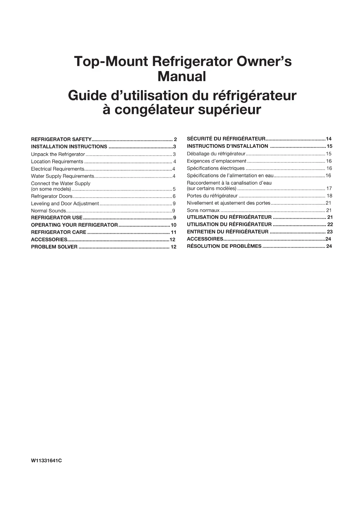 Commander le numéro de pièceW10355010 ACCESSOIRES AVERTISSEMENT Risque de choc électrique Brancher sur une prise à 3 alvéoles reliée à la terre. Ne pas enlever la broche de liaison à la terre. Ne pas utiliser un adaptateur. Ne pas utiliser un câble de rallonge. Le non-respect de ces instructions peut causer un décès, un incendie ou un choc électrique. AVERTISSEMENT Risque d’explosion Utiliser un produit nettoyant ininammable. Le non-respect de cette instruction peut entraîner la mort, une explosion ou un incendie.25 Si les problèmes suivants surviennent Causes possibles et solutions recommandées Le réfrigérateur ne fonctionne pas ■ Non raccordé à l’alimentation électrique – Brancher le cordon d’alimentation dans une prise à 3alvéoles reliée à la terre. Ne pas utiliser de rallonge. ■ Pas d’alimentation au niveau de la prise – Brancher une lampe pour voir si la prise électrique fonctionne. ■ Un fusible du domicile est grillé ou le disjoncteur s’est ouvert – Remplacer le fusible ou réenclencher le disjoncteur. Si le problème persiste, appeler un électricien. ■ La commande n’est pas allumée – Mettre en marche la commande du réfrigérateur. Voir la section « Utilisation des commandes ». ■ Nouvelle installation – Attendre 24 heures après l’installation pour permettre au réfrigérateur de refroidir complètement. REMARQUE: Le fait de régler les commandes de température sur le réglage le plus froid ne refroidira pas le compartiment plus rapidement. Le moteur semble fonctionner excessivement. Votre nouveau réfrigérateur fonctionnera peut-être plus longtemps que votre appareil précédent. Lesréfrigérateurs éconergiques fonctionnent plus longtemps à des vitesses inférieures, plus éconergiques. Le réfrigérateur peut fonctionner encore plus longtemps si la température de la pièce est élevée, si une grande quantité de nourriture aété ajoutée, si la porte est fréquemment ouverte ou si elle est laissée ouverte. Le réfrigérateur est bruyant Le bruit émis par les réfrigérateurs a été réduit au cours des années. Les bruits de fonctionnement étant moins importants, il sera possible de remarquer des bruits inconnus qui sont en réalité normaux. Voici quelques sons normaux accompagnés d’une explication: ■ Bourdonnement – Se fait entendre lorsque le robinet d’eau s’ouvre pour remplir la machine à glaçons ■ Cliquètement/crépitement – Ouverture ou fermeture des robinets ■ Pulsation – Les ventilateurs/le compresseur se règlent afin d’optimiser la performance ■ Cliquetis – écoulement de liquide réfrigérant, mouvement des conduites d’eau ou d’objets posés sur le dessus du réfrigérateur ■ Grésillement/gargouillement – de l’eau tombe sur l’élément de chauffage durant le programme de dégivrage ■ Bruit d’éclatement – Contraction/expansion des parois internes, particulièrement lors du refroidissement initial ■ Bruit d’écoulement d’eau – Peut être entendu lorsque la glace fond lors du programme de dégivrage et que l’eau s’écoule dans le plateau de dégivrage ■ Grincement/craquement – Se produit lorsque la glace est éjectée du moule à glaçons. La porte ne ferme pas complètement ■ La porte est bloquée en position ouverte – Déplacer les aliments sous emballage pour dégager la porte. Replacer le compartiment ou la tablette en position correcte Vérifier que le couvercle du bac à légumes est enfoncé complètement de sorte que l’arrière repose sur les supports. La porte est difficile à ouvrir ■ Les joints sont sales ou collants – Nettoyer les joints et les surfaces au savon doux et à l’eau tiède. Rincer et sécher avec un linge doux. La température est trop élevée ■ Nouvelle installation – Attendre 24 heures après l’installation pour permettre au réfrigérateur de refroidir complètement. ■ La/les porte(s) sont fréquemment ouvertes ou ne sont pas complètement fermées – Cela permet à l’air chaud de pénétrer dans le réfrigérateur. Réduire les ouvertures de porte et garder la porte complètement fermée. ■ Une grande quantité d’aliments chauds a été récemment ajoutée – Attendre quelques heures pour permettre au réfrigérateur de revenir à une température normale. ■ Vérifier que le réglage des/de la commande(s) de température est adapté à l’environnement de l’appareil – Régler les commandes à un réglage plus froid. Vérifier la température au bout de 24 heures. Voir la section « Utilisation des commandes ». Il y a accumulation d’humidité à l’intérieur REMARQUE: Une certaine accumulation d’humidité est normale. ■ Pièce humide – Ceci contribue à l’accumulation de l’humidité dans le réfrigérateur. ■ La/les porte(s) sont fréquemment ouvertes ou ne sont pas complètement fermées – Cela permet à l’air humide de pénétrer dans le réfrigérateur. Réduire les ouvertures de porte et garder la porte complètement fermée. La machine à glaçons ne produit pas ou pas suffisamment de glaçons ■ La machine à glaçons n’est pas raccordée à l’alimentation en eau – Raccorder le réfrigérateur à l’alimentation en eau et ouvrir complètement le robinet d’arrêt d’eau. ■ Une déformation de la canalisation peut réduire le débit d’eau – Redresser la canalisation d’eau. ■ La machine à glaçons est éteinte – S’assurer que le bras de commande de la machine à glaçons ou l’interrupteur (selon les modèles) sont bien à la position ON (marche). ■ Nouvelle installation – Attendre 24 heures après l’installation de la machine à glaçons pour que la production de glaçons commence. Attendre 3 jours pour que la production de glaçons soit complète. ■ Une grande quantité de glaçons a été récemment prélevée – Accorder suffisamment de temps à la machine à glaçons pour produire plus de glaçons. ■ Gla