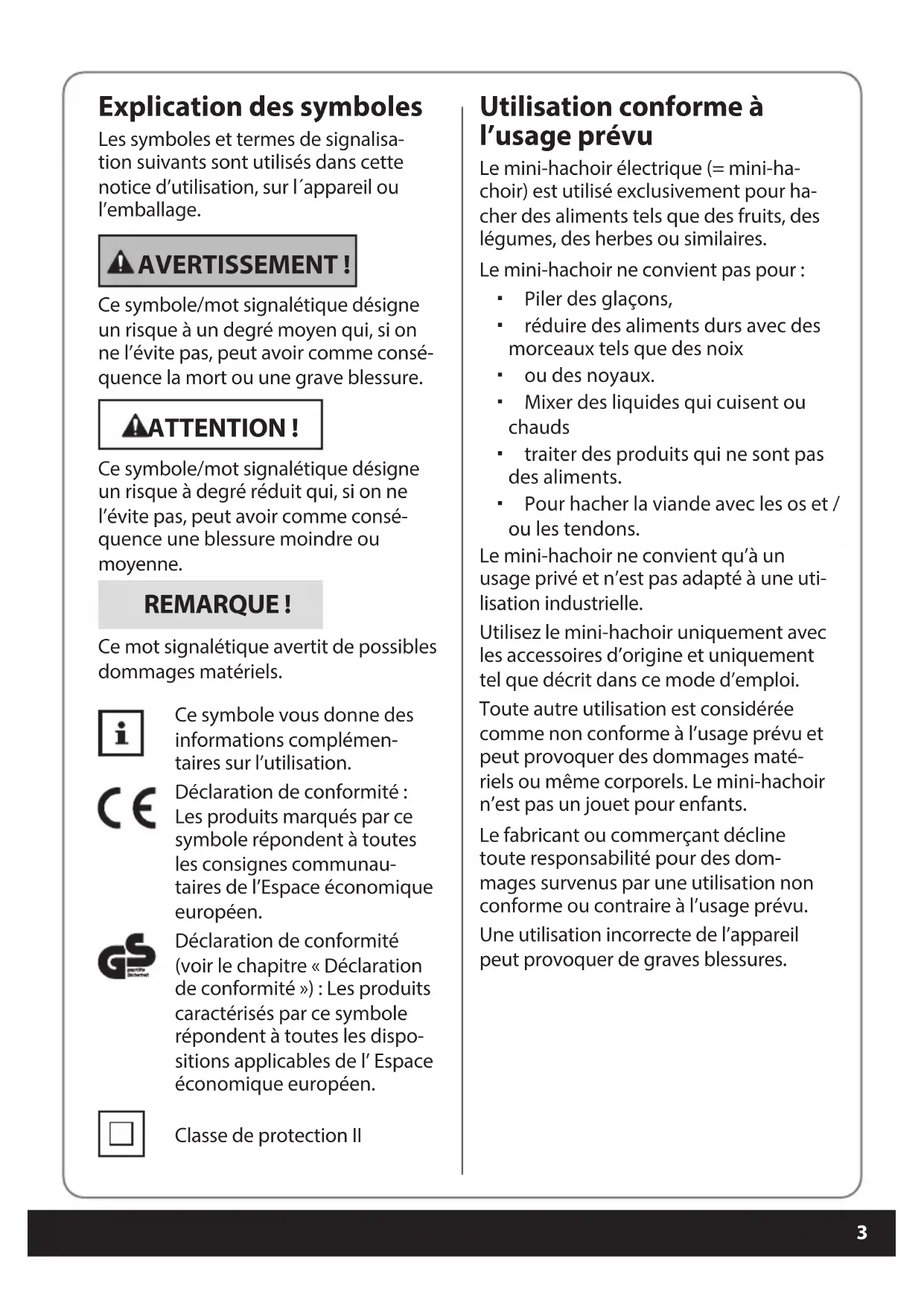 Explication des symboles Les symboles et termes de signalisa- tion suivants sont utilisés dans cette notice d’utilisation, sur l´appareil ou l’emballage. AVERTISSEMENT ! Ce symbole/mot signalétique désigne un risque à un degré moyen qui, si on ne l’évite pas, peut avoir comme consé- quence la mort ou une grave blessure. ATTENTION ! Ce symbole/mot signalétique désigne un risque à degré réduit qui, si on ne l’évite pas, peut avoir comme consé- quence une blessure moindre ou moyenne. REMARQUE ! Ce mot signalétique avertit de possibles dommages matériels. Ce symbole vous donne des informations complémen- taires sur l’utilisation. Déclaration de conformité : Les produits marqués par ce symbole répondent à toutes les consignes communau- taires de l’Espace économique européen. Déclaration de conformité (voir le chapitre « Déclaration de conformité ») : Les produits caractérisés par ce symbole répondent à toutes les dispo- sitions applicables de l’ Espace économique européen. Classe de protection II Utilisation conforme à l’usage prévu Le mini-hachoir électrique (= mini-ha- choir) est utilisé exclusivement pour ha- cher des aliments tels que des fruits, des légumes, des herbes ou similaires. Le mini-hachoir ne convient pas pour : Piler des glaçons, réduire des aliments durs avec des morceaux tels que des noix ou des noyaux. Mixer des liquides qui cuisent ou chauds traiter des produits qui ne sont pas des aliments. Pour hacher la viande avec les os et / ou les tendons. Le mini-hachoir ne convient qu’à un usage privé et n’est pas adapté à une uti- lisation industrielle. Utilisez le mini-hachoir uniquement avec les accessoires d’origine et uniquement tel que décrit dans ce mode d’emploi. Toute autre utilisation est considérée comme non conforme à l’usage prévu et peut provoquer des dommages maté- riels ou même corporels. Le mini-hachoir n’est pas un jouet pour enfants. Le fabricant ou commerçant décline toute responsabilité pour des dom- mages survenus par une utilisation non conforme ou contraire à l’usage prévu. Une utilisation incorrecte de l’appareil peut provoquer de graves blessures. Druckbuch MiniHacker FR.indb 3Druckbuch MiniHacker FR.indb 3 16.07.2021 09:14:1716.07.2021 09:14:174 Consignes de sécurité AVERTISSEMENT ! Risque d’électrocution ! Une installation électrique défectueuse ou une tension de secteur trop élevée peut pro- voquer un choc électrique. Ne branchez le mini-hachoir que si la tension de secteur de la prise électrique cor- respond aux indications mentionnées sur la plaque signalétique. Ne branchez le mini-hachoir que sur une prise électrique bien accessible an de pou- voir le couper rapidement du secteur électrique en cas de panne. N’utilisez pas le mini-ha- choir si il présente des dom- mages visibles ou si le câble électrique ou la che réseau sont défectueux. Ne branchez jamais le mi- ni-hachoir en même temps avec d’autres appareils sur un bloc multiprises. Lorsque le câble électrique du mini-hachoir est endom- magé, il doit être remplacé par le fabricant, son SAV ou une personne de quali- cation similaire pour éviter tout dommage. N’ouvrez pas le boîtier, faites eectuer la réparation par des professionnels. Adres- sez-vous pour ceci à un atelier de professionnels. En cas de réparations de sa propre initiative, de bran- chement non conforme ou d’utilisation incorrecte, tous droits de responsabilité et de garantie sont exclus. Seules des pièces détachées correspondant à l’appareil d’origine pourront être utilisées lors de réparations. Dans ce mini-hachoir se trouvent des pièces élec- triques et mécaniques indispensables pour la pro- tection contre des sources de risque. N’utilisez pas le mini-ha- choir avec une minuterie externe ou avec un système d’enclenchement à distance séparé. Ne plongez ni le mini-ha- choir ni le câble électrique ou la che réseau dans de l’eau ou d’autres liquides. Placez le mini-hachoir de telle manière qu’aucun liquide ne puisse passer sur la che de raccordement de l’appareil. Druckbuch MiniHacker FR.indb 4Druckbuch MiniHacker FR.indb 4 16.07.2021 09:14:1716.07.2021 09:14:175