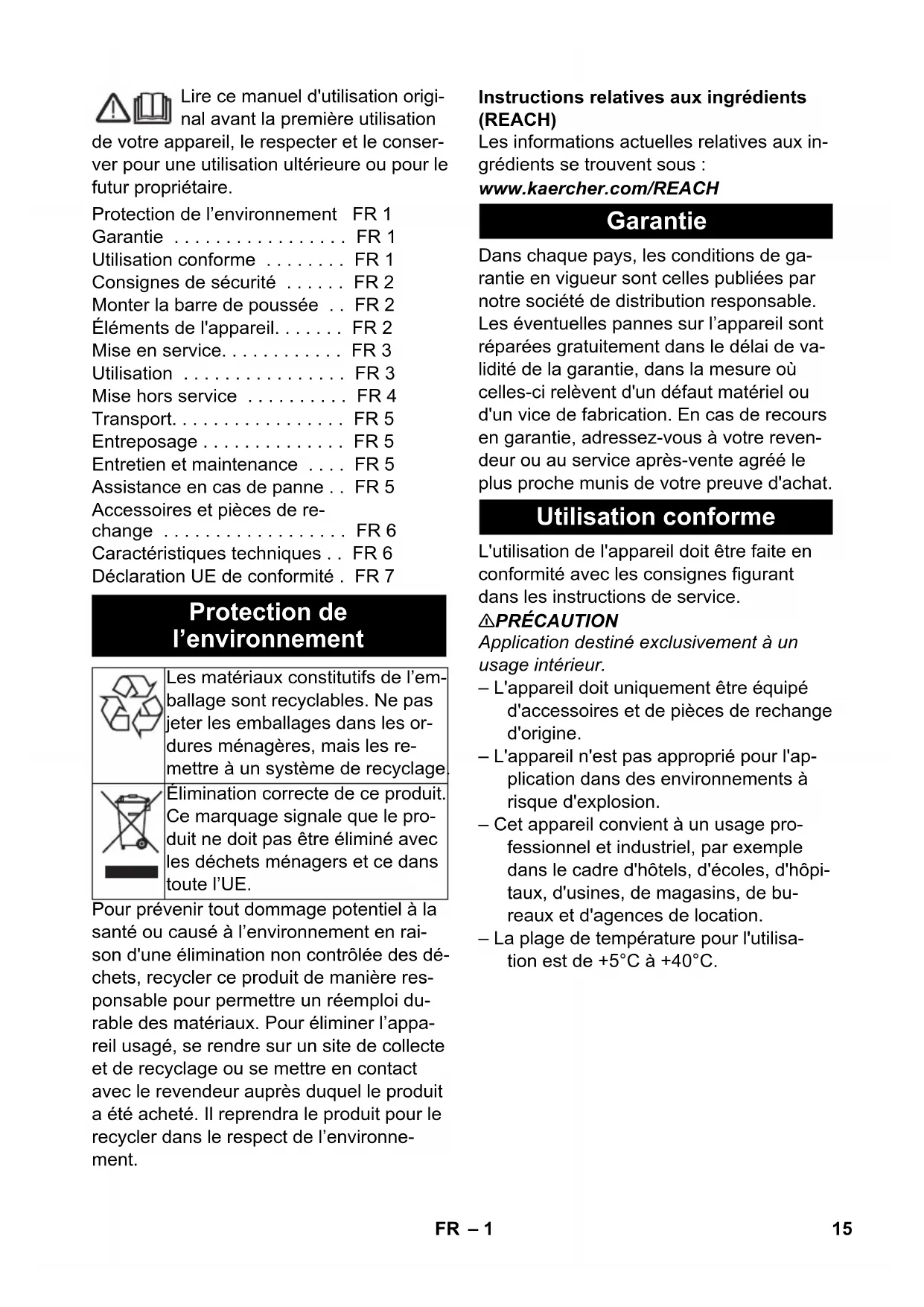 Chairman of the Board of Management Director Regulatory Affairs & Certification 14 EN– 1 Lire ce manuel d'utilisation origi- nal avant la première utilisation de votre appareil, le respecter et le conser- ver pour une utilisation ultérieure ou pour le futur propriétaire. Pour prévenir tout dommage potentiel à la santé ou causé à l’environnement en rai- son d'une élimination non contrôlée des dé- chets, recycler ce produit de manière res- ponsable pour permettre un réemploi du- rable des matériaux. Pour éliminer l’appa- reil usagé, se rendre sur un site de collecte et de recyclage ou se mettre en contact avec le revendeur auprès duquel le produit a été acheté. Il reprendra le produit pour le recycler dans le respect de l’environne- ment. Instructions relatives aux ingrédients (REACH) Les informations actuelles relatives aux in- grédients se trouvent sous : www.kaercher.com/REACH Dans chaque pays, les conditions de ga- rantie en vigueur sont celles publiées par notre société de distribution responsable. Les éventuelles pannes sur l’appareil sont réparées gratuitement dans le délai de va- lidité de la garantie, dans la mesure où celles-ci relèvent d'un défaut matériel ou d'un vice de fabrication. En cas de recours en garantie, adressez-vous à votre reven- deur ou au service après-vente agréé le plus proche munis de votre preuve d'achat. L'utilisation de l'appareil doit être faite en conformité avec les consignes figurant dans les instructions de service. 몇 PRÉCAUTION Application destiné exclusivement à un usage intérieur. – L'appareil doit uniquement être équipé d'accessoires et de pièces de rechange d'origine. – L'appareil n'est pas approprié pour l'ap- plication dans des environnements à risque d'explosion. – Cet appareil convient à un usage pro- fessionnel et industriel, par exemple dans le cadre d'hôtels, d'écoles, d'hôpi- taux, d'usines, de magasins, de bu- reaux et d'agences de location. – La plage de température pour l'utilisa- tion est de +5°C à +40°C. Protection de l’environnement FR 1 Garantie . . . . . . . . . . . . . . . . . FR 1 Utilisation conforme . . . . . . . . FR 1 Consignes de sécurité . . . . . . FR 2 Monter la barre de poussée . . FR 2 Éléments de l'appareil. . . . . . . FR 2 Mise en service. . . . . . . . . . . . FR 3 Utilisation . . . . . . . . . . . . . . . . FR 3 Mise hors service . . . . . . . . . . FR 4 Transport. . . . . . . . . . . . . . . . . FR 5 Entreposage . . . . . . . . . . . . . . FR 5 Entretien et maintenance . . . . FR 5 Assistance en cas de panne . . FR 5 Accessoires et pièces de re- change . . . . . . . . . . . . . . . . . . FR 6 Caractéristiques techniques . . FR 6 Déclaration UE de conformité . FR 7 Protection de l’environnement Les matériaux constitutifs de l’em- ballage sont recyclables. Ne pas jeter les emballages dans les or- dures ménagères, mais les re- mettre à un système de recyclage. Élimination correcte de ce produit. Ce marquage signale que le pro- duit ne doit pas être éliminé avec les déchets ménagers et ce dans toute l’UE. Garantie Utilisation conforme 15FR– 2 Lire le présent mode d'emploi ainsi que la brochure ci-jointe Consignes de sécurité pour les machines d'un seul disque n° 5.956659 avant d'utiliser l'appareil et res- pecter les instructions. DANGER Signale la présence d'un danger imminent entraînant de graves blessures corporelles et pouvant avoir une issue mortelle. 몇 AVERTISSEMENT Signale la présence d'une situation éven- tuellement dangereuse pouvant entraîner de graves blessures corporelles et même avoir une issue mortelle. 몇 PRÉCAUTION Remarque relative à une situation poten- tiellement dangereuse pouvant entraîner des blessures légères. ATTENTION Remarque relative à une situation éven- tuellement dangereuse pouvant entraîner des dommages matériels. Les dispositifs de sécurité ont pour but de protéger l'utilisateur et ils ne doivent donc jamais être désactivés ni évités. Empêche le démarrage involontaire de l’appareil. Pour allumer l’appareil, appuyer sur la touche de déverrouillage puis sur l’in- terrupteur MARCHE/ARRÊT. Avant la mise en service, la barre de pous- sée doit être montée comme illustré et la connexion électrique avec l'appareil doit être établie. Pour les illustrations, voir la page de garde La figure présente l’appareil BDS 43/150 C Classic. L’appareil BDS 43/Duo C est légè- rement différent de ce modèle. 1 Entraîneur, disque-brosse / plateau d'entraînement avec pad 2 Plaque de balai / commande de traction de pad 3 Levier de dosage solution de détergent (option) 4 Interrupteur MARCHE/ARRET 5 Crochet de câble 6 Touche de déverrouillage 7 Poignée 8 Levier Réglage d'inclination 9 Fusible de l'entraînement de brosse 10 Prise pour accessoire 11 Réservoir de détergent (option) 12 Châssis moteur 13 Interrupteur vitesse de rotation de la brosse (uniquement BDS 43/Duo C) ** non compris dans l'étendue de livraison Consignes de sécurité Niveaux de danger Dispositifs de sécurité Verrouillage Monter la barre de poussée Éléments de l'appareil