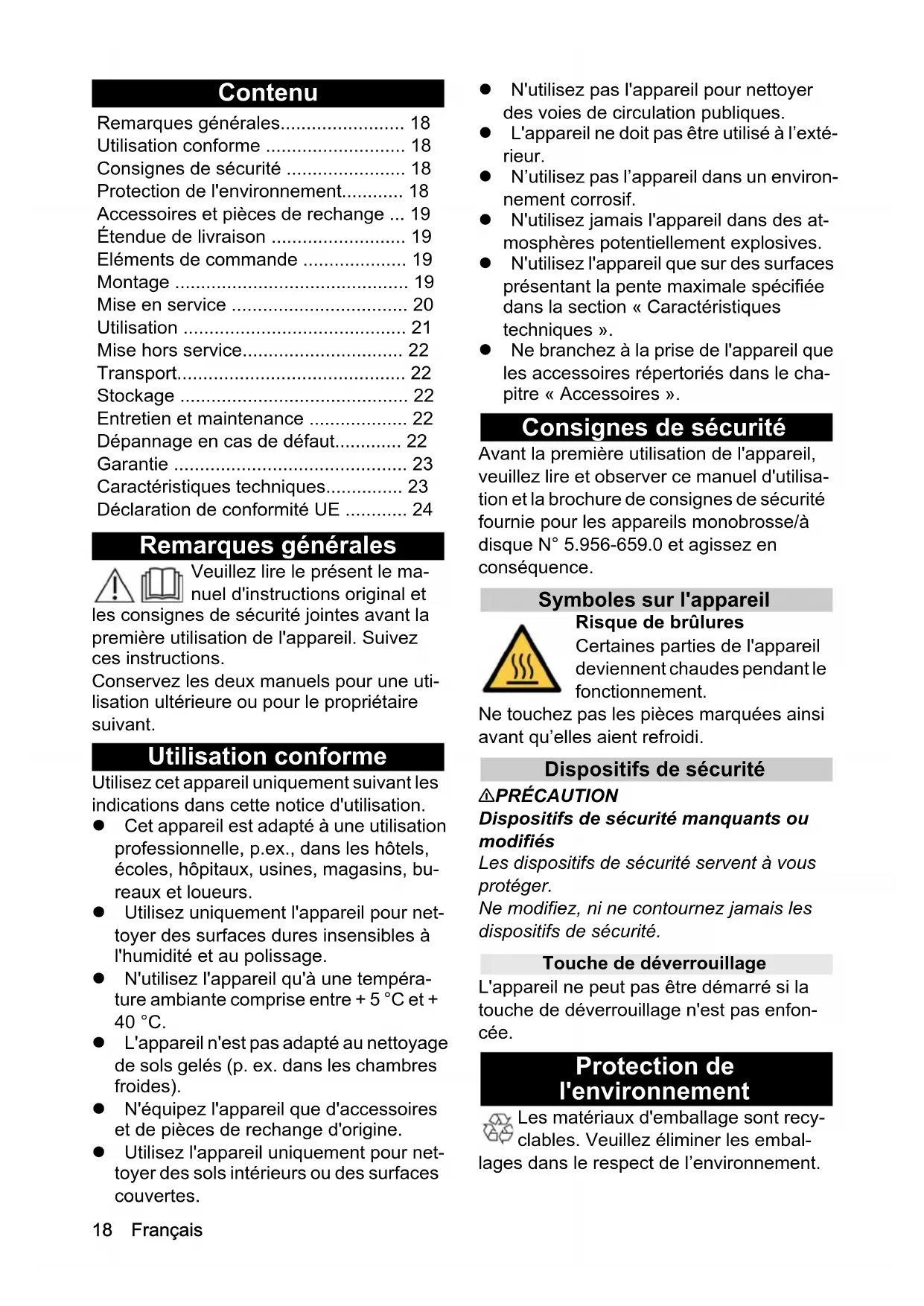- The signatories act on behalf of and with the authority of the company management. Documentation supervisor: S. Reiser Alfred Kärcher SE & Co. KG Alfred-Kärcher-Str. 28 - 40 71364 Winnenden (Germany) Ph.: +49 7195 14-0 Fax: +49 7195 14-2212 Winnenden, 2021/09/01 Declaration of Conformity (UK)18 Français Contenu Remarques générales Veuillez lire le présent le ma- nuel d'instructions original et les consignes de sécurité jointes avant la première utilisation de l'appareil. Suivez ces instructions. Conservez les deux manuels pour une uti- lisation ultérieure ou pour le propriétaire suivant. Utilisation conforme Utilisez cet appareil uniquement suivant les indications dans cette notice d'utilisation. Cet appareil est adapté à une utilisation professionnelle, p.ex., dans les hôtels, écoles, hôpitaux, usines, magasins, bu- reaux et loueurs. Utilisez uniquement l'appareil pour net- toyer des surfaces dures insensibles à l'humidité et au polissage. N'utilisez l'appareil qu'à une tempéra- ture ambiante comprise entre + 5 °C et + 40 °C. L'appareil n'est pas adapté au nettoyage de sols gelés (p. ex. dans les chambres froides). N'équipez l'appareil que d'accessoires et de pièces de rechange d'origine. Utilisez l'appareil uniquement pour net- toyer des sols intérieurs ou des surfaces couvertes. N'utilisez pas l'appareil pour nettoyer des voies de circulation publiques. L'appareil ne doit pas être utilisé à l’exté- rieur. N’utilisez pas l’appareil dans un environ- nement corrosif. N'utilisez jamais l'appareil dans des at- mosphères potentiellement explosives. N'utilisez l'appareil que sur des surfaces présentant la pente maximale spécifiée dans la section « Caractéristiques techniques ». Ne branchez à la prise de l'appareil que les accessoires répertoriés dans le cha- pitre « Accessoires ». Consignes de sécurité Avant la première utilisation de l'appareil, veuillez lire et observer ce manuel d'utilisa- tion et la brochure de consignes de sécurité fournie pour les appareils monobrosse/à disque N° 5.956-659.0 et agissez en conséquence. Symboles sur l'appareil Risque de brûlures Certaines parties de l'appareil deviennent chaudes pendant le fonctionnement. Ne touchez pas les pièces marquées ainsi avant qu’elles aient refroidi. Dispositifs de sécurité 몇 PRÉCAUTION Dispositifs de sécurité manquants ou modifiés Les dispositifs de sécurité servent à vous protéger. Ne modifiez, ni ne contournez jamais les dispositifs de sécurité. Touche de déverrouillage L'appareil ne peut pas être démarré si la touche de déverrouillage n'est pas enfon- cée. Protection de l'environnement Les matériaux d'emballage sont recy- clables. Veuillez éliminer les embal- lages dans le respect de l’environnement. Remarques générales p. 18