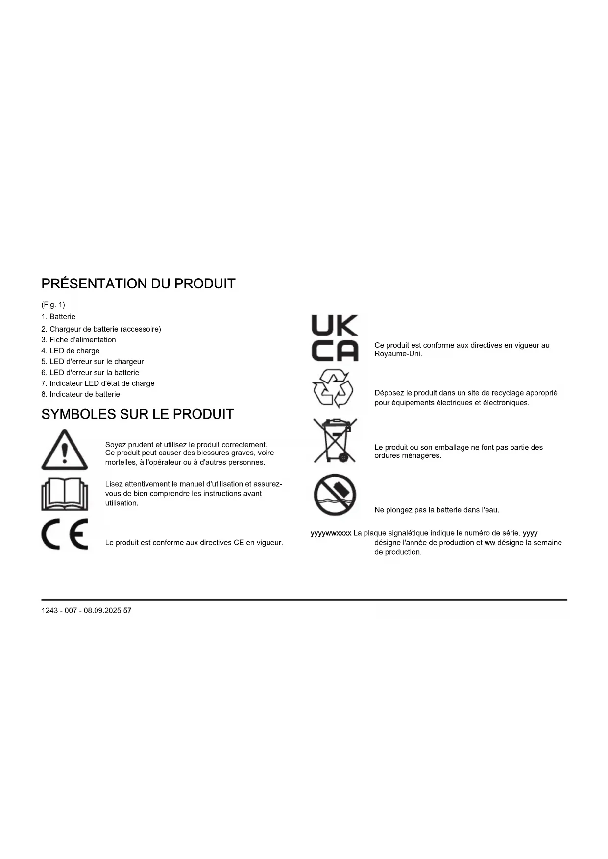 Soyez prudent et utilisez le produit correctement. Ce produit peut causer des blessures graves, voire mortelles, à l'opérateur ou à d'autres personnes. Lisez attentivement le manuel d'utilisation et assurez- vous de bien comprendre les instructions avant utilisation. Le produit est conforme aux directives CE en vigueur. Ce produit est conforme aux directives en vigueur au Royaume-Uni. Déposez le produit dans un site de recyclage approprié pour équipements électriques et électroniques. Le produit ou son emballage ne font pas partie des ordures ménagères. Ne plongez pas la batterie dans l'eau. yyyywwxxxx La plaque signalétique indique le numéro de série. yyyy désigne l'année de production et ww désigne la semaine de production. 1243 - 007 - 08.09.2025 57Remarque: Les autres symboles/autocollants présents sur le produit concernent des exigences de certification spécifiques à certaines zones commerciales. Symboles de conformité Points de collecte sur www.quefairedemesdechets.fr l ! À DÉPOSEREN MAGASINÀ DÉPOSEREN DÉCHÈTERIE