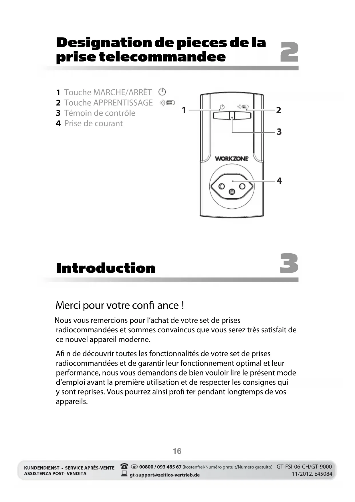00800 / 093 485 67 (kostenfrei/Numéro gratuit/Numero gratuito) gt-support@zeitlos-vertrieb.deKUNDENDIENST • SERVICE APRÈS-VENTE ASSISTENZA POST- VENDITAGT-FSI-06-CH/GT-900011/2012, E45084 Merci pour votre con ance ! Nous vous remercions pour l’achat de votre set de prises radiocommandées et sommes convaincus que vous serez très satisfait de ce nouvel appareil moderne. A n de découvrir toutes les fonctionnalités de votre set de prises radiocommandées et de garantir leur fonctionnement optimal et leur performance, nous vous demandons de bien vouloir lire le présent mode d‘emploi avant la première utilisation et de respecter les consignes qui y sont reprises. Vous pourrez ainsi pro ter pendant longtemps de vos appareils. Designation de pieces de la prise telecommandee