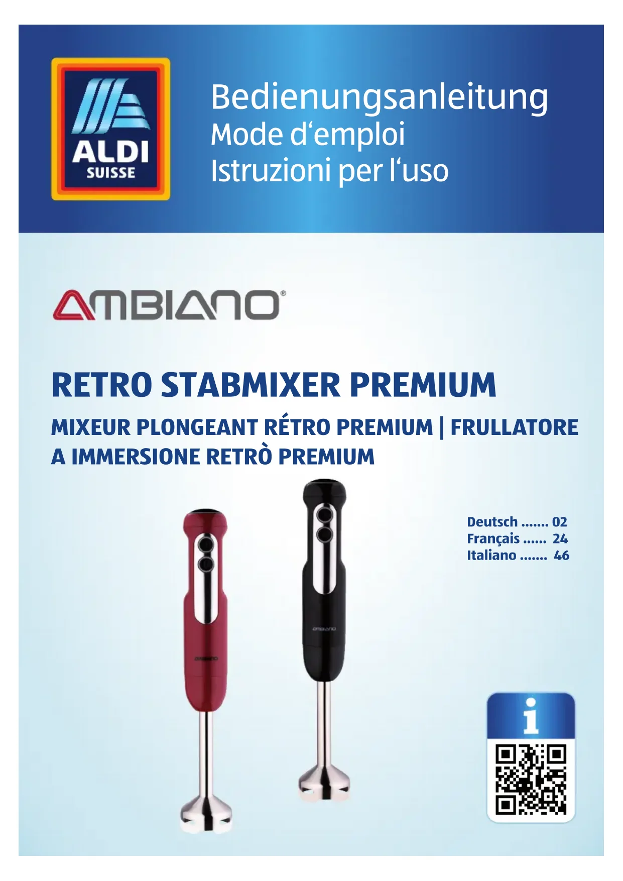 - Lors de l’utilisation du lecteur de codes QR, selon votre tarif, il peut y avoir des frais de connexion internet. Buch_CH_EDS Stabmixer .indb 45Buch_CH_EDS Stabmixer .indb 45 22.10.2021 09:43:2122.10.2021 09:43:2146 Volume di fornitura Volume di fornitura