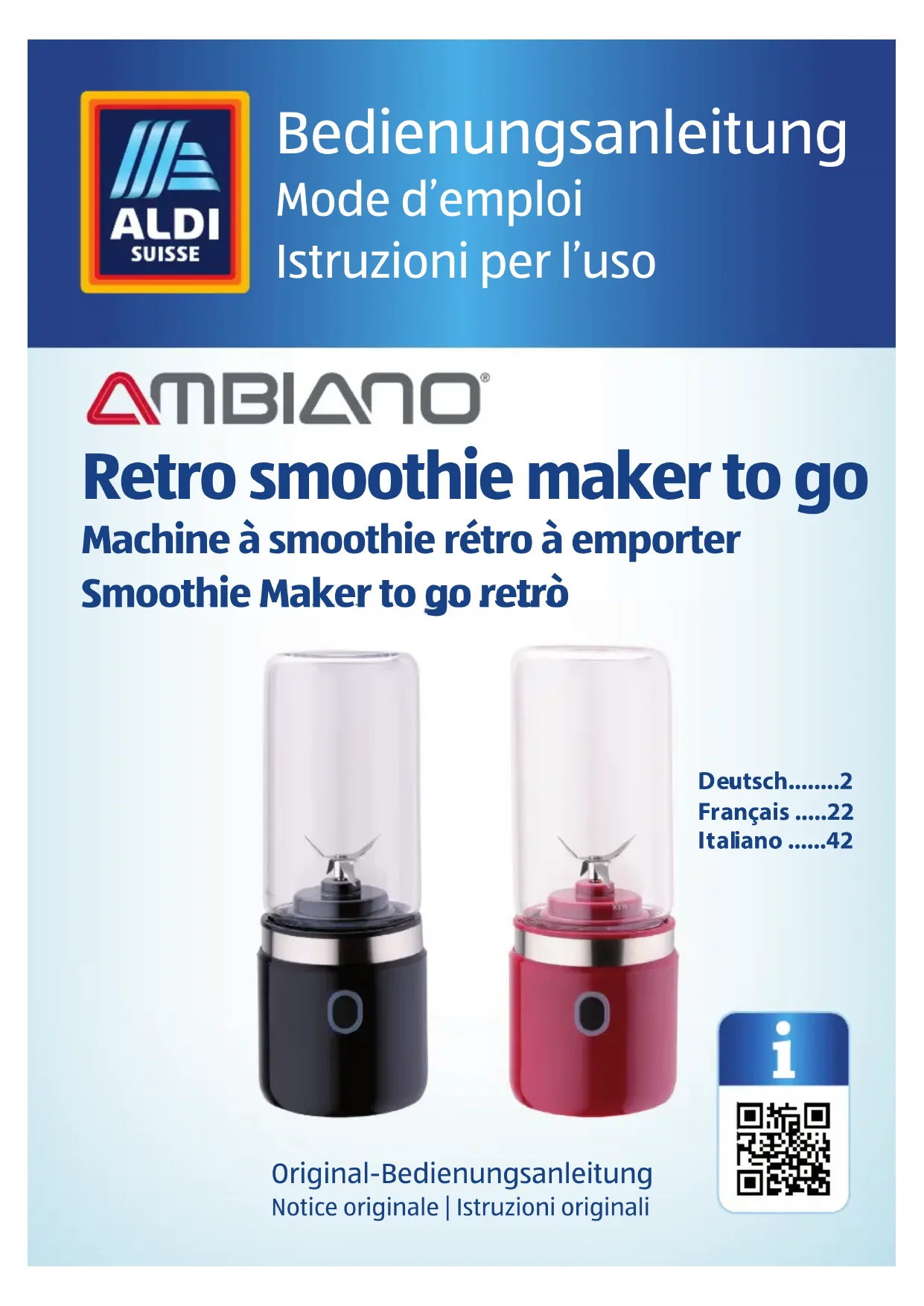 - Nettoyez la machine à smoothie et laissez-la sécher complète- ment avant de la ranger.38 Dysfonctionnements et dépannage/Données techniques Dysfonctionnements et dépannage Défaut Causes possibles et solutions L’affi chage « prêt à fonctionner » clignote 5 fois en rouge. Le bol/mélangeur n’est pas vissé correc- tement sur le bloc moteur. – Vissez un peu plus le bol/mélangeur. L’indicateur de dis- ponibilité opération- nelle clignote 10 fois en rouge. Batterie faible. – Charge de la batterie, voir sous Charge initiale et autres processus de charge. Le moteur s’arrête. Surcharge. – Diminuer la quantité d’ingrédients. Du liquide s’échappe. Le joint en silicone ne se scelle pas cor- rectement. – Vissez un peu plus le bol/mélangeur. – Vérifi ez le joint en silicone. Données techniques Modèle : GT-SMB-01 Batterie, alimentation : Li-Ion, 3,7 V, 2000 mAh Régime moteur : 18 000 min-1 Capacité bol/mélangeur : environ 0,3 litres Dimensions (diamètre x hauteur) : environ 7,8 x 24 cm Nos produits étant développés et améliorés en permanence, des modifi cations de design et techniques ne sont pas exclues. Cette notice d’utilisation peut aussi être téléchargée au format pdf sur notre site web : www.gt-support.de39 Déclaration de conformité/Mise au rebut Déclaration de conformité La conformité de ce produit avec les normes légales est garantie. La déclaration de conformité complète est disponible sur le site internet : www.gt-support.de Mise au rebut Éliminer l’emballage Triez l’emballage avant de l’éliminer. Jetez le papier et le carton dans les conteneurs pour vieux papiers et les fi lms plastique dans la benne de matériaux recyclables. Recycler l’appareil usagé Il est interdit de jeter les appareils usagés dans les or- dures ménagères ! Si l’appareil ne peut plus être utilisé, chaque consommateur est légalement obligé de jeter les vieux appareils séparément des déchets ménagers, par exemple dans un point de collecte de sa commune/son quartier. Cela garantit le bon recyclage des appareils usagés et la réduction des effets négatifs sur l’environ- nement. C’est pourquoi les appareils électriques sont marqués du symbole ci-dessus. Pour éviter de nuire à la santé humaine et à l’environnement en cas d’élimination incontrôlée des déchets, recyclez le produit de manière responsable afi n de promouvoir la réutilisation durable des ressources matérielles. Renseignez-vous auprès de l’association responsable de l’élimi- nation des déchets sur les mesures d’élimination nécessaires pour éviter les risques environnementaux.40 Mise au rebut Il est interdit de jeter les piles et les batteries dans les ordures ménagères ! La loi oblige les consommateurs à déposer les piles et batteries dans un point de collecte dédié. Si les batteries ou accumulateurs contiennent du mercure (Hg), du cadmium (Cd) ou du plomb (Pb), vous retrouverez ces symboles chimiques sous le symbole de la poubelle barrée. Les piles et batteries doivent être déchargées avant d’être jetées. Vous pouvez emmener gratuitement les piles et les batteries dans un point de collecte de votre commune/votre quartier ou dans le com- merce afi n de garantir une élimination écologique et un recyclage des matières premières précieuses. En cas d’élimination inappro- priée, des ingrédients toxiques peuvent être libérés dans l’environ- nement, ce qui a des effets nocifs sur les humains, les animaux et les plantes. Il est recommandé de sortir les piles et les batteries contenues dans les appareils électriques et de les éliminer séparément, dans la me- sure du possible. Le point de collecte peut faire en sorte que la batterie soit retirée de l’appareil. N’essayez PAS d’ouvrir ou de démonter le produit pour retirer la bat- terie vous-même. Confi ez cette tâche à des professionnels.41 Aller rapidement et facilement au but avec les codes QR Si vous avez besoin d’informations sur les produits, de pièces de rechange ou d’accessoires, de données sur les garanties fabricant ou sur les unités de service ou si vous souhaitez regarder confortablement des instructions en vidéo – avec nos codes QR, vous parvenez au but en toute facilité. Les codes QR, qu’est-ce? Les codes QR (QR = Quick Response) sont des codes graphiques qui peuvent être lus à l’aide d’un appareil photo du smartphone et qui contiennent par exemple un lien vers un site Internet ou des données de contact. Votre avantage: plus de frappe contraignante d’adresses Internet ou de données de contact! Comment faire? Pour scanner les codes QR, vous avez simplement besoin d’un smartphone, d’un lecteur de codes QR installé ainsi que d’une connexion Internet.* Vous trouverez généralement un lecteur de codes QR gratuitement dans l’App Store de votre smartphone. Testez dès maintenant Scannez simplement le code QR suivant avec votre smartphone pour en savoir plus sur votre nouveau produit ALDI.* Votre portail de services ALDI Toutes les informations mentionnées plus haut sont également disponibles sur Internet via le portail de services ALDI sous www.aldiservice.ch. *L’exécution du lecteur de codes QR peut entraîner des frais pour la connexion Internet en fonction de votre tarif. Aller rapidement et facilement au but avec les codes QR42