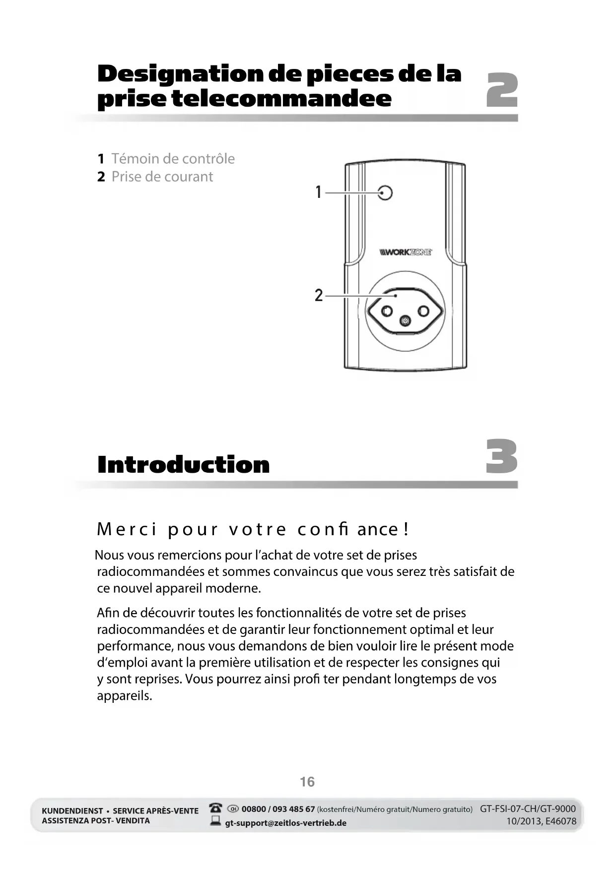 00800 / 093 485 67 (kostenfrei/Numéro gratuit/Numero gratuito)gt-support@zeitlos-vertrieb.deKUNDENDIENST • SERVICE APRÈS-VENTE ASSISTENZA POST- VENDITAGT-FSI-07-CH/GT-900010/2013, E46078 Merci pour votre con ance ! Nous vous remercions pour l’achat de votre set de prises radiocommandées et sommes convaincus que vous serez très satisfait de ce nouvel appareil moderne. A n de découvrir toutes les fonctionnalités de votre set de prises radiocommandées et de garantir leur fonctionnement optimal et leur performance, nous vous demandons de bien vouloir lire le présent mode d‘emploi avant la première utilisation et de respecter les consignes qui y sont reprises. Vous pourrez ainsi pro ter pendant longtemps de vos appareils. Designation de pieces de la prise telecommandee