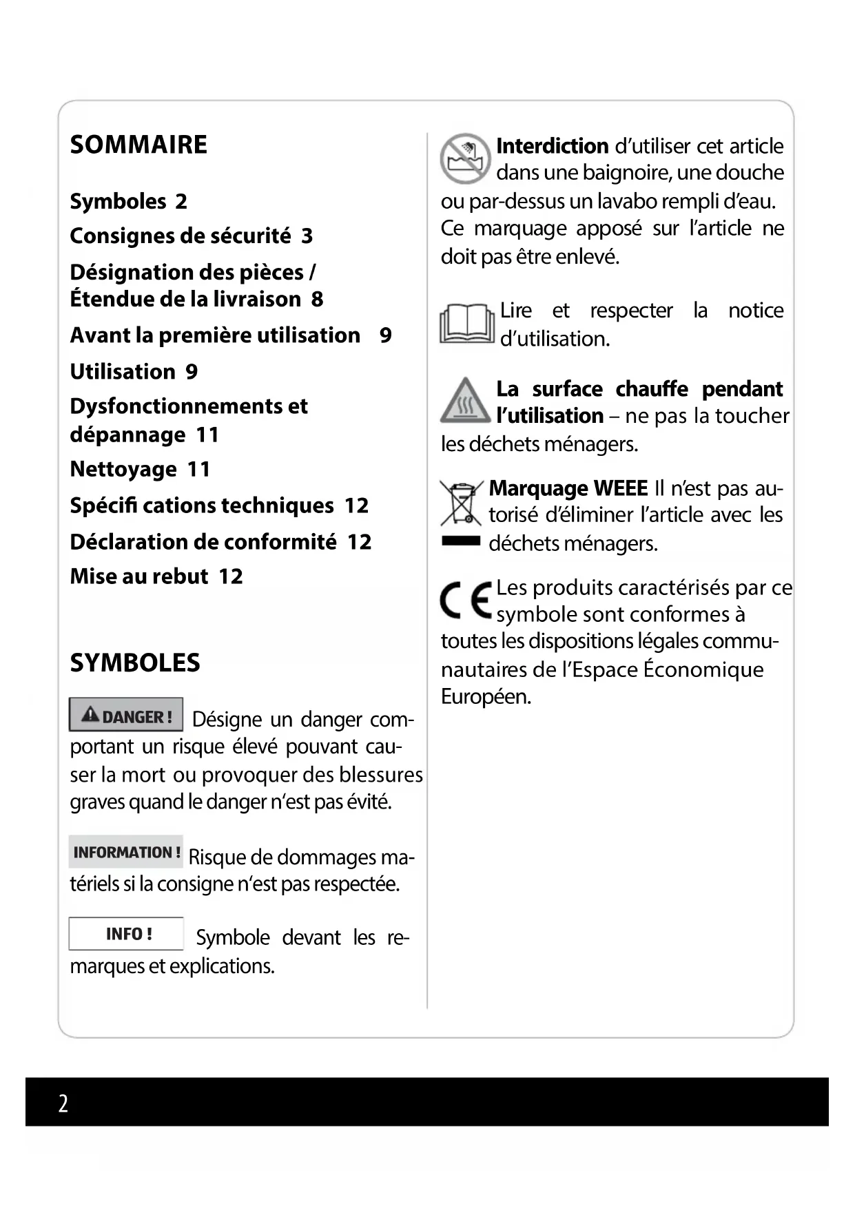 DANGER ! Veuillez lire et appli- quer cette notice d’utilisation complètement avant d’utiliser cet article, conservez-la pour que vous puissiez la relire ulté- rieurement. Joignez cette notice d’utilisation quand vous transmettez l’article à une autre personne. Utilisation conforme L’article convient pour coi er les cheveux secs et humides. Sans accessoire, l’article peut ser- vir à sécher les cheveux humides. Ne pas utiliser l’article pour sé- cher des animaux. L’a r t i c l e s er t e x c lu s i ve m e n t à s é - cher et coi er les cheveux hu- mains. N’utilisez pas l’article pour des perruques ou toupets en ma- tière synthétique. L’a r t i c l e e st d e s t i né u n i q u em e n t à une utilisation privée. Il ne convient pas pour une utilisation commerciale, par exemple dans un salon de coi ure. L’article peut être utilisé avec les accessoires fournis uniquement. Danger pour les enfants et autres personnes Cet article peut être utilisé par des enfants âgés d’au moins 8 ans et plus ainsi que par des personnes avec des capacités physiques, sensorielles ou mentales réduites, ou des personnes dénuées de l’expérience et des connaissances requises pour l’utilisation sûre de cet appareil si elles sont surveil- lées par une personne respon- sable de leur sécurité ou si elles ont été instruites à propos de l’utilisation sûre et qu’elles com- prennent les risques encourus. Les enfants ne sont pas autori- sés à exécuter le nettoyage et la maintenance utilisateur, à moins d’être surveillés par une personne responsable. Les personnes insensibles à la chaleur et les personnes néces- sitant une protection qui ne sont pas capables de réagir contre la surchau e ne sont pas autorisés à utiliser cet article. Conservez le matériel d’embal- lage hors de la portée des en- fants. Il existe un risque d’étouf- fement en cas d’ingestion. Veillez à ce que personne n’en le le sac d’emballage sur la tête.4 Les enfants ne doivent pas jouer avec l’article. Danger par électricité Risque d’électrocution ! L’article fonctionne avec une tension dangereuse. N’essayez jamais d’ouvrir l’article ni d’introduire des objets pour accéder à l’intérieur. Il existe un risque mortel par électrocution. L’emploi de liquides en associa- tion avec les articles électromé- nagers demande une attention extrême ! Une cause fréquente d’accidents domestiques est l’inattention lors d’activités routinières. Vos mains doivent toujours être sèches quand vous branchez ou débran- chez la che secteur. N’utilisez pas l’article à proximité d’une baignoire, d’une douche, d’un lavabo ou d’un autre récipient contenant de l’eau. La proximité de l’eau repré- sente un risque, également quand l’article est hors tension. Retirez toujours la che secteur après l’emploi. Une protection supplémentaire serait l’installa- tion d’un dispositif de protection contre les courants de défaut (FI/ RCD) avec un courant nominal de coupure de 30 mA maximum sur le circuit de la salle de bain. De- mandez conseil à votre installa- teur. N’immergez jamais l’article dans de l’eau ou un autre liquide ! DANGER ! Au cas où cet article tombe à l’eau, retirez d’abord la che secteur de la prise murale avant de saisir l’article ! N’utilisez en aucun cas à nou- veau l’article ! Il subsiste un risque mortel par électrocution. Faites d’abord véri er l’article par un atelier de service agréé. L’article ne doit pas être utilisé sur les cheveux mouillés. Séchez les cheveux au préalable avec une ser- viette avant de les coi er/sécher. N’utilisez pas l’article si vous vous trouvez sur un sol humide. Ne pas utiliser l’article à proximité de gaz ou d’autres substances in- ammables. Si l’article est déplacé d’un en- vironnement froid vers un envi- ronnement chaud (par ex. après le transport), de la condensation5 peut se former à l’intérieur. A n de vous protéger contre l’électro- cution et l’article de dommages, utilisez-le au plus tôt après une heure. N’utilisez pas l’article en extérieur, ne l’exposez jamais à des in uences météorologiques, comme la pluie, la neige ou le gel. Veillez à ne pas aspirer les cheveux dans l’ori ce d’aspiration d’air durant l’emploi. N’insérez jamais d’objets étrangers dans l’ori ce d’aspiration ou d’évacuation ; cela peut provoquer des dommages mécaniques ou une électrocution. Ne couvrez pas l’ori ce d’aspira- tion ou d’évacuation d’air pen- dant le fonctionnement, nettoyez périodiquement la grille. Si l’en- trée ou la sortie d’air est obstruée durant l’emploi, l’interrupteur de protection contre la surchau e peut se déclencher, et l’article sera arrêté. Dans ce cas, retirez la che secteur de la prise murale et retirez le blocage de l’ori ce d’as- piration ou d’évacuation. L’a r t i c l e s e r a à n o u ve a u p rê t à l’emploi quand l’interrupteur de protection contre la surchau e s’est refroidi. Assurez-vous que l’article est mis hors tension au moyen de l’inter- rupteur de fonctions (1) (tourner dans le sens inverse des aiguilles d’une montre sur 0), avant de le raccorder à une prise murale ins- tallée correctement. Si vous utilisez une rallonge ou une prise intermédiaire, ces der- nières doivent correspondre aux dispositions de sécurité en vi- gueur. L’intensité de courant maxi- male ne doit pas être dépassée. Veillez à ce que la che soit bien accessible pour que vous puissiez retirer rapidement de la prise mu- rale en cas de besoin. Ne laissez jamais l’article en fonc- tionnement sans surveillance. N’utilisez pas l’article en associa- tion avec d’autres appareils. N’utilisez pas l’article : – quand il est endommagé, – quand le câble d’alimentation ou la che secteur est endom- magé(e), – quand l’article est tomb