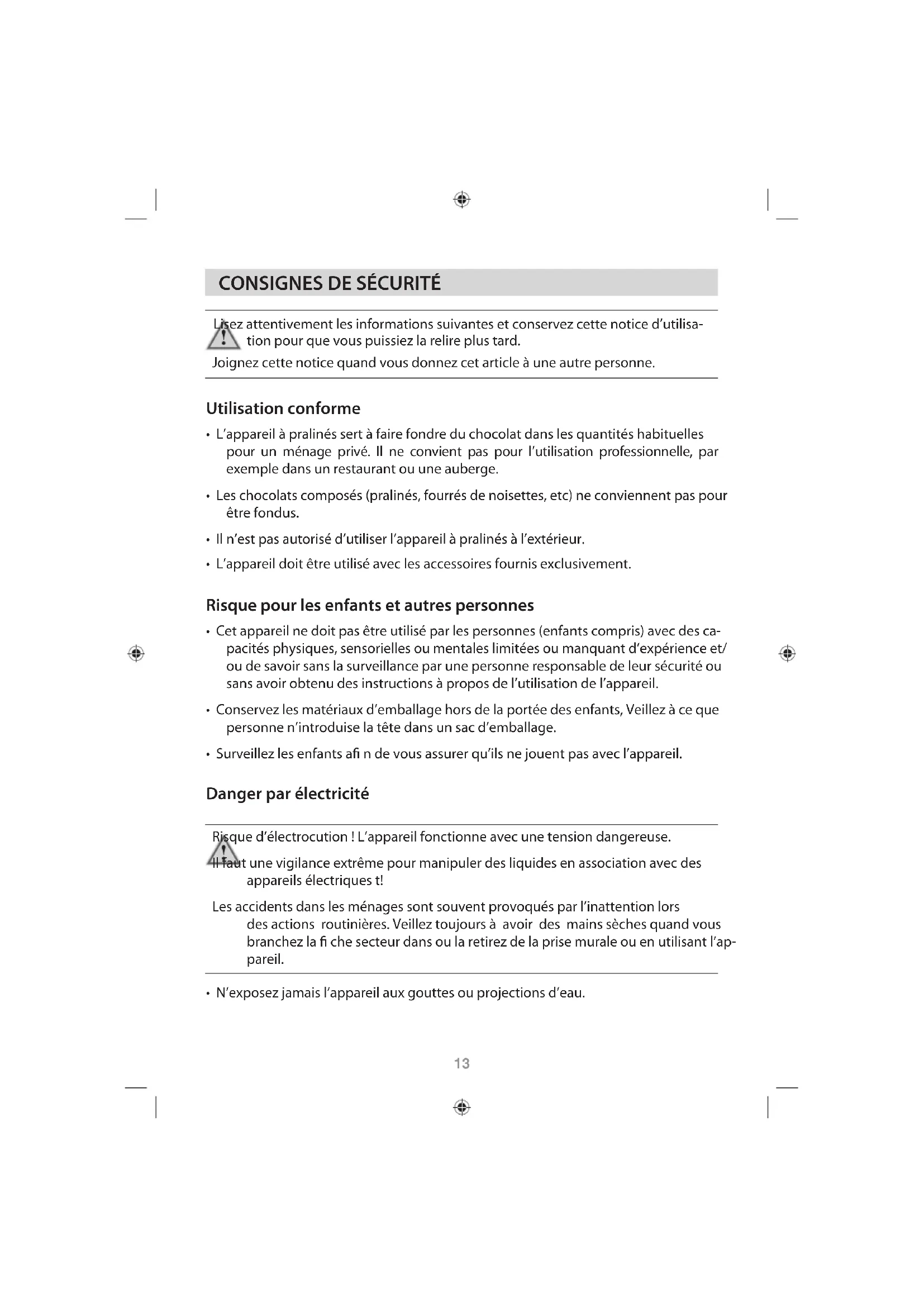 - N’immergez jamais l’appareil à pralinés et la che secteur dans de l’eau ou d’autres liquides. Risque d’électrocution ! N’utilisez pas l’appareil à proximité d’une source d’humidité comme un lavabo, par exemple.