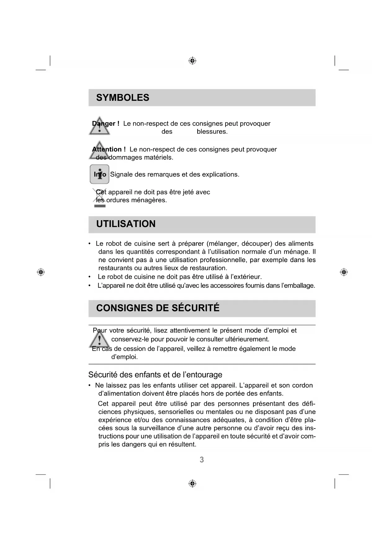 - Le robot de cuisine sert à préparer (mélanger, découper) des aliments dans les quantités correspondant à l'utilisation normale d'un ménage. Il ne convient pas à une utilisation professionnelle, par exemple dans les restaurants ou autres lieux de restauration. Le robot de cuisine ne doit pas être utilisé à l'extérieur. L'appareil ne doit être utilisé qu'avec les accessoires fournis dans l'emballage.