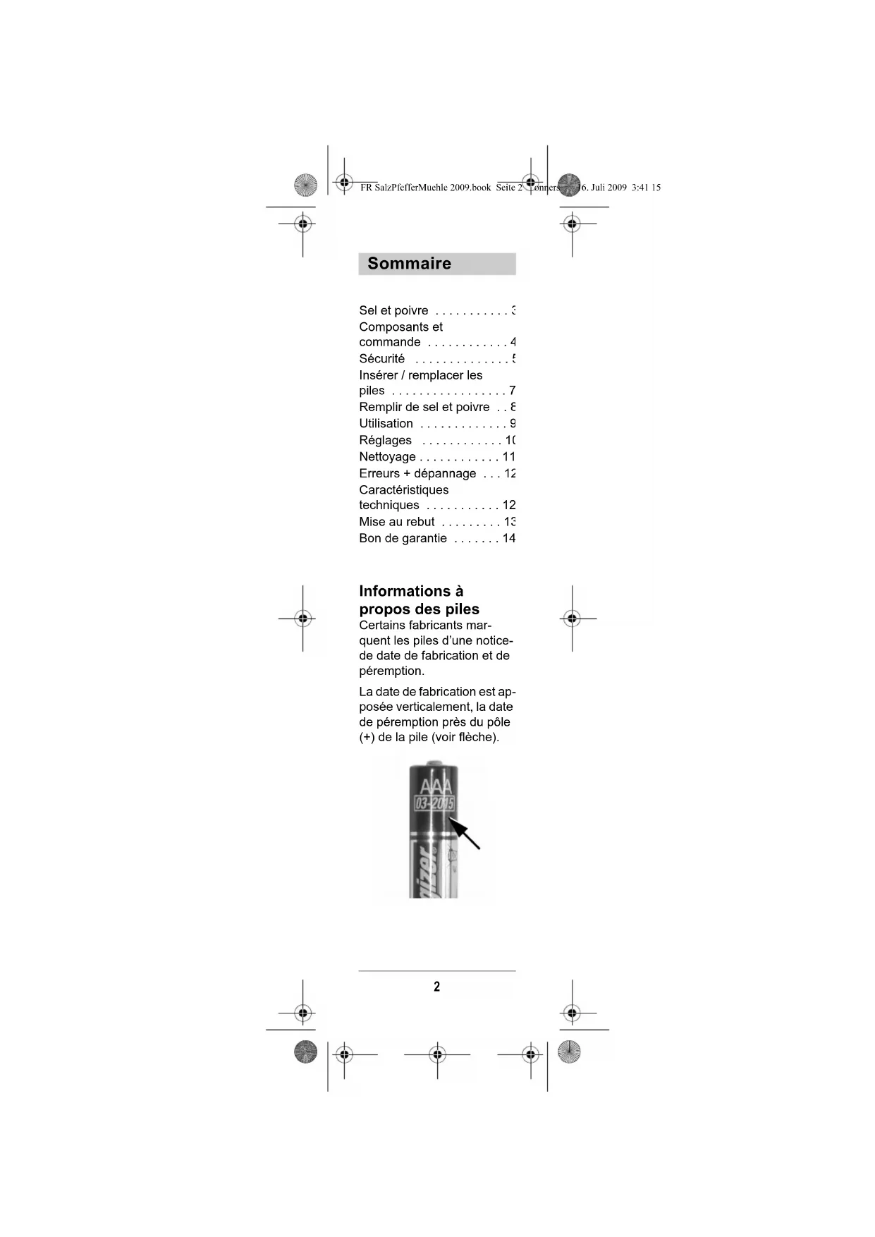 - Moulin électrique à sel et poivre FR SalzPfefferMuehle 2009.book Seite 1 Donnerstag, 16. Juli 2009 3:41 152 Informations à propos des piles Certains fabricants mar- quent les piles d’une notice- de date de fabrication et de péremption. La date de fabrication est ap- posée verticalement, la date de péremption près du pôle (+) de la pile (voir flèche). Sommaire Sel et poivre p. 3