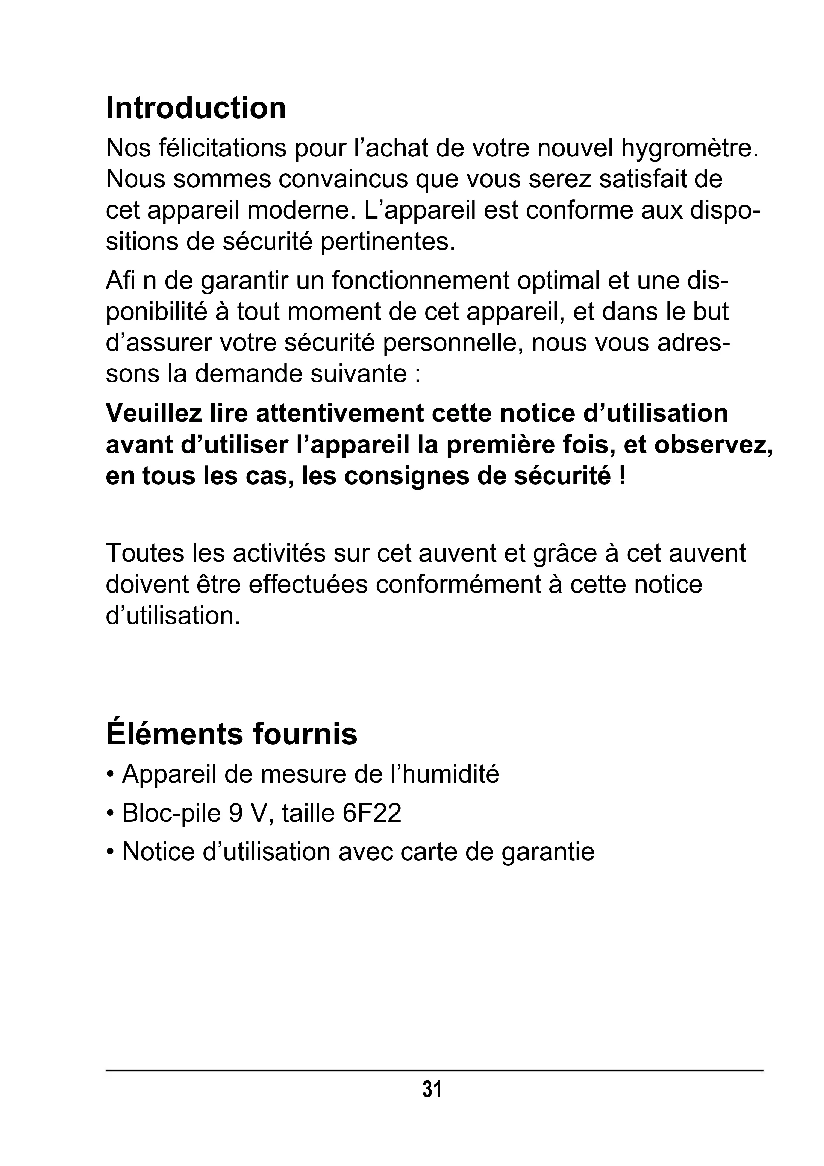 - Bewaar de vochtmeter op een droge en vorstvrije plaats binnenshuis. Haal de batterij eruit als u het ap- paraat langere tijd niet gebruikt.29 Storing en remedie Fout Mogelijke oorzaak en remedie Het meetresul- taat is duidelijk te hoog of te laag. Is het apparaat op het juiste materiaal ingesteld? zie pagina 26. Zijn de meetvoelers correct tegen het materiaal gedrukt? Herhaal de meting. Weergave in het display Lo of Hı. Het meetbereik is onderschreden of overschreden. Weergave in het display rea- geert niet. Is het slotsymbool in het display te zien? Druk de -toets 5 in. De weergave in het display is nauwelijks te onderscheiden. Batterij leeg. Zie pagina 24.30 Sommaire Introduction / Éléments fournis .................................... 31 Consignes de sécurité ................................................. 32 Utilisation conforme ................................................ 32 Danger pour les enfants et autres personnes ........ 33 Informations générales ........................................... 33 A propos des piles .................................................. 34 Mise au rebut .......................................................... 35 Spécifi cations techniques ............................................ 36 Déclaration de conformité ............................................ 36 Désignation des composants ...................................... 37 Utilisation ..................................................................... 38 Déballage ............................................................... 38 Insérer la pile .......................................................... 38 Avant de procéder aux mesures ............................ 39 Mesurer l’humidité .................................................. 40 Indicateur de la pile ................................................ 42 Nettoyage .................................................................... 42 Dysfonctionnements et dépannage ............................. 43 Garantie ....................................................................... 46 Carte de la garantie31 Introduction Nos félicitations pour l’achat de votre nouvel hygromètre. Nous sommes convaincus que vous serez satisfait de cet appareil moderne. L’appareil est conforme aux dispo- sitions de sécurité pertinentes. Afi n de garantir un fonctionnement optimal et une dis- ponibilité à tout moment de cet appareil, et dans le but d’assurer votre sécurité personnelle, nous vous adres- sons la demande suivante : Veuillez lire attentivement cette notice d’utilisation avant d’utiliser l’appareil la première fois, et observez, en tous les cas, les consignes de sécurité ! Toutes les activités sur cet auvent et grâce à cet auvent doivent être effectuées conformément à cette notice d’utilisation. Éléments fournis