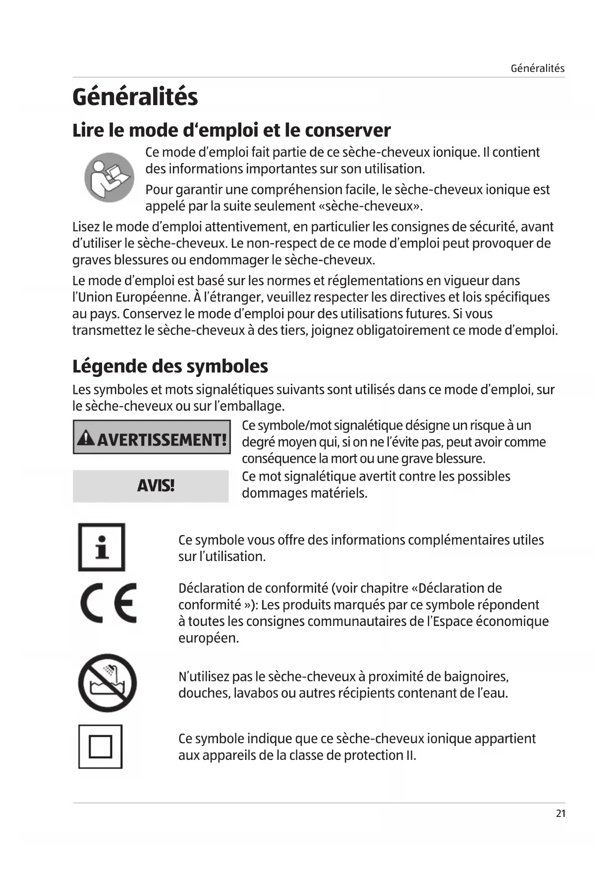 Généralités Lire le mode d‘emploi et le conserver Ce mode d’emploi fait partie de ce sèche-cheveux ionique. Il contient des informations importantes sur son utilisation. Pour garantir une compréhension facile, le sèche-cheveux ionique est appelé par la suite seulement «sèche-cheveux». Lisez le mode d’emploi attentivement, en particulier les consignes de sécurité, avant d’utiliser le sèche-cheveux. Le non-respect de ce mode d’emploi peut provoquer de graves blessures ou endommager le sèche-cheveux. Le mode d’emploi est basé sur les normes et réglementations en vigueur dans l’Union Européenne. À l’étranger, veuillez respecter les directives et lois spécifiques au pays. Conservez le mode d’emploi pour des utilisations futures. Si vous transmettez le sèche-cheveux à des tiers, joignez obligatoirement ce mode d’emploi. Légende des symboles Les symboles et mots signalétiques suivants sont utilisés dans ce mode d’emploi, sur le sèche-cheveux ou sur l’emballage. AVERTISSEMENT! Ce symbole/mot signalétique désigne un risque à un degré moyen qui, si on ne l’évite pas, peut avoir comme conséquence la mort ou une grave blessure. AVIS! Ce mot signalétique avertit contre les possibles dommages matériels. Ce symbole vous offre des informations complémentaires utiles sur l’utilisation. Déclaration de conformité (voir chapitre «Déclaration de conformité »): Les produits marqués par ce symbole répondent à toutes les consignes communautaires de l’Espace économique européen. N’utilisez pas le sèche-cheveux à proximité de baignoires, douches, lavabos ou autres récipients contenant de l’eau. Ce symbole indique que ce sèche-cheveux ionique appartient aux appareils de la classe de protection II. Buch_CH_ProfHaartrockner .indb 21Buch_CH_ProfHaartrockner .indb 21 14.09.2021 11:10:4514.09.2021 11:10:45Sécurité