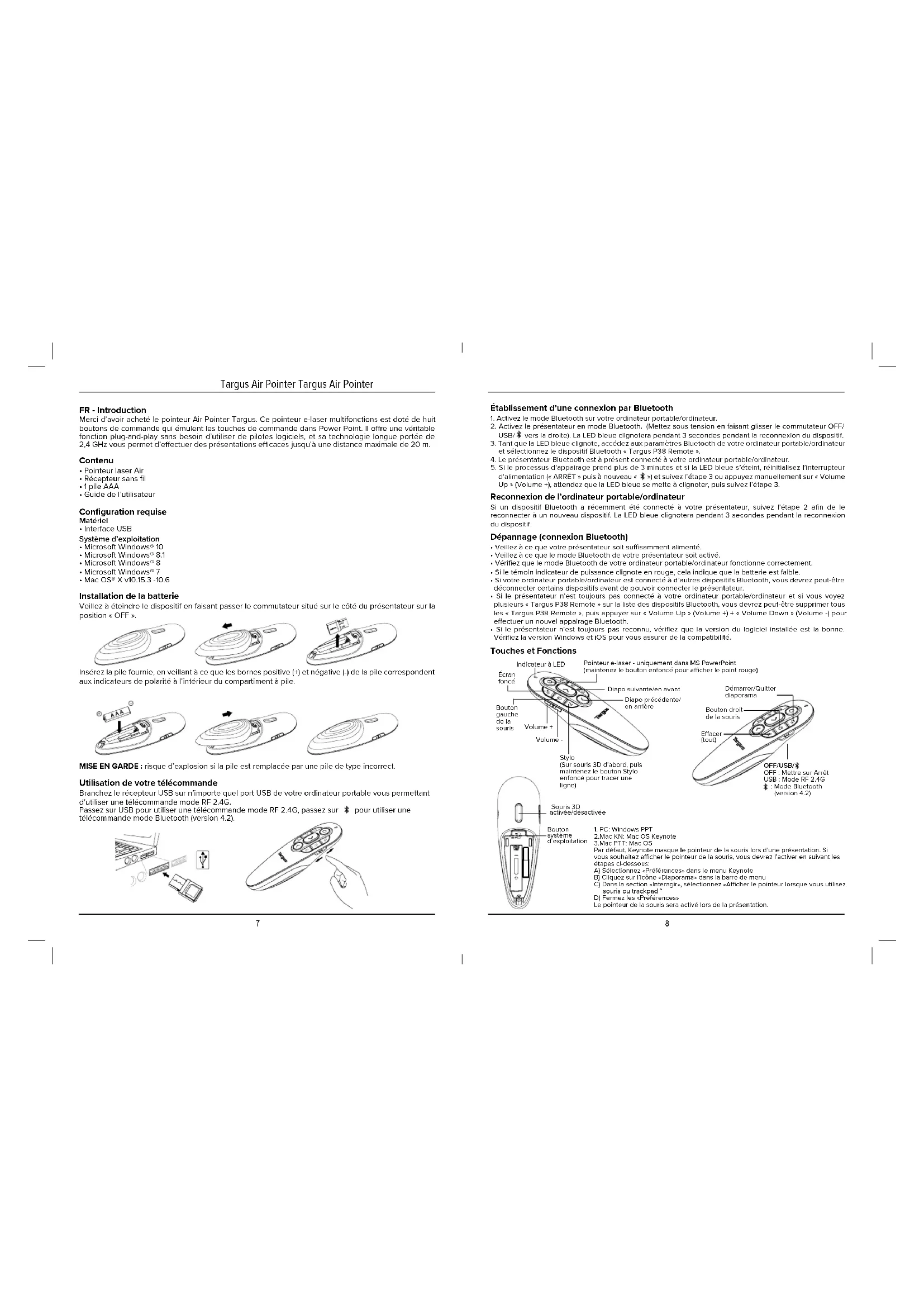 - Veillez à ce que la télécommande de présentation se trouve à 20 m de son récepteur, pas plus.• Augmentez la distance entre le récepteur de la télécommande de présentation et les unités de base des autres dispositifs sans fil.• Éteignez tous les dispositifs sans fil et leurs unités de base se trouvant à proximité du récepteur de la télécommande de présentation.• Replacez la pile. Télécommande de présentation sans fil (AMP38) Caractéristiques produit (pour Taiwan) Récepteur sans fil (AMP38R) Gamme de fréquences 2,4 G Gamme de fréquences Bluetooth Type de pile Portée de communication RF 2.4G ecace Portée de communication Bluetooth ecace 2,4G Puissance maximale EIRP (dBm) Puissance maximale EIRP Bluetooth (dBm) Puissance nominale Gamme de fréquences 2,4 G Interface 2,4G Puissance maximale EIRP (dBm) Puissance nominale 2404MHz-2478MHz 2402MHz-2480MHz Pile AAA 20 mètres max. 10 mètres max. 94.77dBuV/m -5.75dBm 1.5V 100mA 2404MHz-2478MHz USB 1.1/2.0 81.73dBuV/m 5V 100mA Déclaration de conformité du fournisseurPar FCC Partie 2 Section 2.1077 (a)Fabricant/Partie responsable :Adresse :Targus International LLC1211 North Miller Street,Anaheim, CA 92806 USATél. : 1-714-765-5555Téléc. : 1-714-765-5599Internet : www.targus.comDéclare, par les présentes, que le produitDénomination commerciale : TargusNom du produit : Dispositif sans fil, Récepteur sans filNuméro du modèle : AMP38 (Dispositif sans fil), AMP38R (Récepteur sans fil)Conforme aux spécifications suivantesFCC CFR, titre 47, section 15, sous-section B et les limites standard ANSI C63.4-2014 Pour obtenir les données et les résultats de test, consultez le rapport de test numéro : 190522027SZN-001Renseignements supplémentaires :Cet appareil est conforme à la section 15 des règlements de la FCC. Le fonctionnement est assujetti aux deux conditions suivantes : (1) Cet appareil ne doit pas causer d’interférences nuisibles, et (2) cet appareil doit accepter toute interférence reçue, y compris les interférences pouvant entraîner un fonctionnement indésirable.Réalisateur, Targus International LLCRôle Titre28/06/2019 Date CF Ngoh Nom Signature pour et au nom de Targus CZ - Úvod Děkujeme vám za zakoupení Targus Air Pointer. Toto kombinované laserové ukazovátko obsahuje osm ovládacích tlačítek, která napodobují příkazové klávesy v Power Point. Nabízí opravdovou funkci plug-and-play bez nutnosti softwarových ovladačů; technologie 2,4 GHz umožňuje efektivní prezentaci rychlostí až 66 “/ 20 m. Obsah