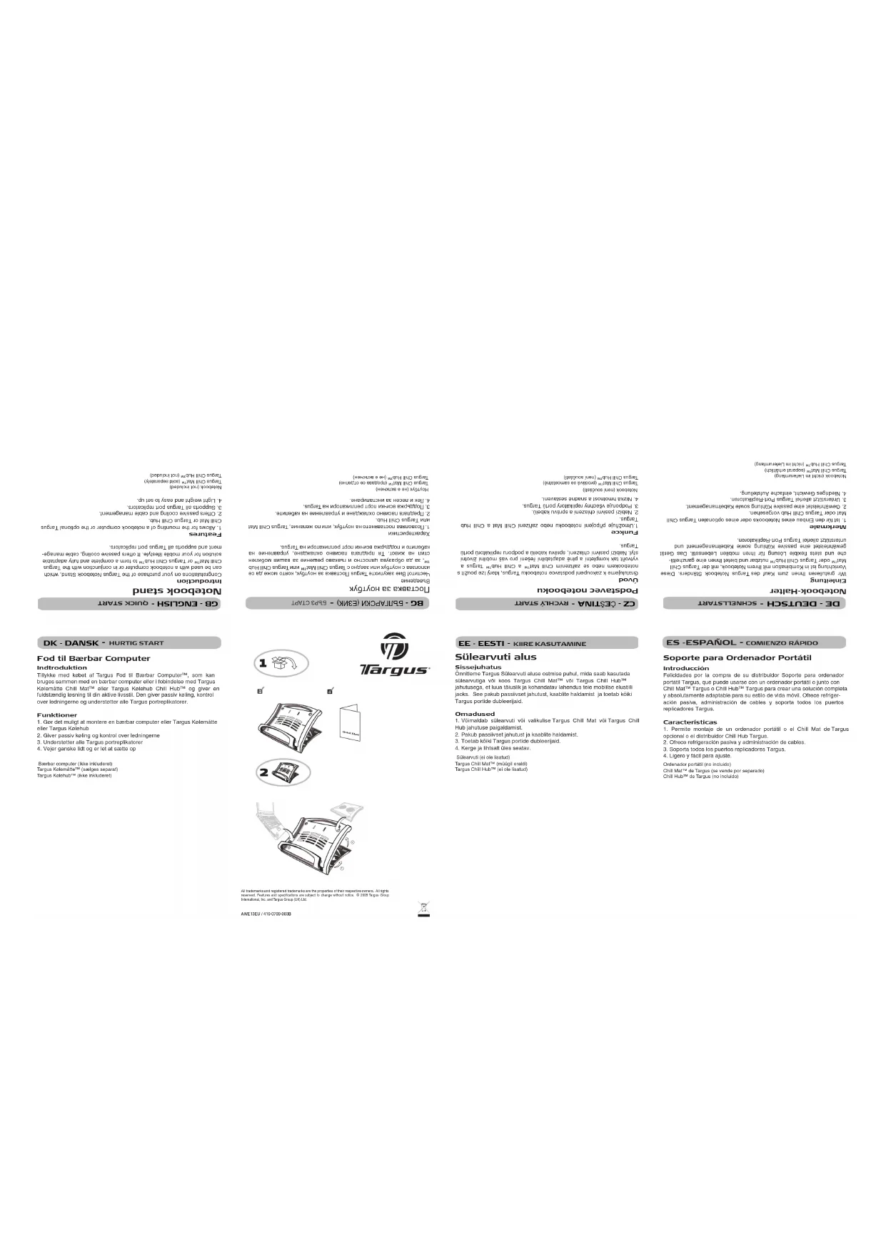Kannettava tietokone (ei kuulu pakkaukseen) Targus Chill Mat-jäähdytin™(myydään erikseen) Targus Chill Hub -jäähdytin™ (ei kuulu pakkaukseen) Kannettavan tietokoneen teline Introduction Félicitations pour votre achat du Stand pour ordinateur portable Targus, qui peut être utilisé avec un ordinateur portable ou en association avec le « Chill Mat »™ Targus ou encore « Chill Hub »™ Targus pour former une solution complète et entièrement adaptable à votre style de vie mobile. Ce dernier offre un refroidissement passif et facilite le rangement du câble tout en maintenant l'utilisation d'autres duplicateurs de port Targus. Caractéristiques