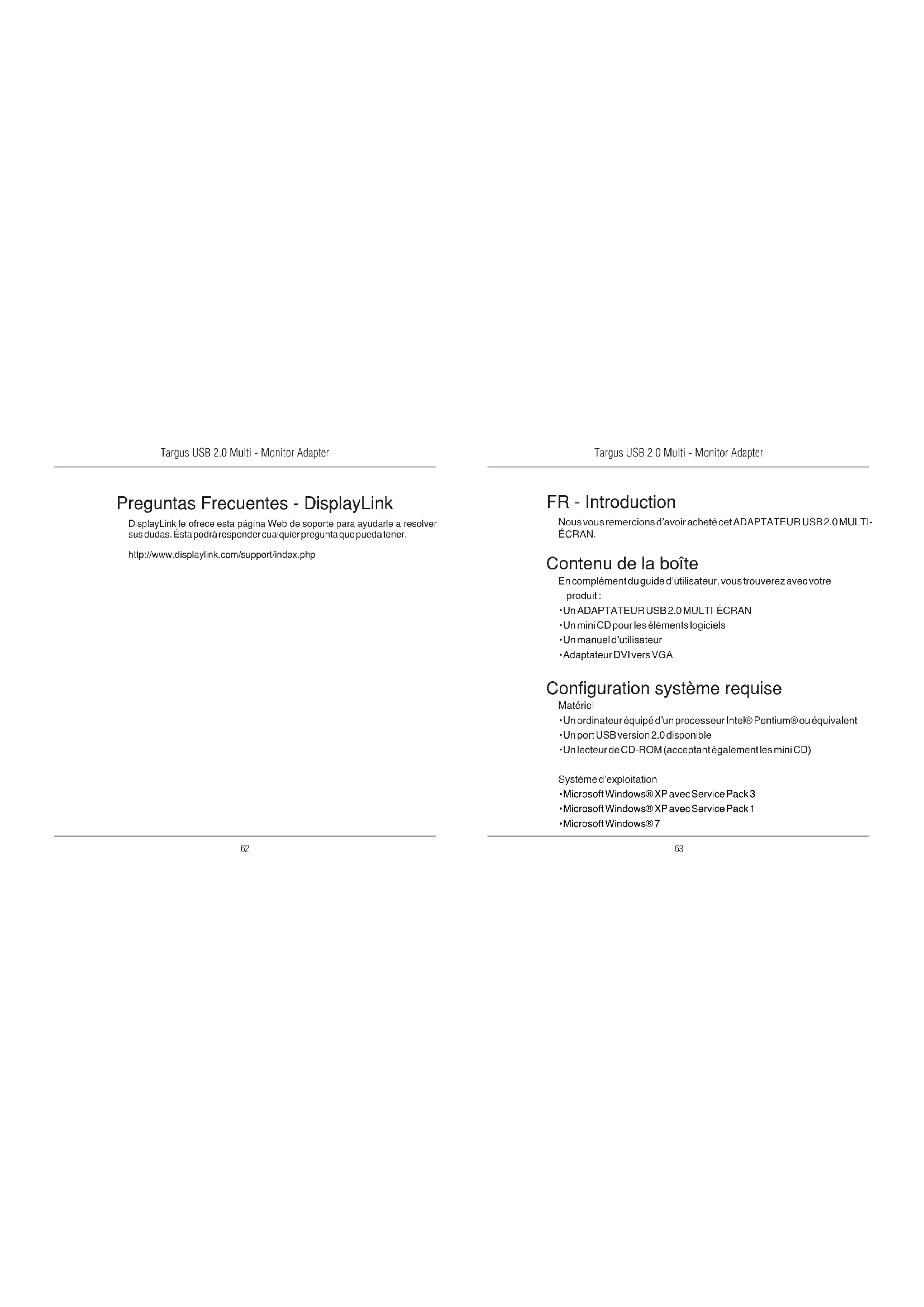 Contrôle de l’affichage depuis la fenêtre Propriétés d’affichage de Windows (pour Windows 7) Vous pouvez congurer le mode vidéo de l’adaptateur depuis la fenêtre Propriétés d’afchage de Windows. Depuis Windows 7, cliquez avec le bouton droit de la souris sur le Bureau, cliquez sur l’option “Personnaliser”, sélectionnez “Afchage” puis le lien “Modier les paramètres d’afchage”. Vous pouvez également cliquer avec le bouton droit de la souris sur l’icône “Targus USB Video adapter” (“Adaptateur vidéo USB de Targus”) dans la zone de notication et choisir “advance” (Avancé). La liste déroulante “multiple display” (Afchages multiples) vous propose diverses congurations d’afchage. Choisissez une conguration et cliquez sur “apply” (“Appliquer”). Le contenu de l’écran est réactualisé. Sélectionnez “keep changes” (“Conserver les modications”) pour valider vos choix. Mises à jour automatiques DisplayLink a équipé l’adaptateur d’une fonction de mise à jour automatique an que son adaptateur graphique travaille toujours avec les dernières ver- sions du pilote et du logiciel, fournissant à l’utilisateur le meilleur de ses performances et davantage de stabilité. Déconnexion de l’adaptateur Lorsque vous éteignez l’adaptateur ou débranchez son câble USB de l’ordinateur, l’écran secondaire devient blanc. Toutes les fenêtres et toutes les icônes repassent sur l’écran principal. À la reconnexion ou à la remise sous tension de l’adaptateur, la dernière conguration d’afchage est réactivée mais aucune des fenêtres et des icônes alors afchées ne réapparaissent.Targus USB 2.0 Multi - Monitor Adapter
