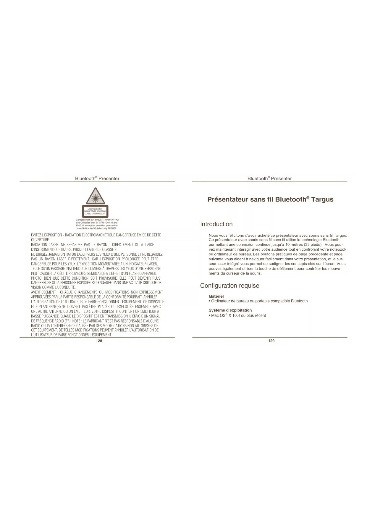X 10.4 ou plus récent Nous vous félicitons d’avoir acheté ce présentateur avec souris sans l Targus. Ce présentateur avec souris sans l sans l utilise la technologie Bluetooth permettant une connexion continue jusqu’à 10 mètres (33 pieds). Vous pou- vez maintenant interagir avec votre audience tout en contrôlant votre notebook ou ordinateur de bureau. Les boutons pratiques de page précédente et page suivante vous aident à naviguer facilement dans votre présentation, et le cur- seur laser intégré vous permet de surligner les concepts clés sur l’écran. Vous pouvez également utiliser la touche de délement pour contrôler les mouve- ments du curseur de la souris.Bluetooth