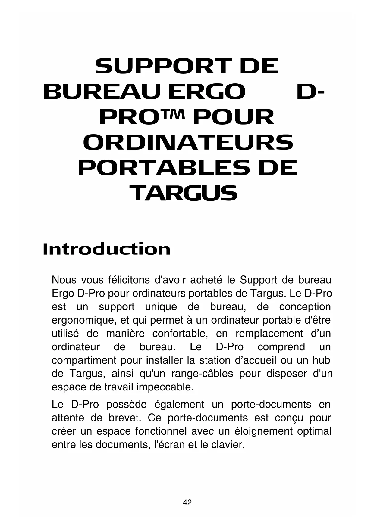 Nous vous félicitons d'avoir acheté le Support de bureau Ergo D-Pro pour ordinateurs portables de Targus. Le D-Pro est un support unique de bureau, de conception ergonomique, et qui permet à un ordinateur portable d'être utilisé de manière confortable, en remplacement d'un ordinateur de bureau. Le D-Pro comprend un compartiment pour installer la station d'accueil ou un hub de Targus, ainsi qu'un range-câbles pour disposer d'un espace de travail impeccable.