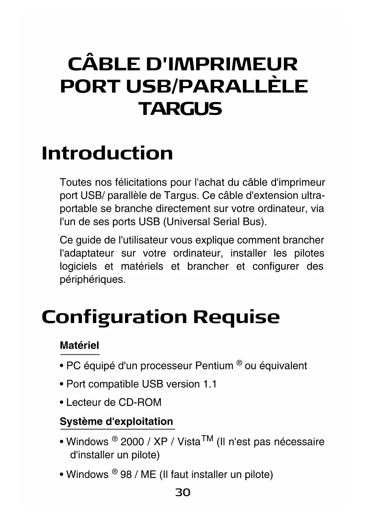 TARGUS Introduction Toutes nos félicitations pour l'achat du câble d'imprimeur port USB/ parallèle de Targus. Ce câble d'extension ultra- portable se branche directement sur votre ordinateur, via l'un de ses ports USB (Universal Serial Bus). Ce guide de l'utilisateur vous explique comment brancher l'adaptateur sur votre ordinateur, installer les pilotes logiciels et matériels et brancher et configurer des périphériques. Configuration Requise Matériel
