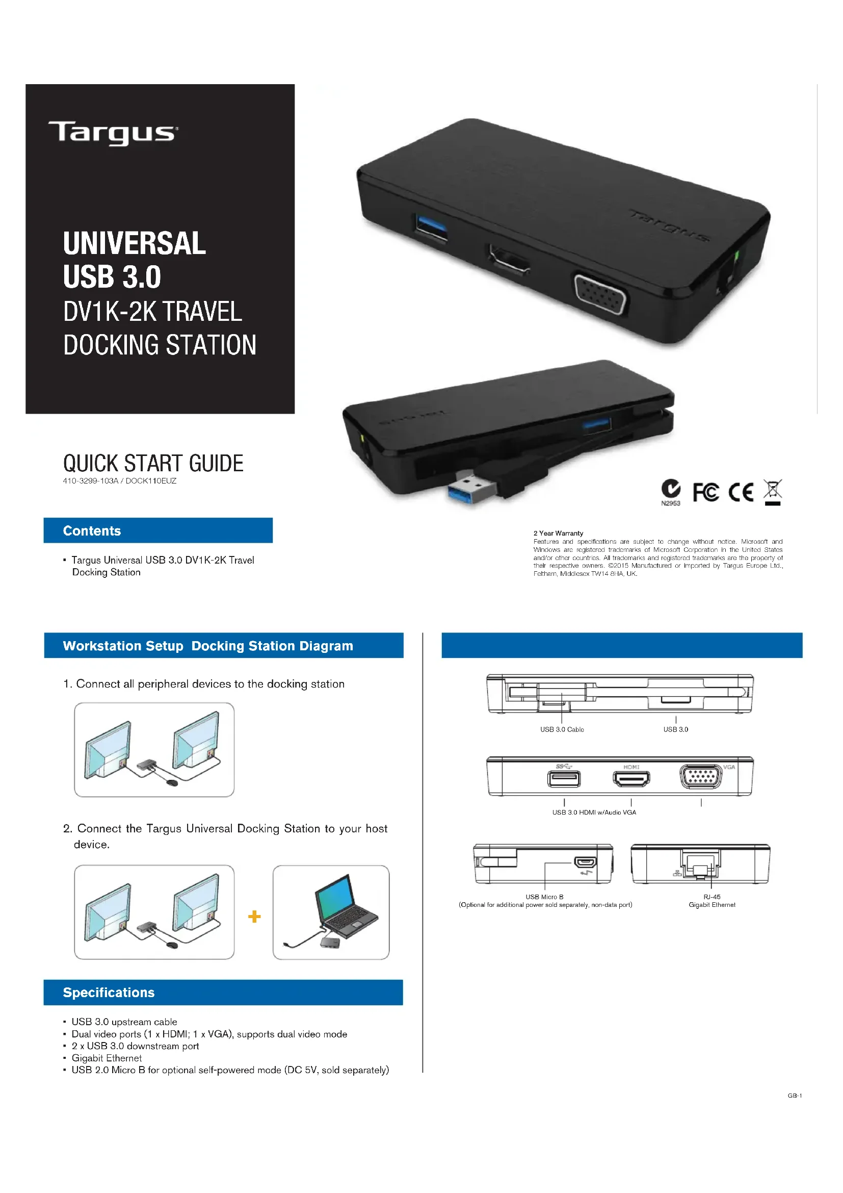 - Station d'accueil USB 3.0 DV1K-2K TravelUSB de Targus FR-1 1. Branchez tous les périphériques à la station d'accueil.2. Connectez la station d'accueil universelle Targus à votre périphérique hôte.
