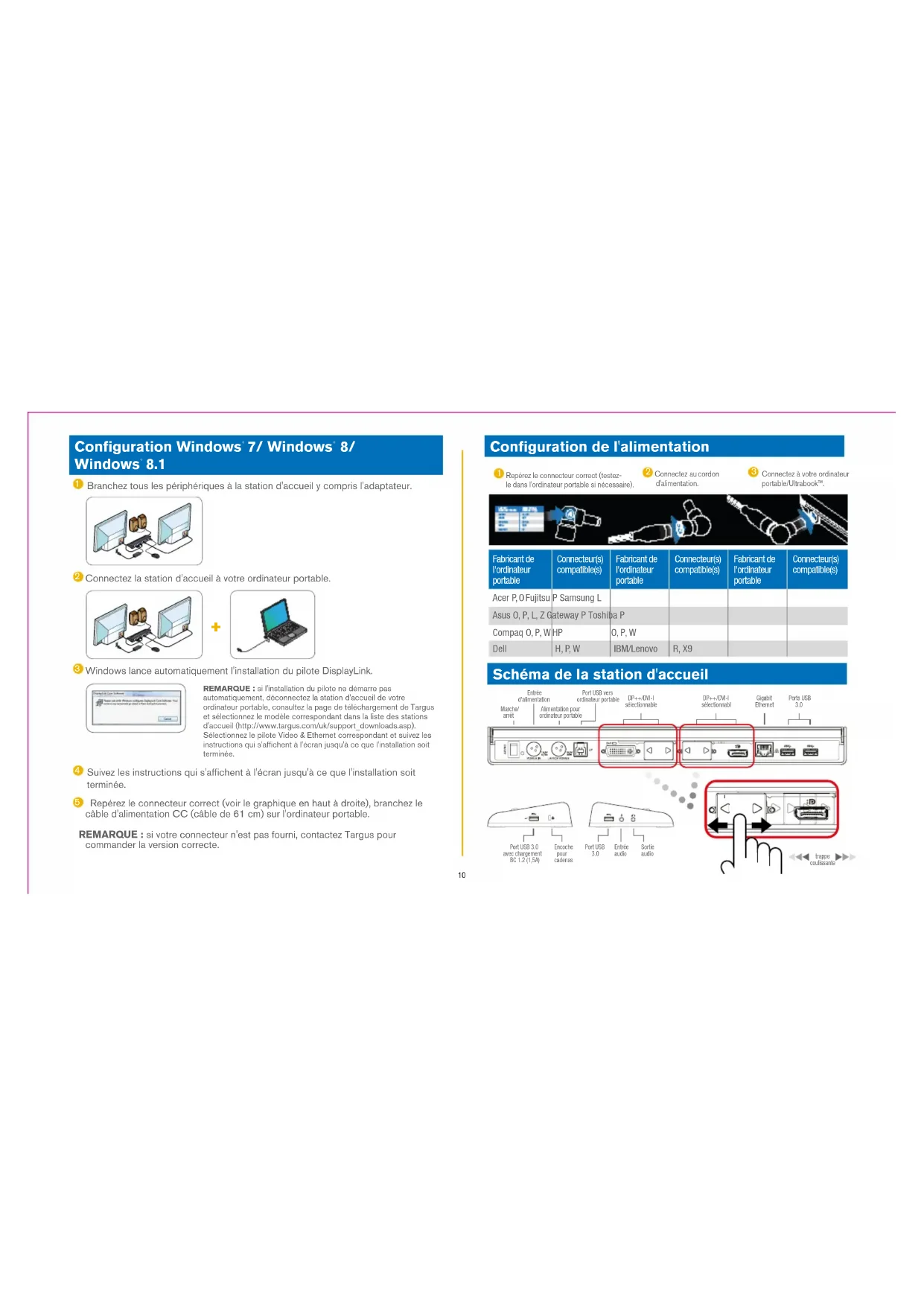 Repérez le connecteur correct (testez- le dans l'ordinateur portable si nécessaire). Connectez au cordon d'alimentation. Connectez à votre ordinateur portable/Ultrabook™. Fabricant de l'ordinateur portable Connecteur(s) compatible(s) Fabricant de l'ordinateur portable Connecteur(s) compatible(s) Fabricant de l'ordinateur portable Connecteur(s) compatible(s) Acer P, O Fujitsu P Samsung L Asus O, P, L, Z Gateway P Toshiba P Compaq O, P, W HP O, P, W Dell H, P, W IBM/Lenovo R, X9 Marche/arrêtPort USB vers ordinateur portablePorts USB Entrée d'alimentationAlimentation pour ordinateur portableGigabit EthernetDP++/DVI-IsélectionnableDP++/DVI-Isélectionnabl Entrée audioPort USB Sortie audioEncoche pour cadenasPort USB 3.0avec chargement BC 1.2 (1,5A)REMARQUE : si l'installation du pilote ne démarre pas automatiquement, déconnectez la station d'accueil de votre ordinateur portable, consultez la page de téléchargement de Targus et sélectionnez le modèle correspondant dans la liste des stations d'accueil (http://www.targus.com/uk/support_downloads.asp). Sélectionnez le pilote Video & Ethernet correspondant et suivez les instructions qui s'affichent à l'écran jusqu'à ce que l'installation soit terminée.