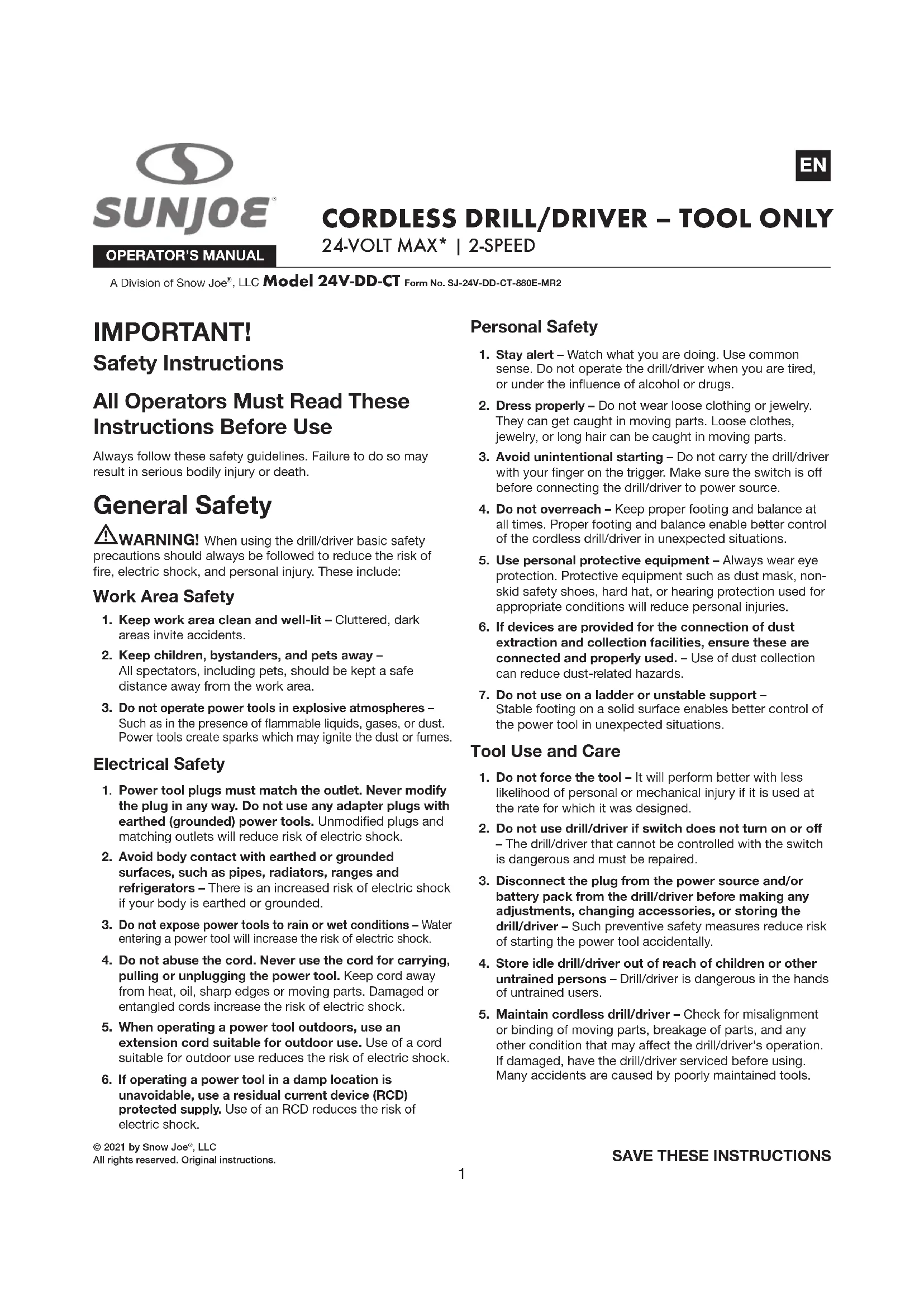 24VDDCT - Perceuse Sun Joe - Notice d'utilisation et mode d'emploi gratuit