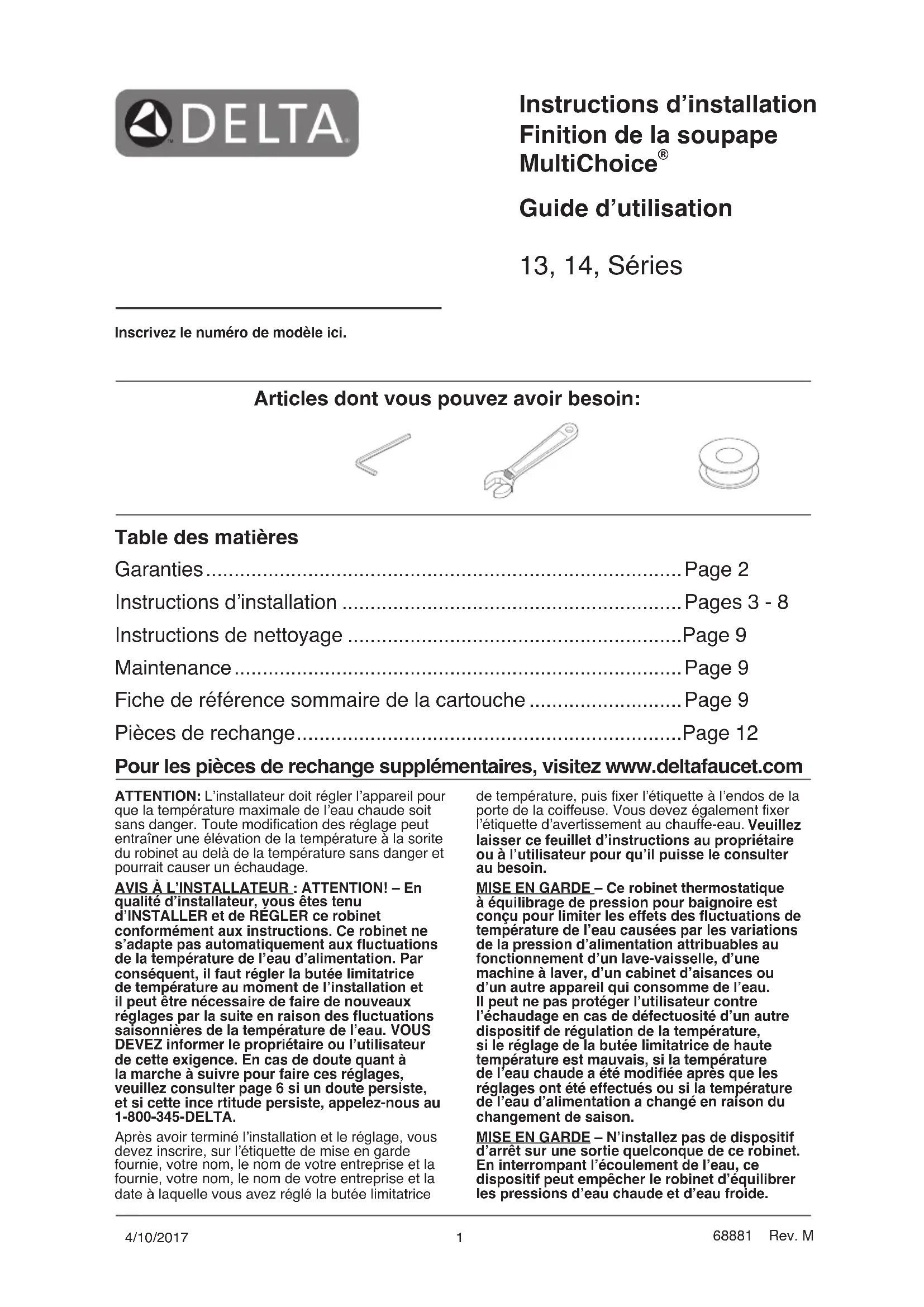 Guide d’utilisation 13, 14, Séries Inscrivez le numéro de modèle ici. Articles dont vous pouvez avoir besoin: Table des matières Garanties .................................................................................... Page 2 Instructions d’installation ............................................................Pages 3 - 8 Instructions de nettoyage ...........................................................Page 9 Maintenance ............................................................................... Page 9 Fiche de référence sommaire de la cartouche ...........................Page 9 Pièces de rechange ....................................................................Page 12 Pour les pièces de rechange supplémentaires, visitez www.deltafaucet.com de température, puis xer l’étiquette à l’endos de la porte de la coiffeuse. Vous devez également xer l’étiquette d’avertissement au chauffe-eau. Veuillez laisser ce feuillet d’instructions au propriétaire ou à l’utilisateur pour qu’il puisse le consulter au besoin. MISE EN GARDE – Ce robinet thermostatique à équilibrage de pression pour baignoire est conçu pour limiter les effets des uctuations de température de l’eau causées par les variations de la pression d’alimentation attribuables au fonctionnement d’un lave-vaisselle, d’une machine à laver, d’un cabinet d’aisances ou d’un autre appareil qui consomme de l’eau. Il peut ne pas protéger l’utilisateur contre l’échaudage en cas de défectuosité d’un autre dispositif de régulation de la température, si le réglage de la butée limitatrice de haute température est mauvais, si la température de l’eau chaude a été modiée après que les réglages ont été effectués ou si la température de l’eau d’alimentation a changé en raison du changement de saison. MISE EN GARDE – N’installez pas de dispositif d’arrêt sur une sortie quelconque de ce robinet. En interrompant l’écoulement de l’eau, ce dispositif peut empêcher le robinet d’équilibrer les pressions d’eau chaude et d’eau froide. ATTENTION: L’installateur doit régler l’appareil pour que la température maximale de l’eau chaude soit sans danger. Toute modication des réglage peut entraîner une élévation de la température à la sorite du robinet au delà de la température sans danger et pourrait causer un échaudage. AVIS À L’INSTALLATEUR : ATTENTION! – En qualité d’installateur, vous êtes tenu d’INSTALLER et de RÉGLER ce robinet conformément aux instructions. Ce robinet ne s’adapte pas automatiquement aux uctuations de la température de l’eau d’alimentation. Par conséquent, il faut régler la butée limitatrice de température au moment de l’installation et il peut être nécessaire de faire de nouveaux réglages par la suite en raison des uctuations saisonnières de la température de l’eau. VOUS DEVEZ informer le propriétaire ou l’utilisateur de cette exigence. En cas de doute quant à la marche à suivre pour faire ces réglages, veuillez consulter page 6 si un doute persiste, et si cette ince rtitude persiste, appelez-nous au 1-800-345-DELTA. Après avoir terminé l’installation et le réglage, vous devez inscrire, sur l’étiquette de mise en garde fournie, votre nom, le nom de votre entreprise et la fournie, votre nom, le nom de votre entreprise et la date à laquelle vous avez réglé la butée limitatrice