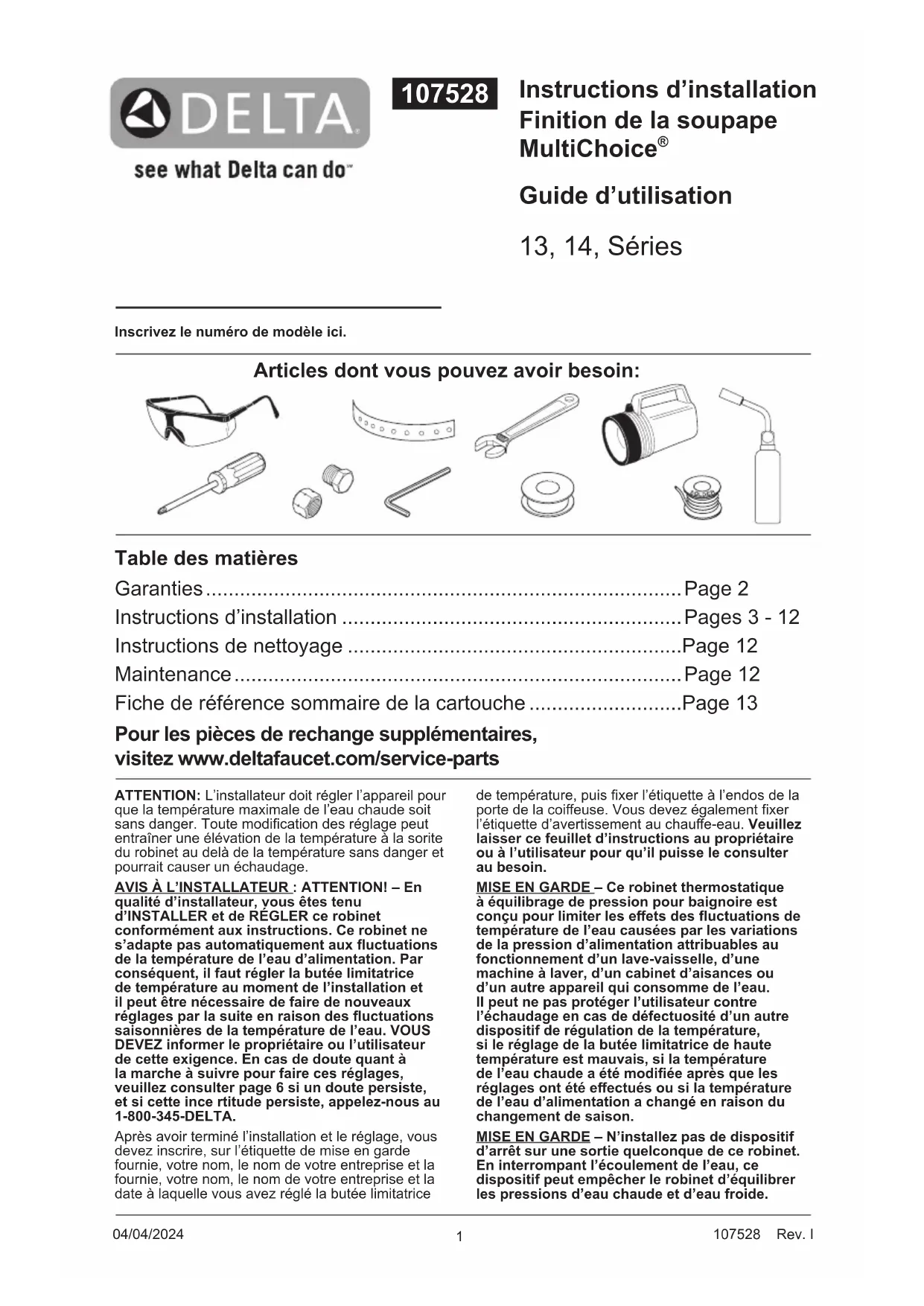 Guide d’utilisation 13, 14, Séries Inscrivez le numéro de modèle ici. Articles dont vous pouvez avoir besoin: Table des matières Garanties .................................................................................... Page 2 Instructions d’installation ............................................................Pages 3 - 12 Instructions de nettoyage ...........................................................Page 12 Maintenance ............................................................................... Page 12 Fiche de référence sommaire de la cartouche ...........................Page 13 Pour les pièces de rechange supplémentaires, visitez www.deltafaucet.com/service-parts de température, puis xer l’étiquette à l’endos de la porte de la coieuse. Vous devez également xer l’étiquette d’avertissement au chaue-eau. Veuillez laisser ce feuillet d’instructions au propriétaire ou à l’utilisateur pour qu’il puisse le consulter au besoin. MISE EN GARDE – Ce robinet thermostatique à équilibrage de pression pour baignoire est conçu pour limiter les eets des uctuations de température de l’eau causées par les variations de la pression d’alimentation attribuables au fonctionnement d’un lave-vaisselle, d’une machine à laver, d’un cabinet d’aisances ou d’un autre appareil qui consomme de l’eau. Il peut ne pas protéger l’utilisateur contre l’échaudage en cas de défectuosité d’un autre dispositif de régulation de la température, si le réglage de la butée limitatrice de haute température est mauvais, si la température de l’eau chaude a été modiée après que les réglages ont été eectués ou si la température de l’eau d’alimentation a changé en raison du changement de saison. MISE EN GARDE – N’installez pas de dispositif d’arrêt sur une sortie quelconque de ce robinet. En interrompant l’écoulement de l’eau, ce dispositif peut empêcher le robinet d’équilibrer les pressions d’eau chaude et d’eau froide. ATTENTION: L’installateur doit régler l’appareil pour que la température maximale de l’eau chaude soit sans danger. Toute modication des réglage peut entraîner une élévation de la température à la sorite du robinet au delà de la température sans danger et pourrait causer un échaudage. AVIS À L’INSTALLATEUR : ATTENTION! – En qualité d’installateur, vous êtes tenu d’INSTALLER et de RÉGLER ce robinet conformément aux instructions. Ce robinet ne s’adapte pas automatiquement aux uctuations de la température de l’eau d’alimentation. Par conséquent, il faut régler la butée limitatrice de température au moment de l’installation et il peut être nécessaire de faire de nouveaux réglages par la suite en raison des uctuations saisonnières de la température de l’eau. VOUS DEVEZ informer le propriétaire ou l’utilisateur de cette exigence. En cas de doute quant à la marche à suivre pour faire ces réglages, veuillez consulter page 6 si un doute persiste, et si cette ince rtitude persiste, appelez-nous au 1-800-345-DELTA. Après avoir terminé l’installation et le réglage, vous devez inscrire, sur l’étiquette de mise en garde fournie, votre nom, le nom de votre entreprise et la fournie, votre nom, le nom de votre entreprise et la date à laquelle vous avez réglé la butée limitatrice