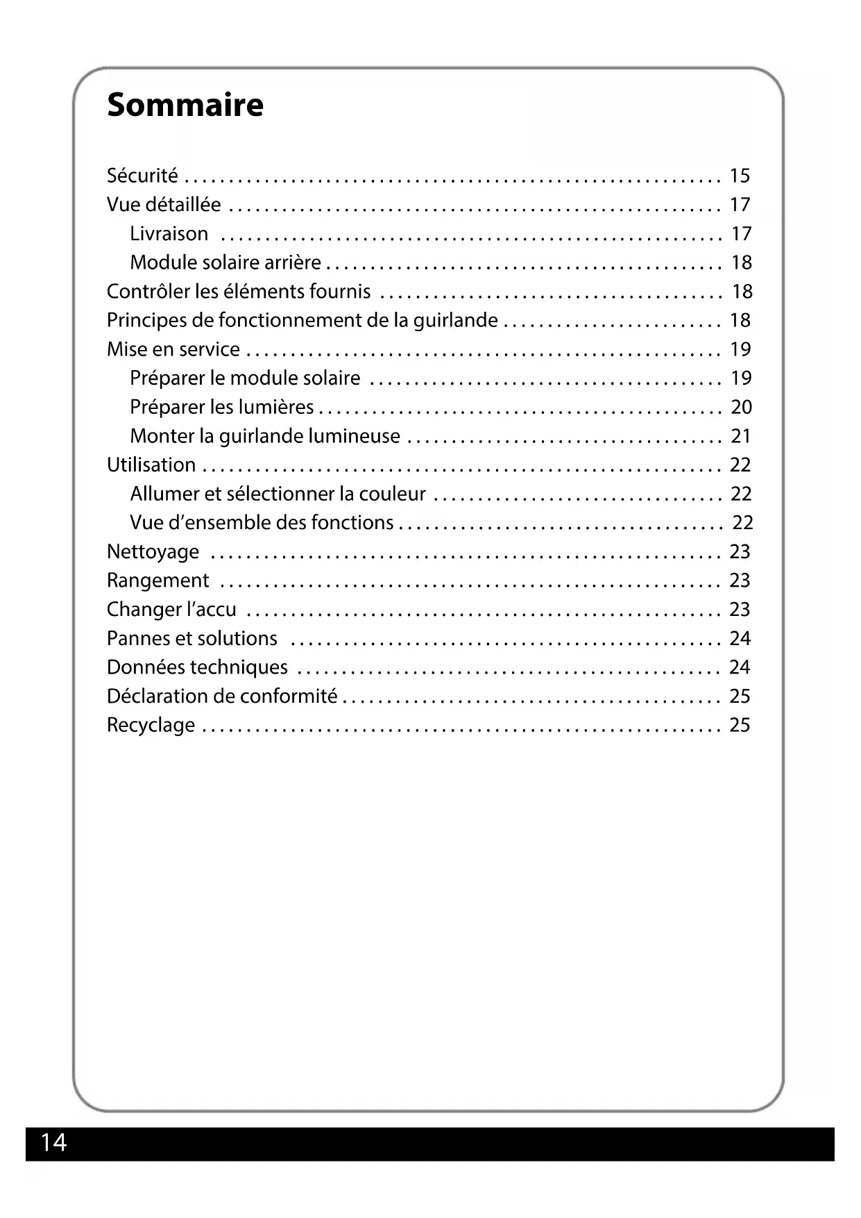 - Recyclage Druckbuch Solar-Bodenlichterkette BEL Kubus QUIGG.book Seite 14 Dienstag, 27. November 2018 10:48 1015 Sécurité Lire le mode d’emploi et le conserver Lisez attentivement les consignes qui sui- vent et conservez ce mode d’emploi afin de pou- voir le reconsulter ultérieure- ment. Quand vous passez les guirlandes à une autre per- sonne, passez-lui aussi ce mode d’emploi. Consignes importantes z Cet appareil peut être utili- sé par des enfants à partir de 8 ans ainsi que par des personnes à capacités phy- siques, sensorielles ou mentales réduites ou bien manquant d’expérience et/ ou de connaissances à la condition que ces per- sonnes soient surveillées ou qu’elles aient reçu les instructions nécessaires pour se servir de l’appareil en toute sécurité et aient compris les dangers que comporte son utilisation. Les enfants ne doivent pas jouer avec l’appareil. Le nettoyage et la mainte- nance utilisateur ne doi- vent pas être effectués par des enfants à moins qu’ils aient 8 ans ou plus et soient sous surveillance. z Ne permettez pas aux en- fants de jouer avec les feuilles d’emballage et de protection. En cas d’inges- tion, il y a risque d’étouffe- ment. Veillez à ce que per- sonne ne mette le sachet d´emballage sur la tête. z N'utilisez pas la guirlande lumineuse quand elle est encore dans l'emballage. Utilisation conforme z La guirlande lumineuse est conçue pour une utilisation à l’extérieur et à des fins d’éclairage décoratif dans un cadre privé. z La guirlande lumineuse n’est pas conçue pour l’éclairage des pièces ou à des fins industrielles. Risque de blessures ! z N'utilisez jamais la guirlande lumi- neuse avec des piles normales. Dan- ger d'explosion ! z Ne pas jeter les accus dans le feu et ne pas court-circuiter. Danger d'explosion ! z En cas de mauvaise utilisation, du liquide peut sortir de l’accu. Évitez tout contact. En cas de contact for- tuit, rincer avec de l’eau. Si le liquide entre en contact avec les yeux, demandez l’aide complémentaire d’un médecin. Le liquide d’accu peut provoquer des irritations cuta- nées ou des brûlures. Druckbuch Solar-Bodenlichterkette BEL Kubus QUIGG.book Seite 15 Dienstag, 27. November 2018 10:48 1016 z Disposez les câbles de raccorde- ment de telle manière qu’ils ne représentent pas un risque de chute. Risque de dommage ! z La guirlande lumineuse est proté- gée contre l’humidité mais ne peut pas être plongée dans l’eau. Les lampes doivent être bien assem- blées et totalement raccordées. Veillez ce faisant au bon positionne- ment du couvercle du comparti- ment de l’accu. z Il n'est pas nécessaire de remplacer les LED en raison de leur longue durée de vie. Les LED ne peuvent et ne doivent pas être remplacées. Quand la source de lumière est arrivée en fin de vie, il faut rempla- cer l’ensemble de la guirlande. z N’utilisez pas la guirlande lumi- neuse quand la guirlande lumi- neuse elle-même, le module solaire ou le câble de raccordement a des traces visibles de dommages. z Le module solaire ne peut être collé, couvert ou peint. z N’utilisez que l’accu fourni. N’utili- sez aucun autre accu et aucune bat- terie z N’altérez en rien l’appareil. Ne faites réaliser les réparations que par un atelier spécialisé pour éviter les dangers. z N'utilisez pas de détergents chimiques agressifs ou abrasifs ni des éponges dures etc. pour net- toyer. z Dès que la lumière irradie le module solaire module solaire, du courant continu est produit. N’utilisez aucun autre module solaire que celui livré. Le module solaire est adapté à la puissance de la guir- lande lumineuse et de l’accu. L’utili- sation d’un autre module solaire peut provoquer des dommages à l'article. z Tout couvercle de protection brisé doit être remplacé. Druckbuch Solar-Bodenlichterkette BEL Kubus QUIGG.book Seite 16 Dienstag, 27. November 2018 10:48 1017 Vue détaillée Livraison 1 Module solaire 2 Câble de raccordement 3 Calotte de la lampe 4 Base de la lampe 5 Pieux pour les lampes 6 Pieu pour le module solaire 7 Câble rallonge pour le module solaire 8 Équerre de fixation p. 25