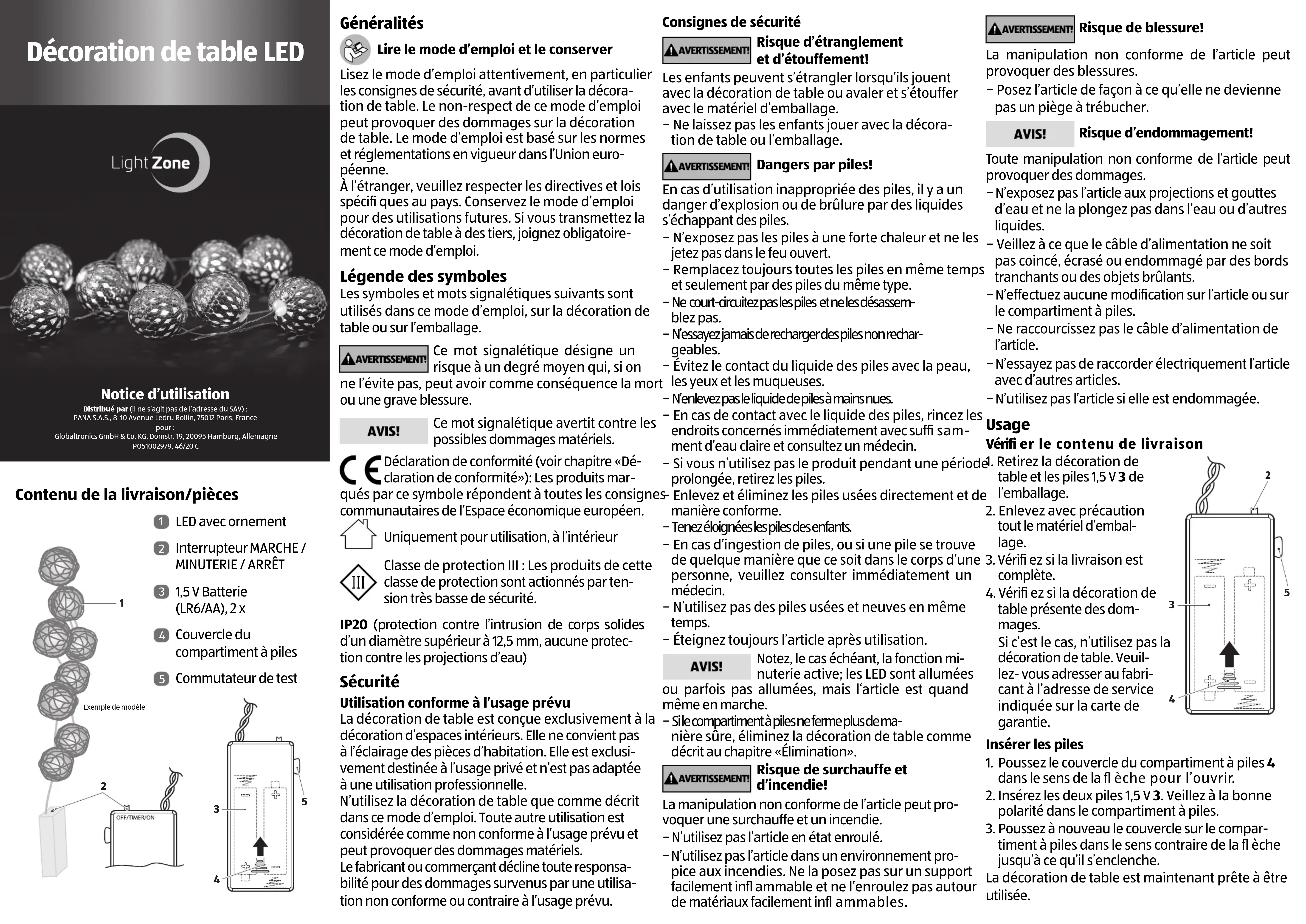 Commutateur de test Exemple de modèle Décoration de table LED Notice d’utilisation Distribué par (il ne s’agit pas de l’adresse du SAV) :PANA S.A.S., 8-10 Avenue Ledru Rollin, 75012 Paris, Francepour :Globaltronics GmbH & Co. KG, Domstr. 19, 20095 Hamburg, AllemagnePO51002979, 46/20 C