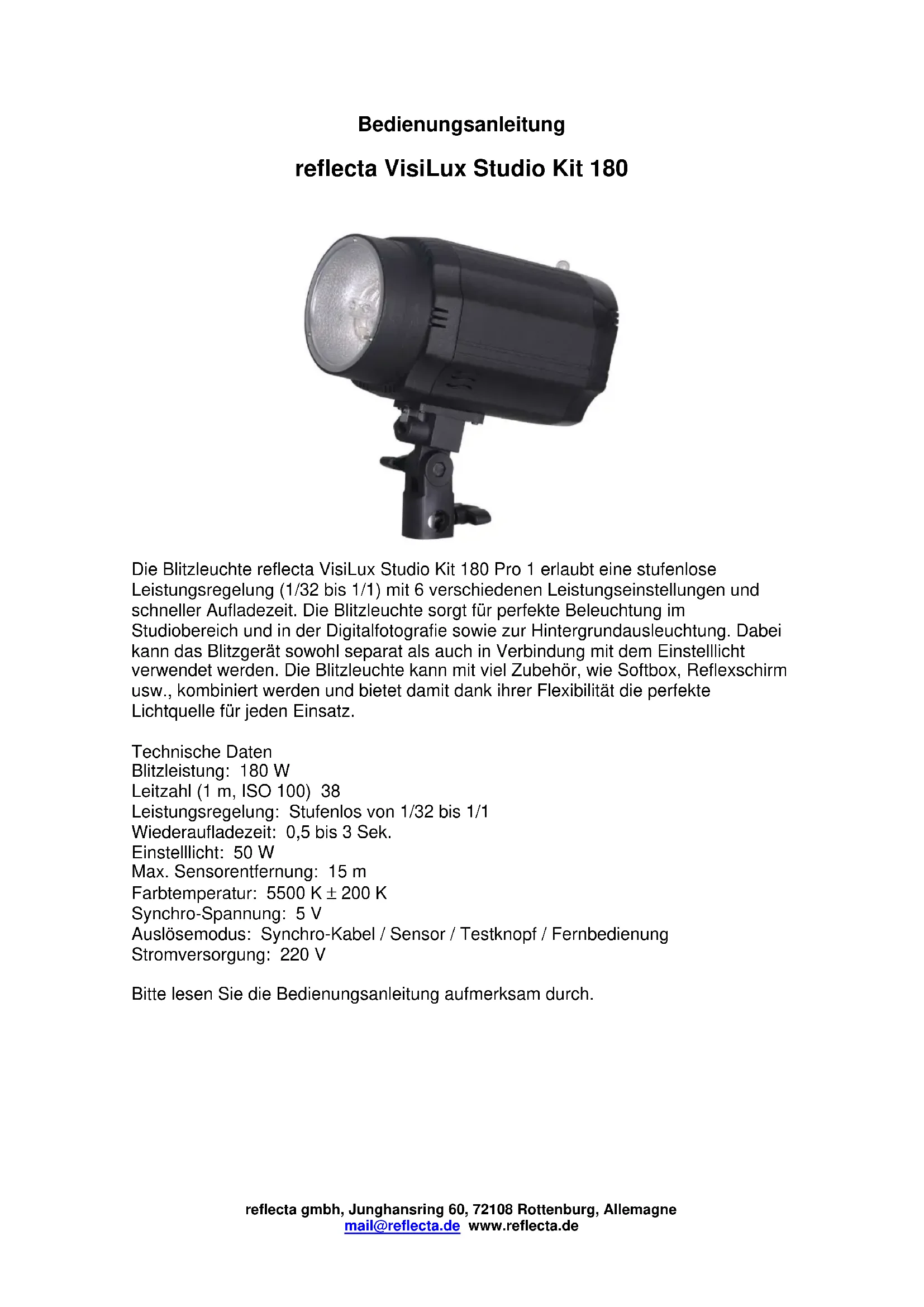 Visilux Studio Kit 180 - Flash Reflecta - Notice d'utilisation et mode d'emploi gratuit