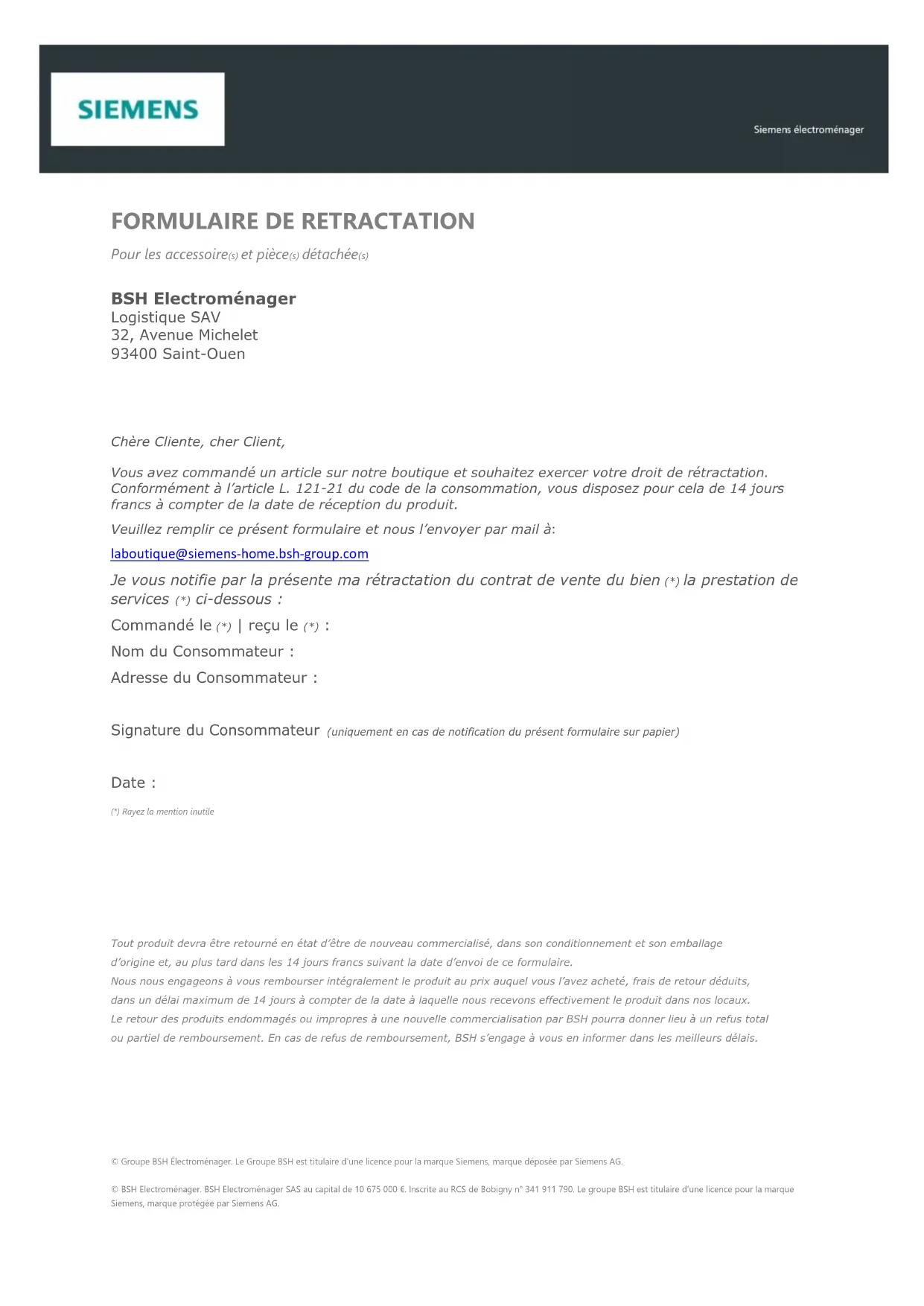 laboutique@siemens-home.bsh-group.com Je vous notifie par la présente ma rétractation du contrat de vente du bien (*) la prestation de services (*) ci-dessous : Commandé le (*) | reçu le (*) : Nom du Consommateur : Adresse du Consommateur : Signature du Consommateur (uniquement en cas de notification du présent formulaire sur papier) Date : (*) Rayez la mention inutile
