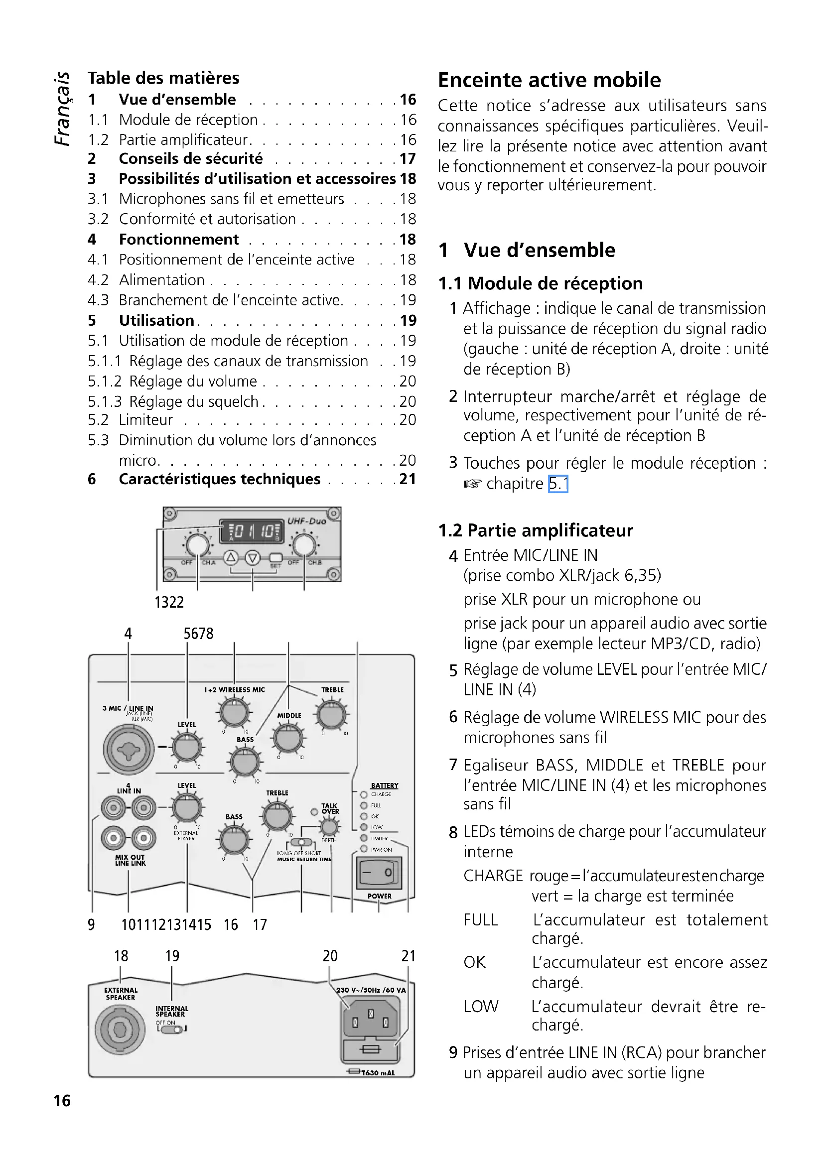 micro. . . . . . . . . . . . . . . . . . .20 6 Caractéristiques techniques . . . . . . 21 Enceinte active mobile Cette notice s’adresse aux utilisateurs sans connaissances spécifiques particulières. Veuil- lez lire la présente notice avec attention avant le fonctionnement et conservez-la pour pouvoir vous y reporter ultérieurement. 1 Vue d’ensemble
