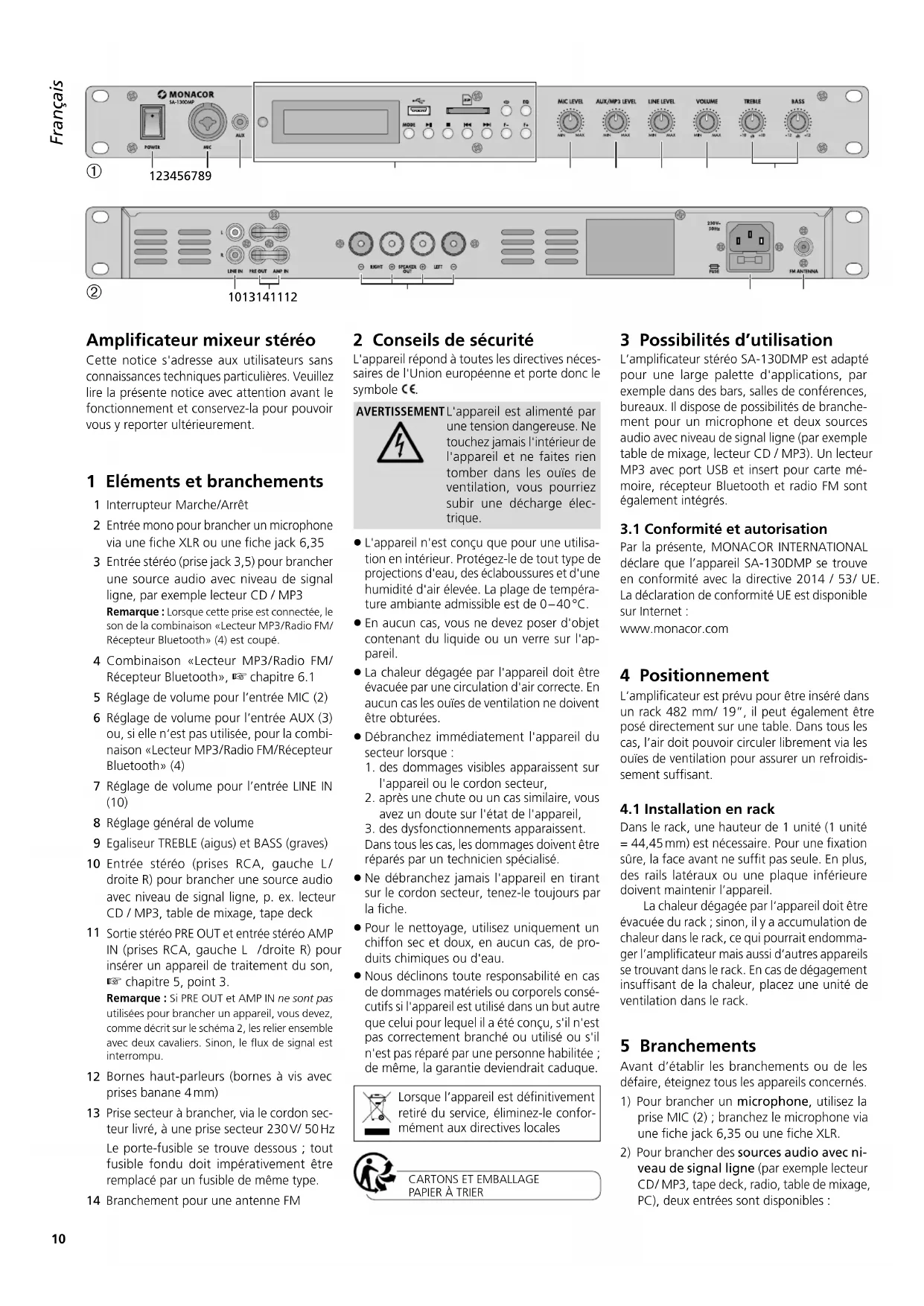 Par la présente, MONACOR INTERNATIONAL déclare que l’appareil SA-130DMP se trouve en conformité avec la directive 2014 / 53 / UE. La déclaration de conformité UE est disponible sur Internet :www.monacor.com 4 Positionnement L’amplificateur est prévu pour être inséré dans un rack 482 mm / 19”, il peut également être posé directement sur une table. Dans tous les cas, l’air doit pouvoir circuler librement via les ouïes de ventilation pour assurer un refroidis-sement suffisant.