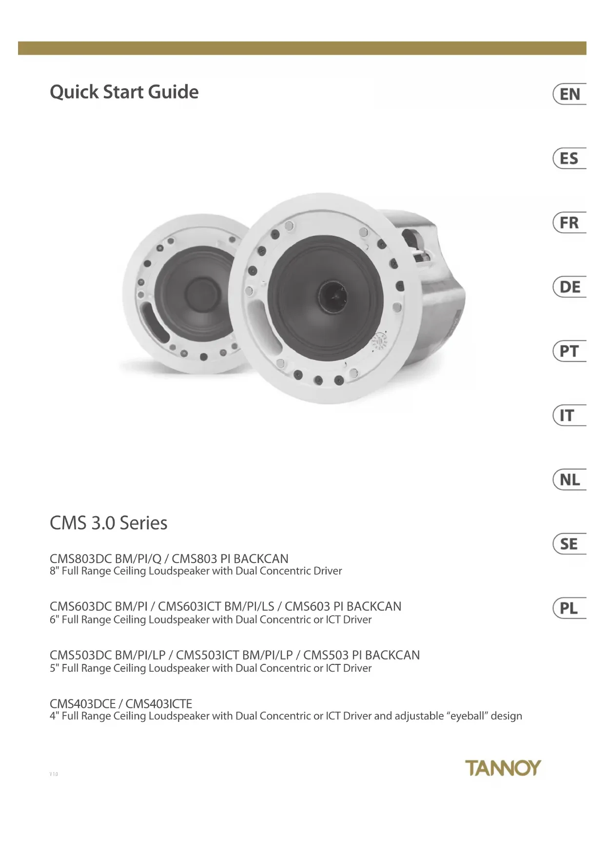 - Vuelva a adherir la tela de la rejilla a la rejilla en toda el área con un adhesivo en aerosol ligero para evitar resonancias audibles.28 CMS 3.0 Series Quick Start Guide 29 Identication des caractéristiques du produit REMARQUE IMPORTANTE: Les schémas de chaque enceinte ci-dessous sont génériques et s'appliquent aux types d'enceintes spécifiés. Certaines variations seront apparentes dans certains modèles, mais les différences ne sont pas critiques à des fins d'installation, sauf indication contraire. Monture aveugle Les modèles à montage en aveugle sont fournis avec un backcan pré-installé. Ci-dessus s'applique à tous les modèles ainsi qu'à tous les autres qui n'ont PAS de suxe «PI». Pré-installer Une unité de pré-installation (PI) est illustrée sans le backcan de pré-installation en option. Pré-installer le backcan Backcan de pré-installation (PI) en option pour les modèles PI. REMARQUE: Les modèles CMS 603DC / ICT PI et CMS 803DC ont le transformateur pré-attaché à l'intérieur du backcan. Le CMS 503DC / ICT PI a le transformateur pré- attaché à l'ensemble d'enceintes. Introduction Merci d'avoir acheté ce produit Tannoy Ceiling Monitor System. Conçue pour les programmes vocaux et musicaux, la gamme Tannoy CMS ore une qualité sonore exceptionnelle et une abilité à long terme dans toutes les applications de montage au plafond. La série CMS 3.0 DC comprend de nouveaux pilotes 16 ohms Dual Concentric pour des performances améliorées et une durée de vie prolongée. Déballage Chaque produit Tannoy est soigneusement inspecté avant expédition. Après le déballage, veuillez inspecter votre produit pour vous assurer qu'aucun dommage n'est survenu pendant le transport. Dans le cas improbable de dommages, veuillez en informer votre revendeur et conserver tout le matériel d'expédition car votre revendeur peut exiger un retour. Toutes les enceintes CMS sont expédiées par paires et sont fournies avec les accessoires suivants en standard: anneau en C, kit de pont de tuiles, gabarit de découpe et masque de peinture. Un anneau de plâtre (boue) est disponible en option. Avis de Sécurité Certains codes de construction régionaux exigent l'utilisation d'une méthode secondaire de xation des haut-parleurs au plafond pour assurer la sécurité d'un support de secours. Une ligne de support secondaire doit être xée entre la boucle de sécurité à l'arrière du produit et un point source au plafond. Pour les modèles PI, la ligne de support secondaire doit être xée de l'arrière du châssis du pilote à un point source au plafond. Veuillez consulter les codes de construction pertinents dans votre région. Lorsque vous utilisez un pilote d'alimentation pour installer le produit, il est essentiel d'utiliser les réglages de niveau de couple corrects pour éviter un serrage excessif et des dommages au matériau du plafond ou aux pinces. Couple de serrage recommandé: 1,5 Nm Tannoy ne sera pas tenu responsable des dommages causés par une mauvaise installation de ces enceintes. Le CMS 603 ICT LS est UL-1480, catégorie UUMW, pour une utilisation avec des systèmes supervisés non DC. Avis de sécurité électrique: Pour se conformer à la norme UL-1480, un conduit exible gainé de métal (BX) est nécessaire pour la connexion au bornier pour une mise à la terre correcte. An de se conformer aux réglementations UL, le backcan PI doit toujours être utilisé avec les modèles CMS PI. NOTE DE SÉCURITÉ: An de se conformer aux réglementations de sécurité incendie applicables (par exemple BS 5839: 1998), il est nécessaire qu'en cas d'incendie, la défaillance du circuit auquel le haut-parleur est connecté ne se produise pas avant que l'évacuation du bâtiment ne soit terminée. . Les mesures appropriées comprennent: - a) l'utilisation de borniers (pour le raccordement au primaire) avec un point de fusion d'au moins 650 ° C, par exemple en matériaux céramiques; b) utilisation de borniers d'un point de fusion inférieur mais protégés par une isolation thermique; c) utilisation de borniers tels que, lors de la fusion, il n'y ait pas de circuit ouvert ou de court-circuit.30 CMS 3.0 Series Quick Start Guide 31 Accessoires Accessoires Standards Accessoires Optionnels
