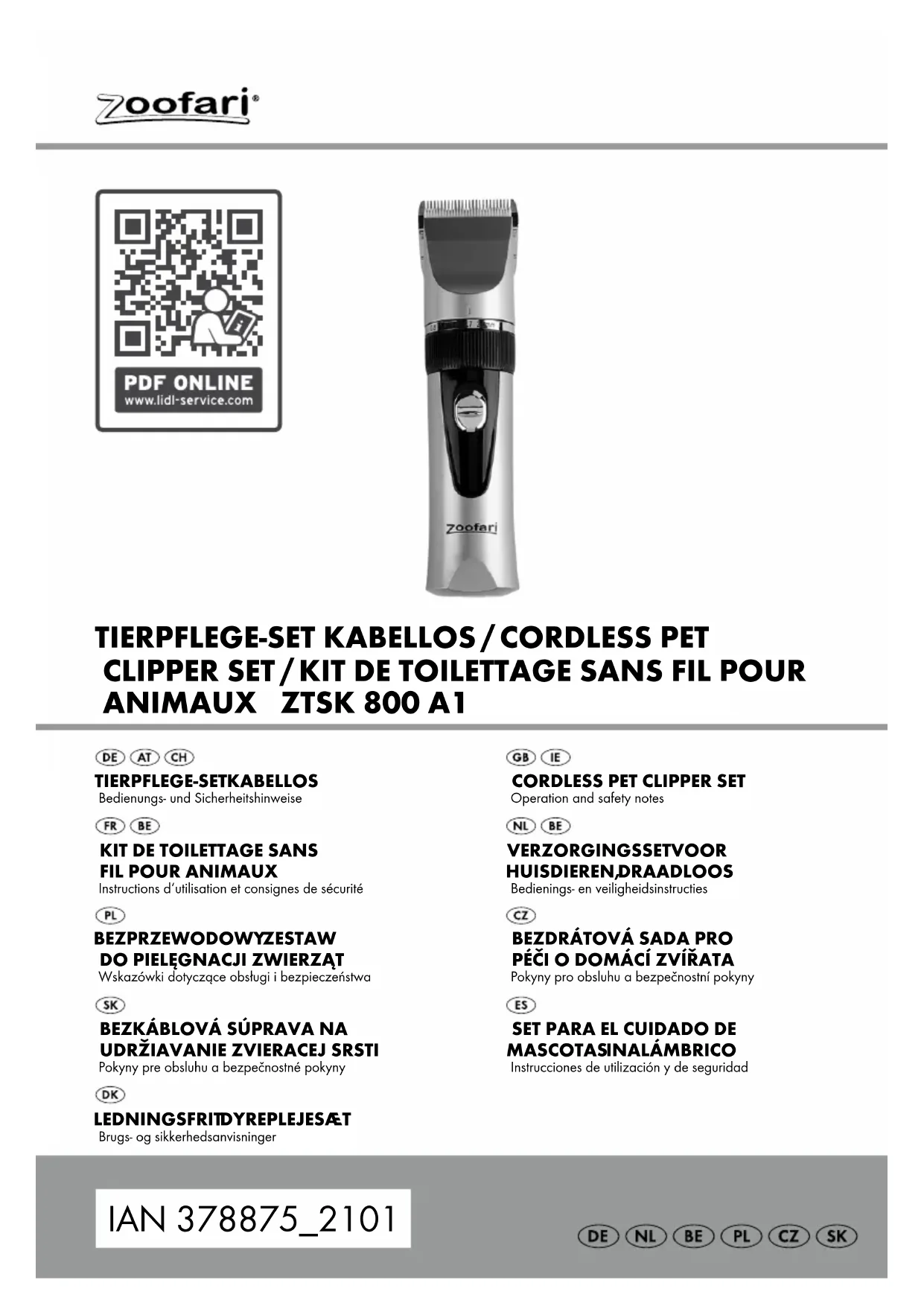 de caisse original. Il fera office de preuve d’achat. Si un problème matériel ou de fabrication devait survenir dans 3 ans suivant la date d‘achat de ce produit, nous assurons à notre discrétion la répara- tion ou le remplacement du produit sans frais sup- plémentaires. La garantie prend fin si le produit est endommagé suite à une utilisation inappropriée ou à un entretien défaillant. La garantie couvre les vices matériels et de fabrica- tion. Cette garantie ne s’étend ni aux pièces du produit soumises à une usure normale (p. ex. des piles) et qui, par conséquent, peuvent être considé- rées comme des pièces d’usure, ni aux dommages sur des composants fragiles, comme des interrupteu rs, des batteries ou des éléments fabriqués en verre. Faire valoir sa garantie Pour garantir la rapidité d’exécution de la procé- dure de garantie, veuillez respecter les indications suivantes : Veuillez conserver le ticket de caisse et la référence du produit (IAN 378875_2101) à titre de preuve d’achat pour toute demande. Le numéro de référence de l’article est indiqué sur la plaque d’identification, gravé sur la page de titre de votre manuel (en bas à gauche) ou sur un autocollant apposé sur la face arrière ou inférieure du produit. En cas de dysfonctionnement du produit, ou de tout autre défaut, contactez en premier lieu le ser- vice après-vente par téléphone ou par e-mail aux coordonnées indiquées ci-dessous. Vous pouvez alors envoyer franco de port tout pro- duit considéré comme défectueux au service clien- tèle indiqué, accompagné de la preuve d’achat (ticket de caisse) et d’une description écrite du dé- faut avec mention de sa date d’apparition. Service après-vente Service après-vente France Tél. : 0800904879 E-Mail : owim@lidl.fr Service après-vente Belgique Tél. : 080071011 Tél. : 80023970 (Luxembourg) E-Mail : owim@lidl.be41 NL/BE Legenda van de gebruikte pictogrammen ....................................................Pagina 42 Inleiding ......................................................................................................................................Pagina 42 Correct gebruik ..............................................................................................................................Pagina 42 Beschrijving van de onderdelen ....................................................................................................Pagina 42 Technische gegevens ..................................................................................................................... Pagina 43 Omvang van de levering ...............................................................................................................Pagina 43 Veiligheidsinstructies .......................................................................................................Pagina 43 Veiligheidsinstructies voor batterijen / accu‘s ............................................................................... Pagina 46 Voor de ingebruikname ................................................................................................ Pagina 47 Messen oliën ..................................................................................................................................Pagina 47 Batterij opladen ..............................................................................................................................Pagina 48 Bediening ...................................................................................................................................Pagina 48 Opzetkammen op het snijmes wisselen ........................................................................................Pagina 48 Scheerlengte instellen ....................................................................................................................Pagina 48 Vacht bijknippen / trimmen ............................................................................................................ Pagina 49 Vacht op de poten trimmen ........................................................................................................... Pagina 49 Reiniging en onderhoud ................................................................................................Pagina 50 Opslag ..........................................................................................................................................Pagina 50 Storingen oplossen ............................................................................................................ Pagina 50 Afvoer ........................................................................................................................................... Pagina 50 Garantie ...................................................................................................................................... Pagina 51 Afwikkeling in geval van garantie ................................................................................................Pagina 51 Service ............................................................................................................................................Pagina 5242 NL/BE Legenda van de gebruikte pictogrammen Neem de waarschuwingen en veiligheidsinstructies in acht! Bescherming tegen het binnendringen van vaste deeltjes (Ø > 12,5 mm). De CE-markering bevestigt de conformi- teit met de voor het product van toepas- sing zijnde EU-richtlijnen. Alleen gebruiken in gesloten ruimtes Gelijkstroom/-spanning Beschermingsklasse II Wisselstroom/-spanning Polariteit van de uitgangspool